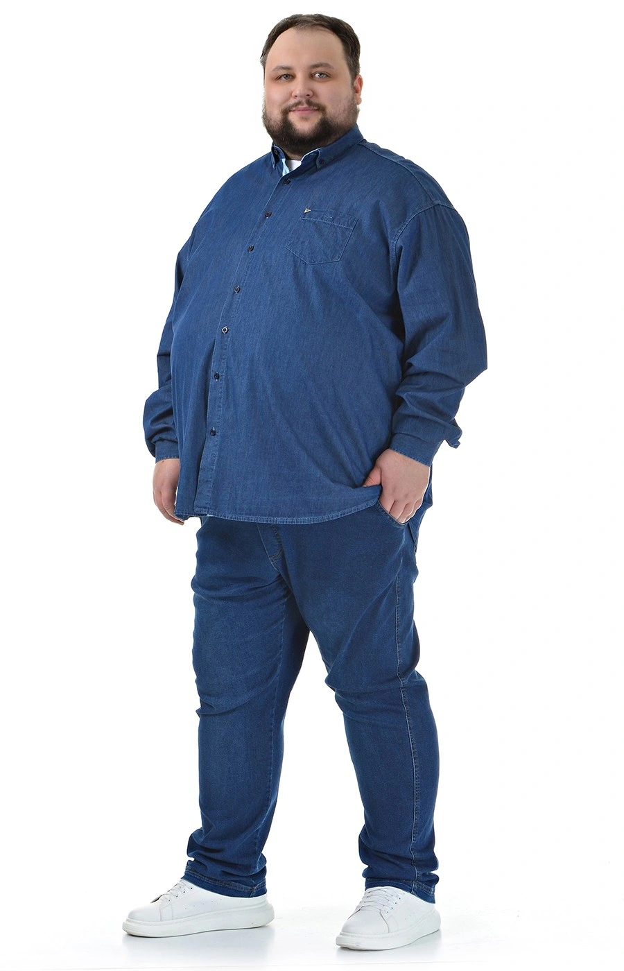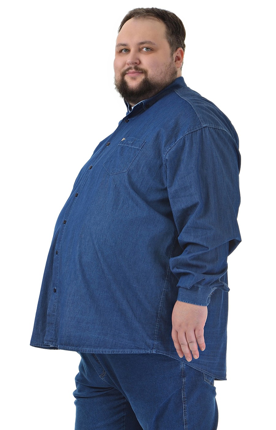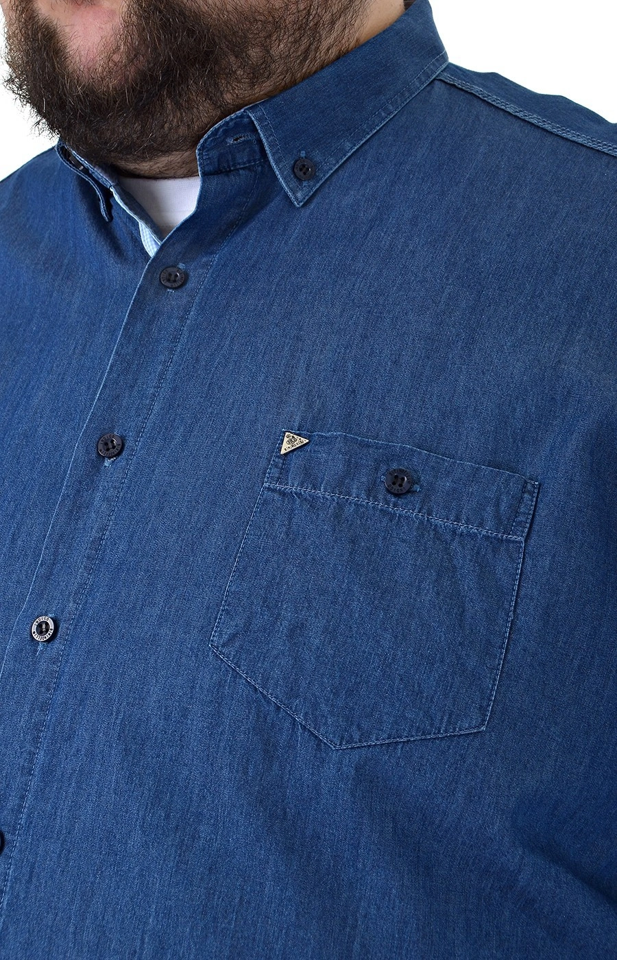 Стильная джинсовая рубашка с отделкой по планке светло голубым цветом. Один нагрудный карман. Застежка на пуговицы.