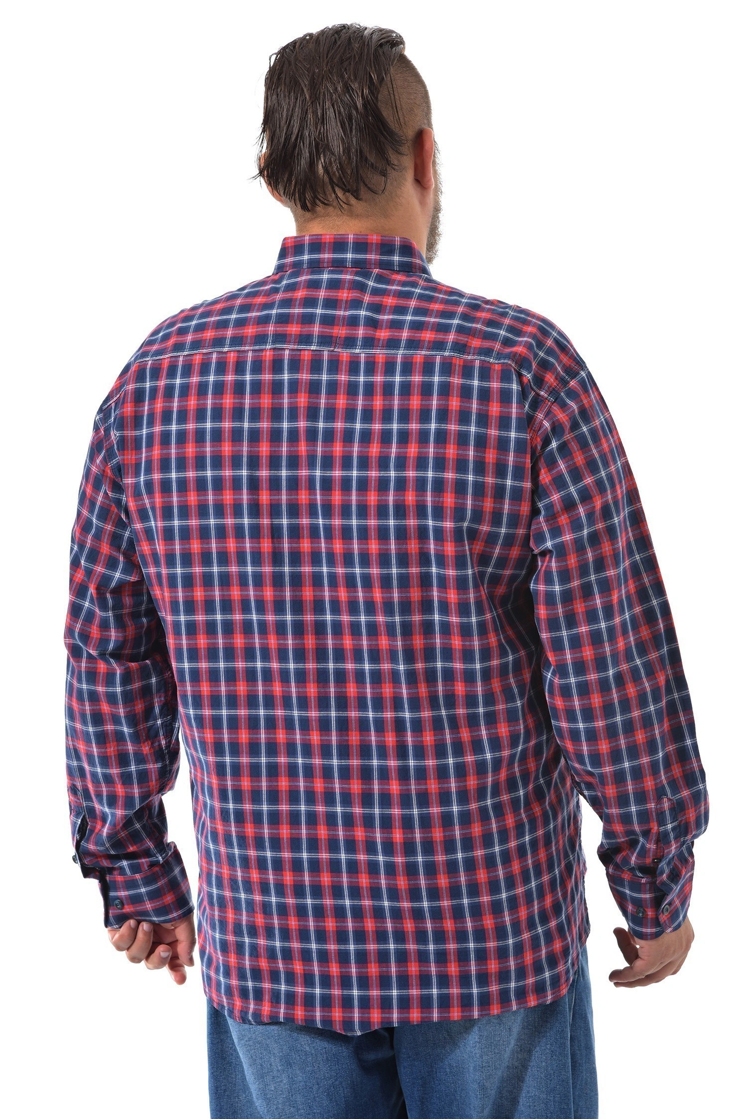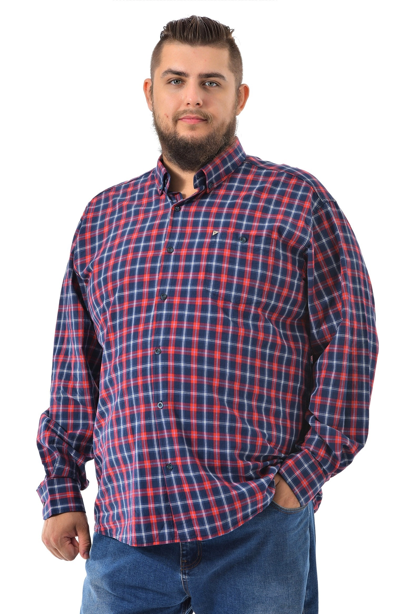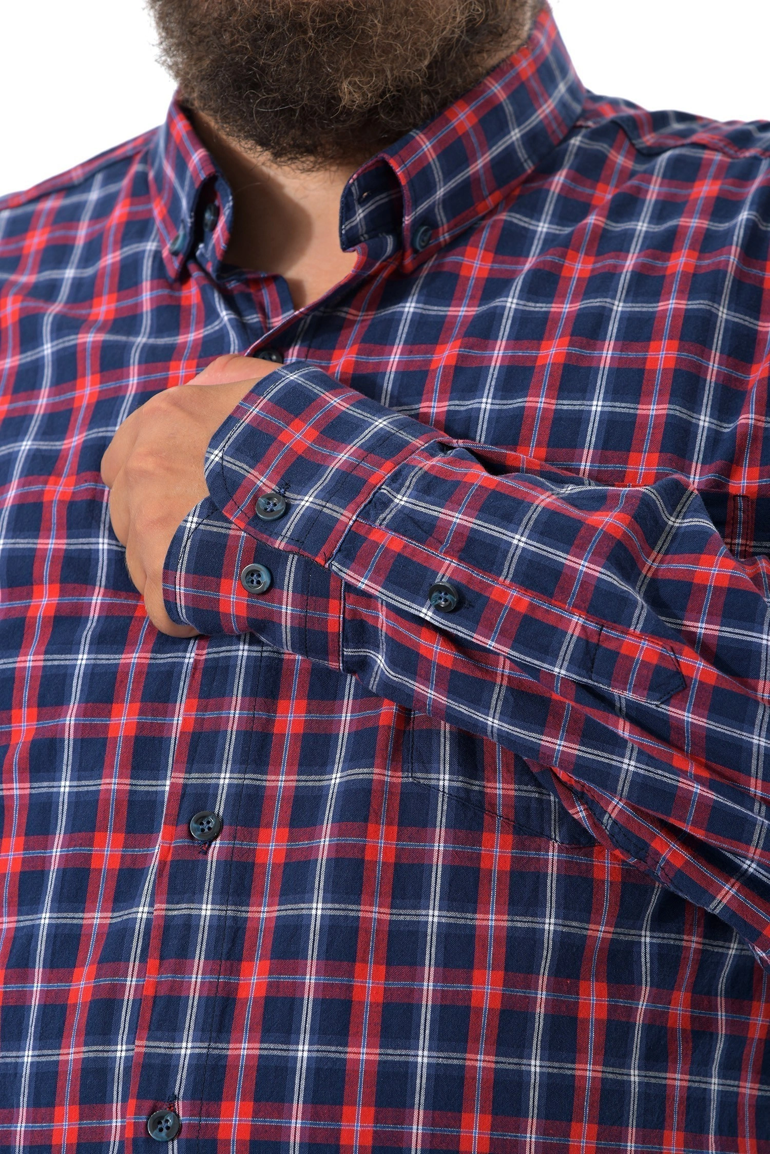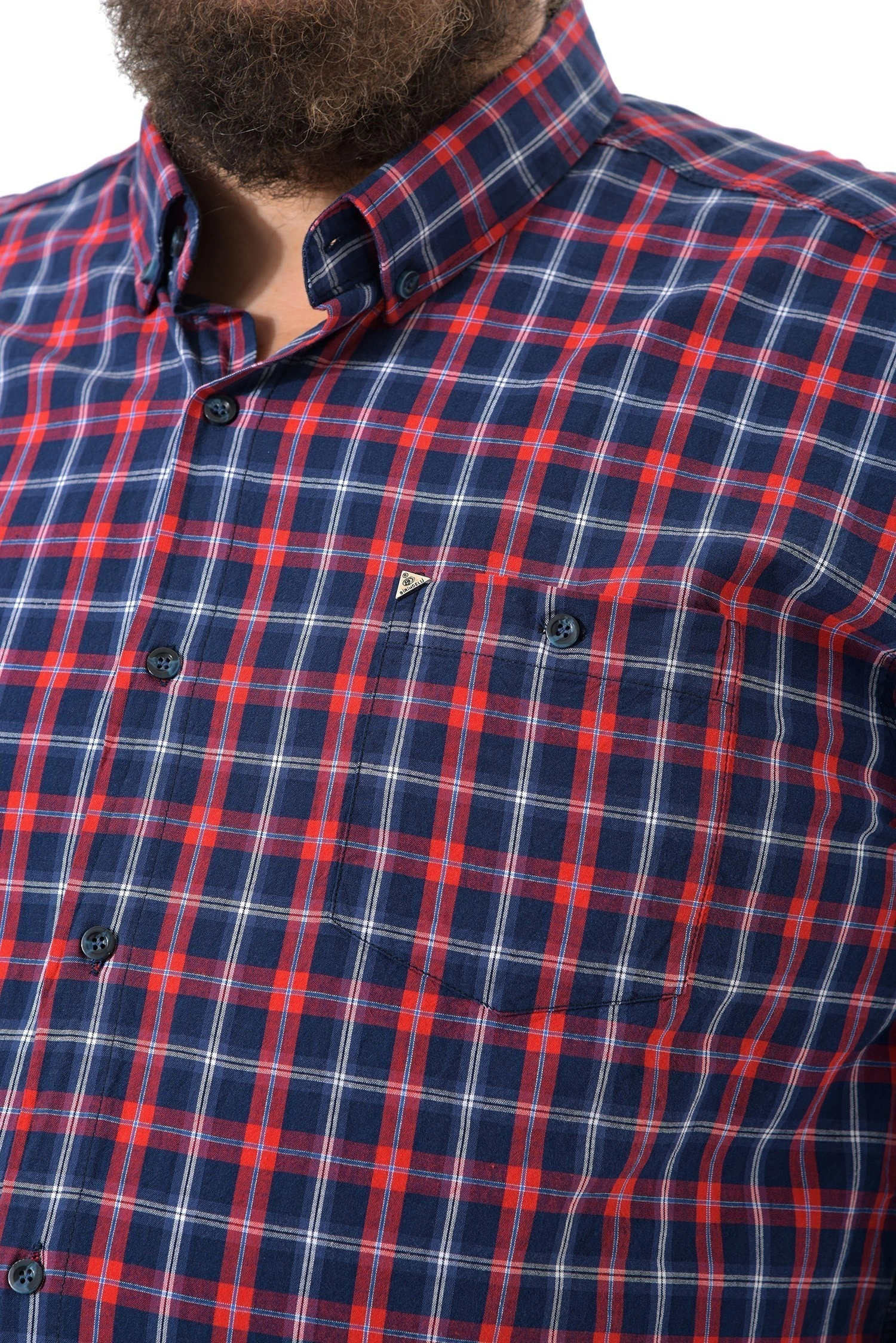 Хлопковая рубашка от турецкого бренда Birindelli - это качественный крой и натуральные материалы. Цвет изделия темно синий в красную клетку. Длинный рукав с манжетами на пуговицах. На груди накладной карман на пуговице. На рубашке отложной воротничок. Центральная застёжка на пуговицы. Материал рубашки мягкий, тактильно приятный и комфортный к телу 100% хлопок