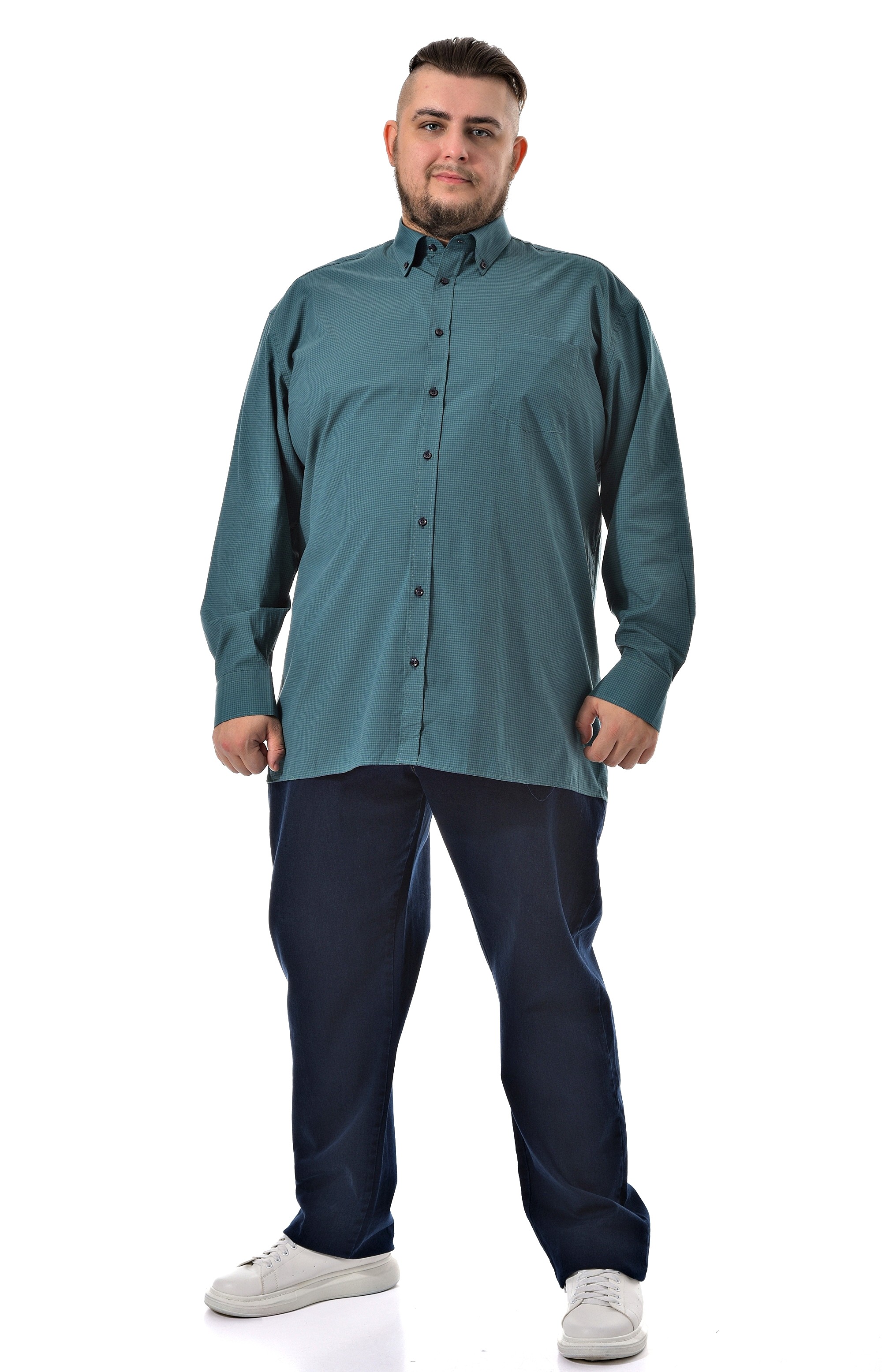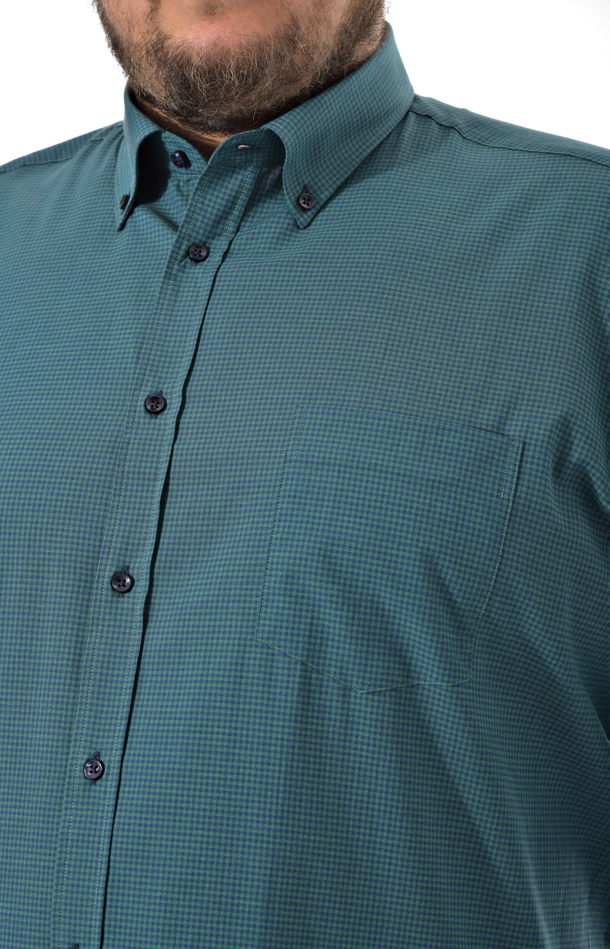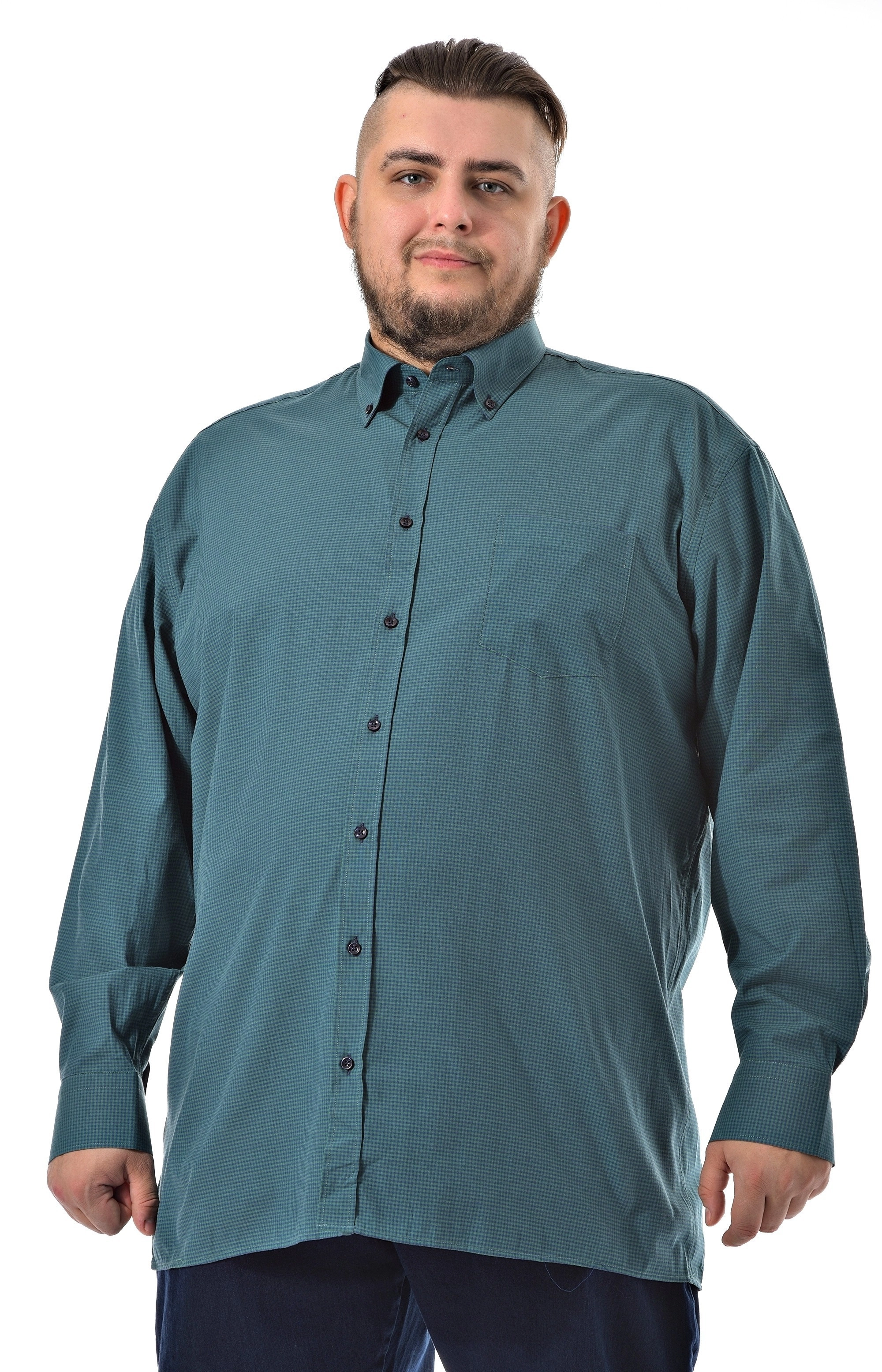 Мужская рубашка c длинным рукавом Pierre Lauren темно бирюзового цвета в мелкую синюю клетку. Манжеты под пуговицу, один накладной карман на груди Полноразмерная модель на высокий рост. Воротник классический острый на одну пуговицу.