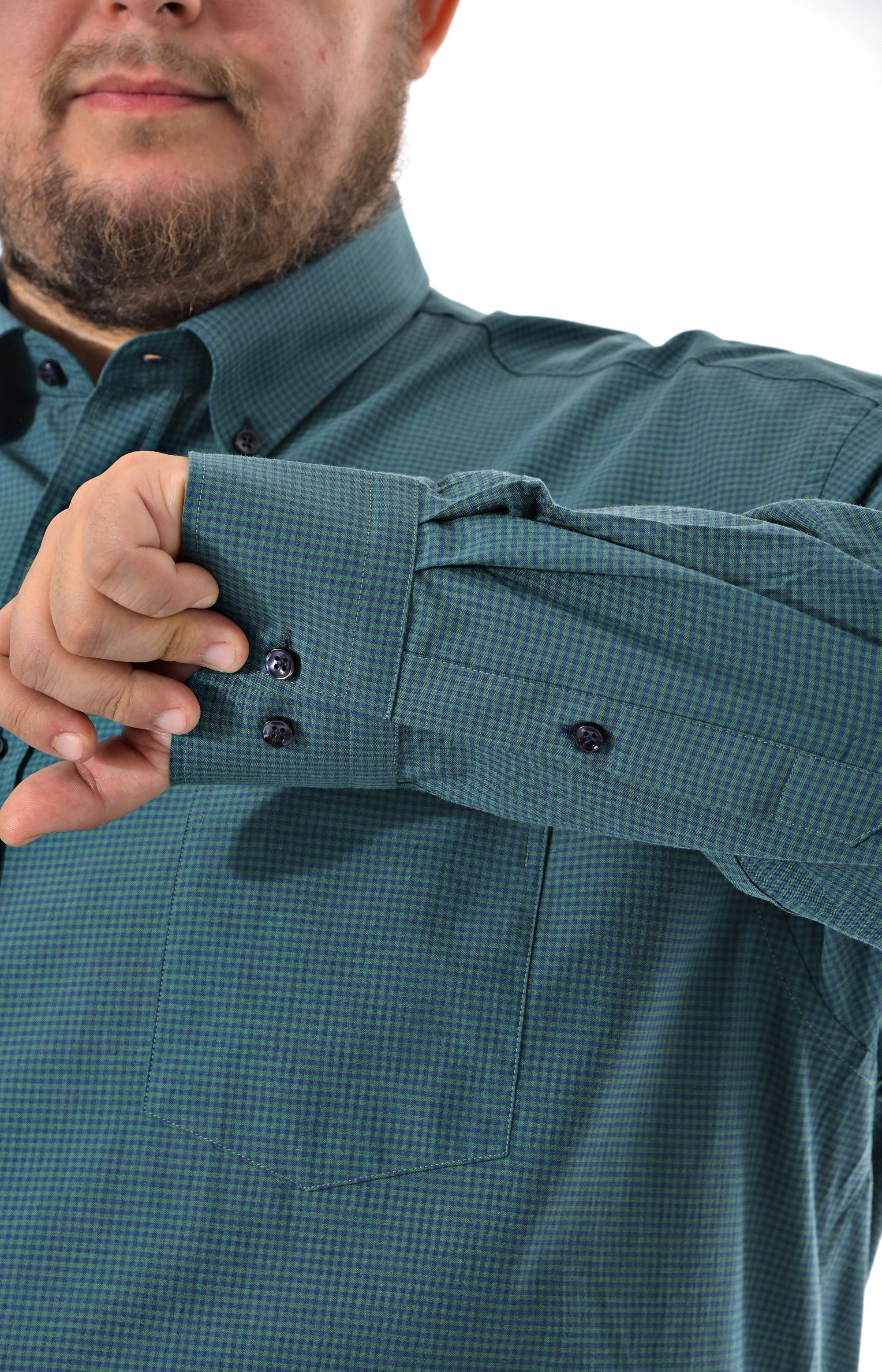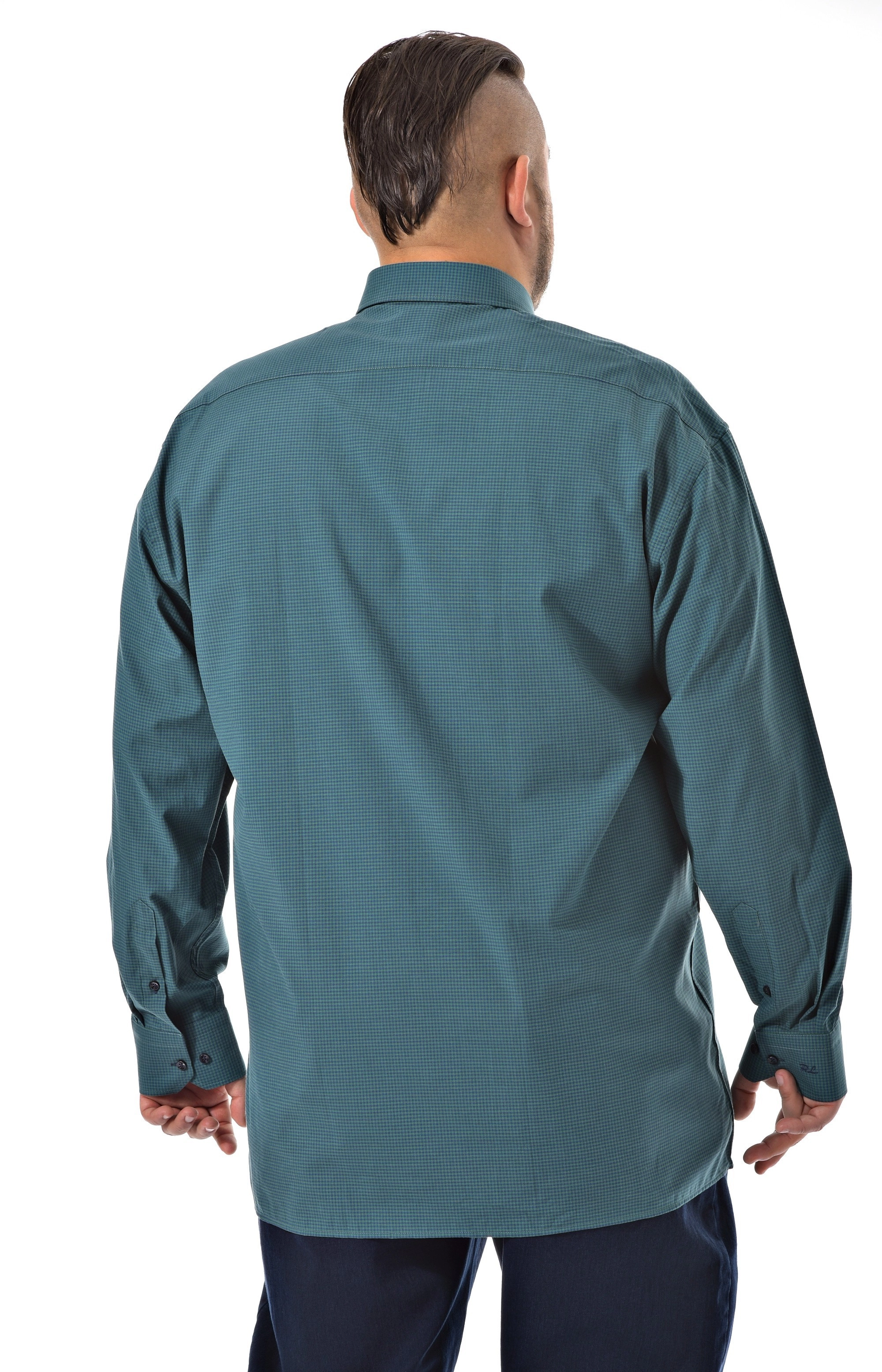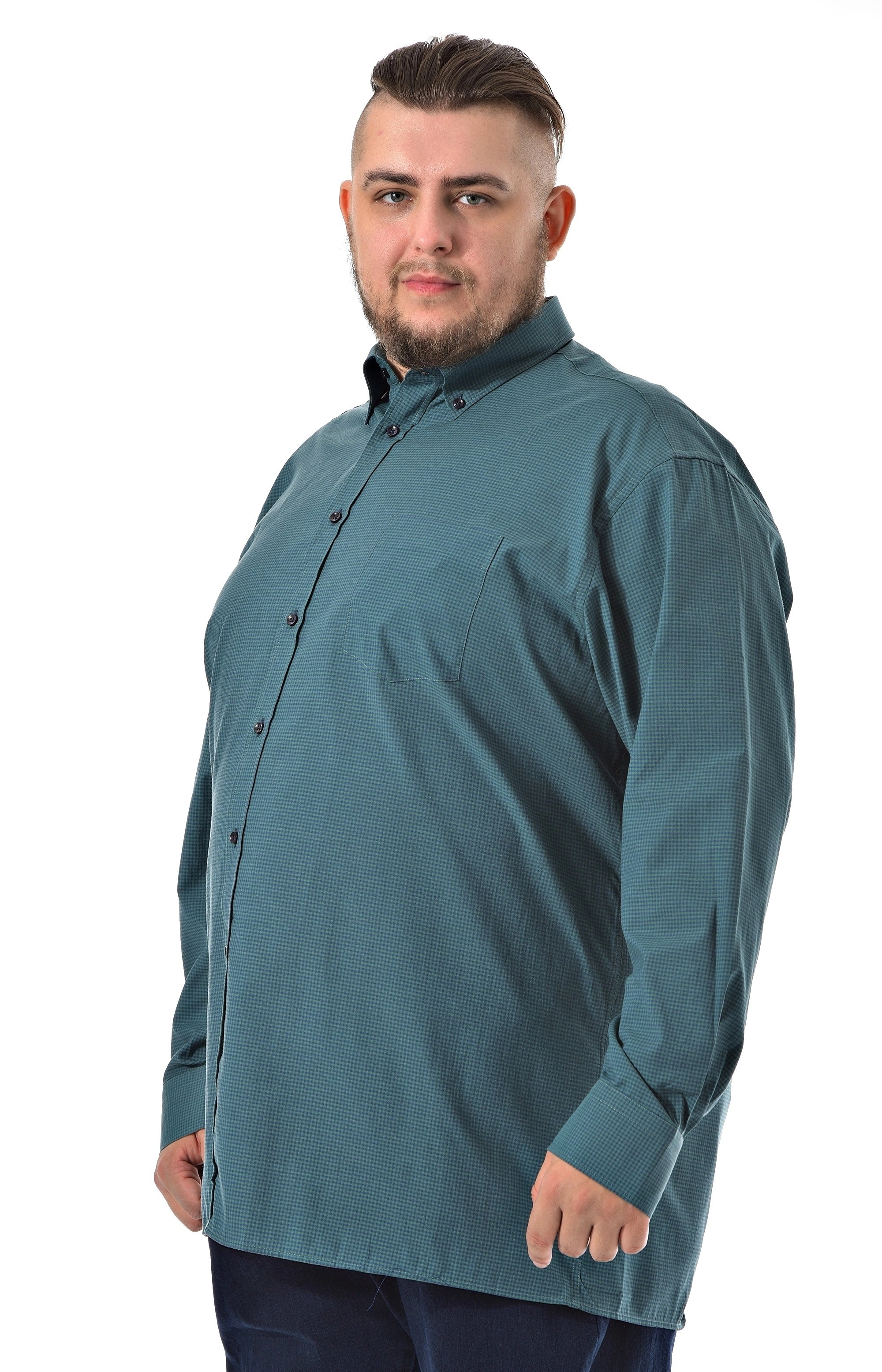 Мужская рубашка c длинным рукавом Pierre Lauren темно бирюзового цвета в мелкую синюю клетку. Манжеты под пуговицу, один накладной карман на груди Полноразмерная модель на высокий рост. Воротник классический острый на одну пуговицу.
