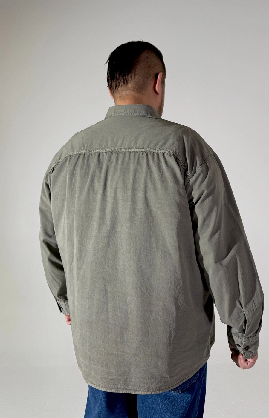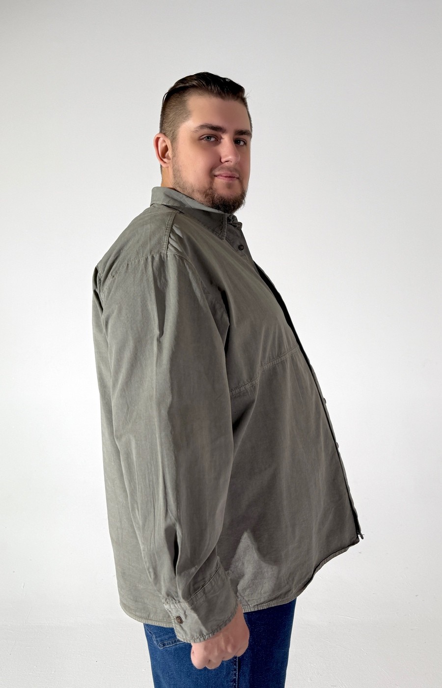 Мужская рубашка прямого кроя бежевого цвета из плотной габардиновой ткани. Длинный рукав, центральная застёжка на пуговицах, на груди два накладных кармана. Актуальна как базовая модель в повседневной носке как рубашка, так и в качестве лёгкой ветровки.