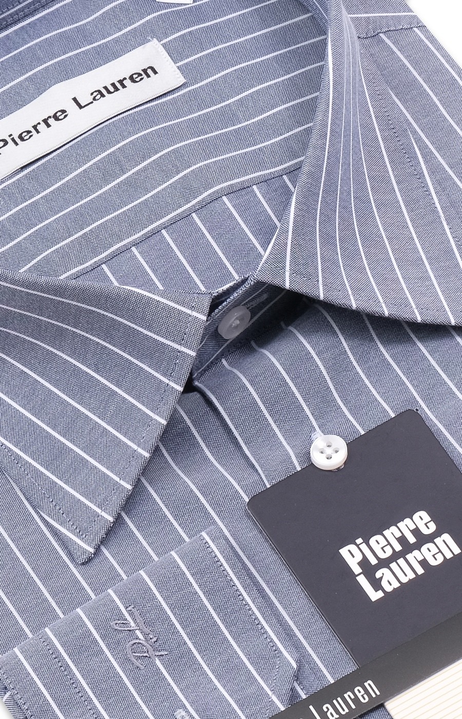 Мужская рубашка серого цвета в полоску с прямым силуэтом и комфортной посадкой по кадру рассчитана на повседневные образы и аккуратный внешний вид. Вертикальная тонкая белая полоска по всей длине создает спокойный деловой ритм и легко вписывается и в офисный, и в городской гардероб. Рубашка с длинным рукавом на классических пуговицах, с аккуратным отложным воротником и строгой планкой застёжки спереди; манжеты фиксируются пуговицами и поддерживают собранный образ. На груди и манжете виден неброский логотип Pierre Lauren, который подчёркивает лаконичный дизайн и практичный характер модели. Рубашка хорошо смотрится в заправленном варианте с классическими брюками или джинсами, уместна для офиса, встреч и повседневных выходов.