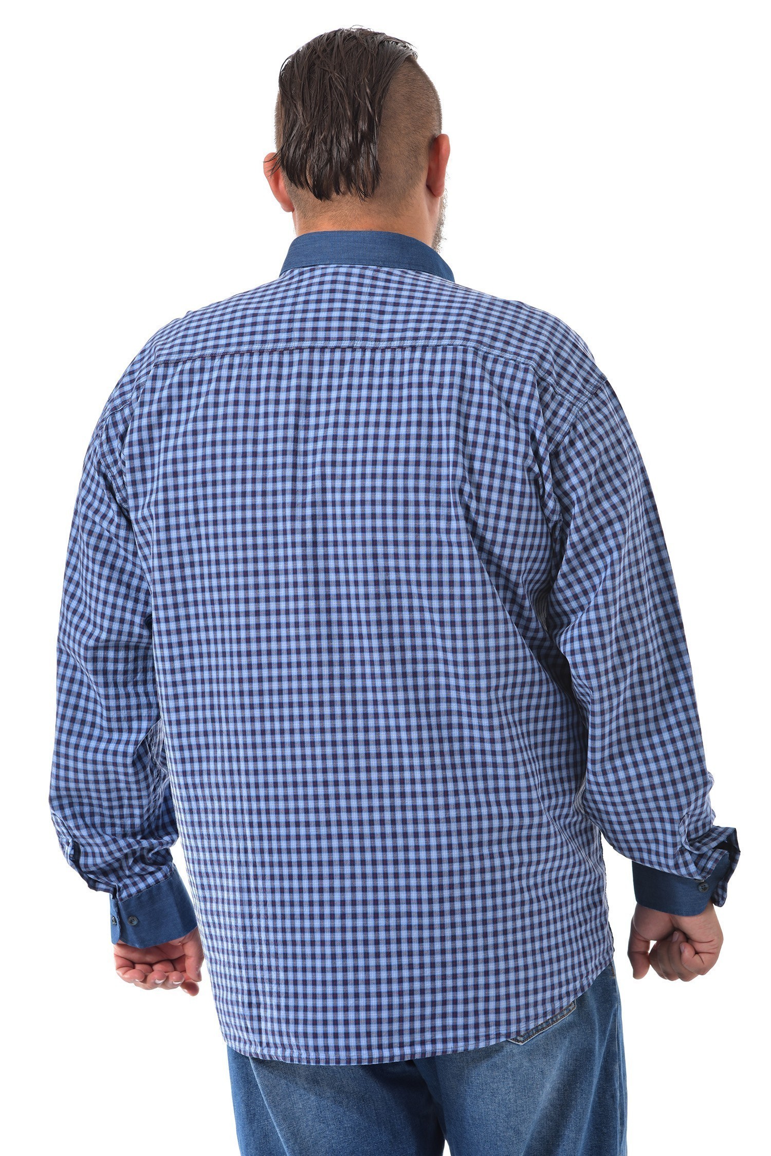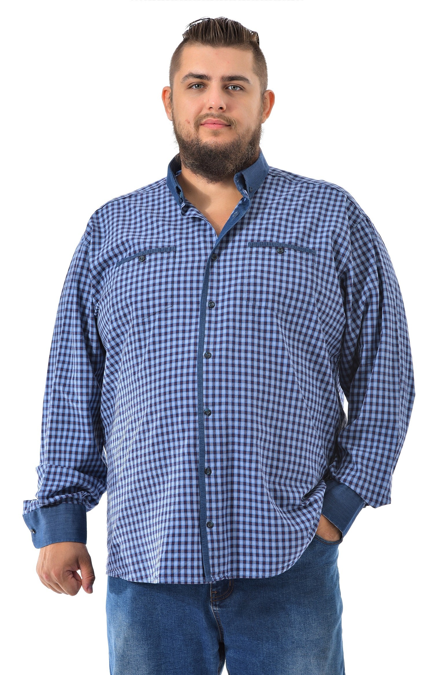 Клетчатая мужская рубашка с джинсовой отделкой. Два прорезных кармана на груди с фиксацией на пуговицу. Полноразмерная модель.