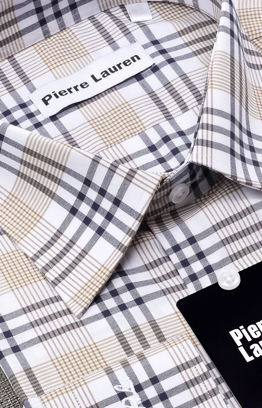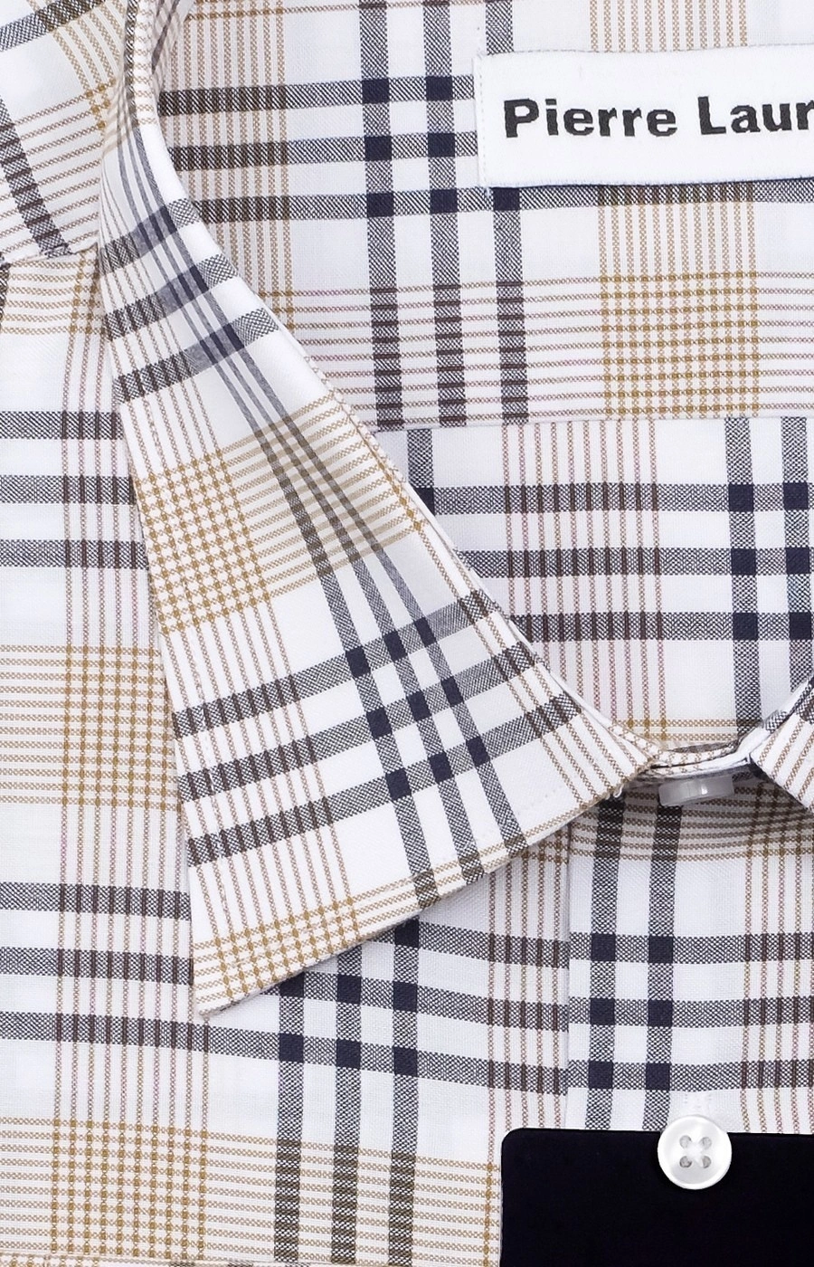 Мужская рубашка c длинным рукавом Pierre Lauren в бежево-серую клетку. Манжеты под пуговицу, один накладной карман на груди Полноразмерная модель на высокий рост. Воротник классический острый на одну пуговицу.