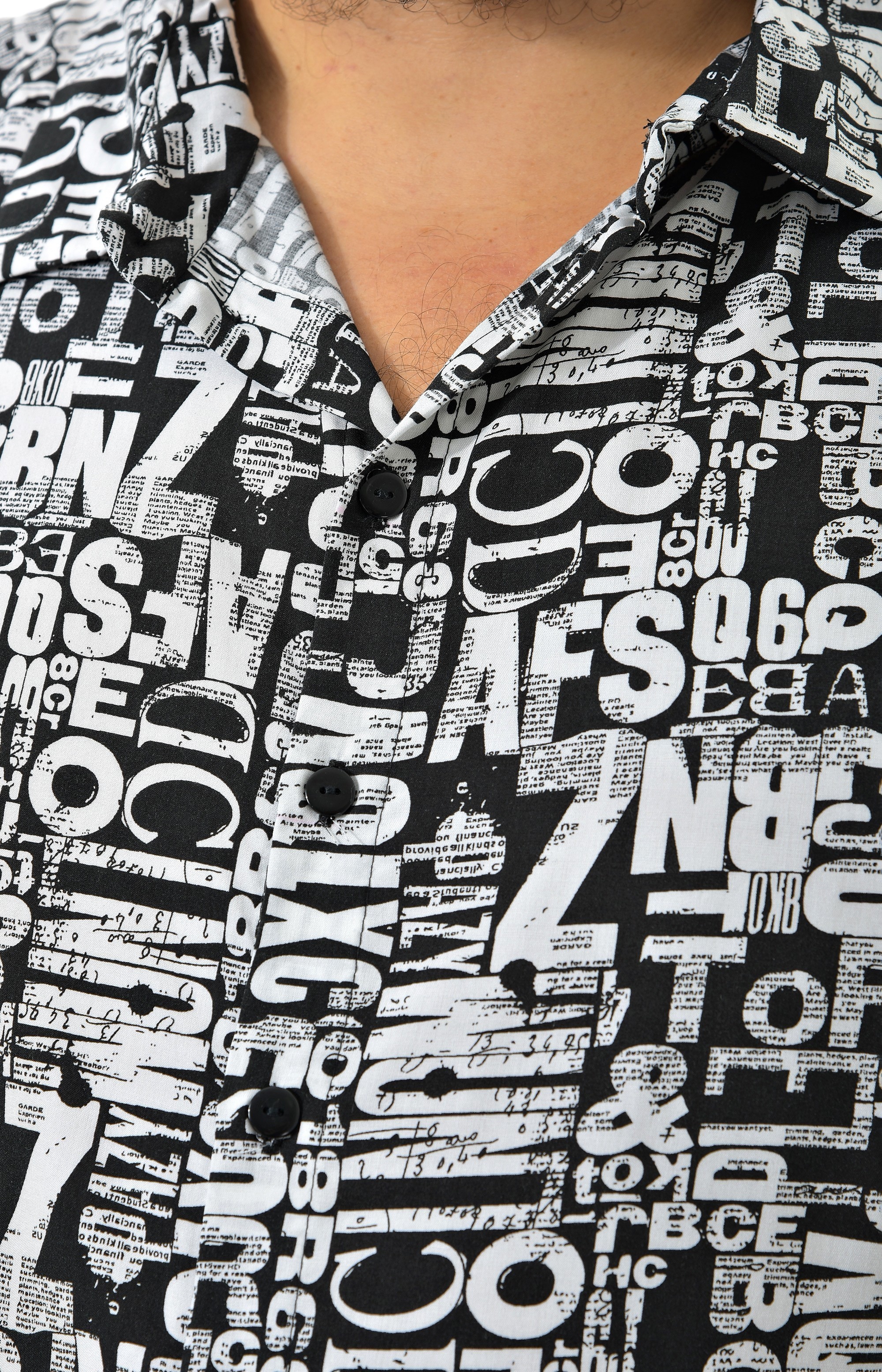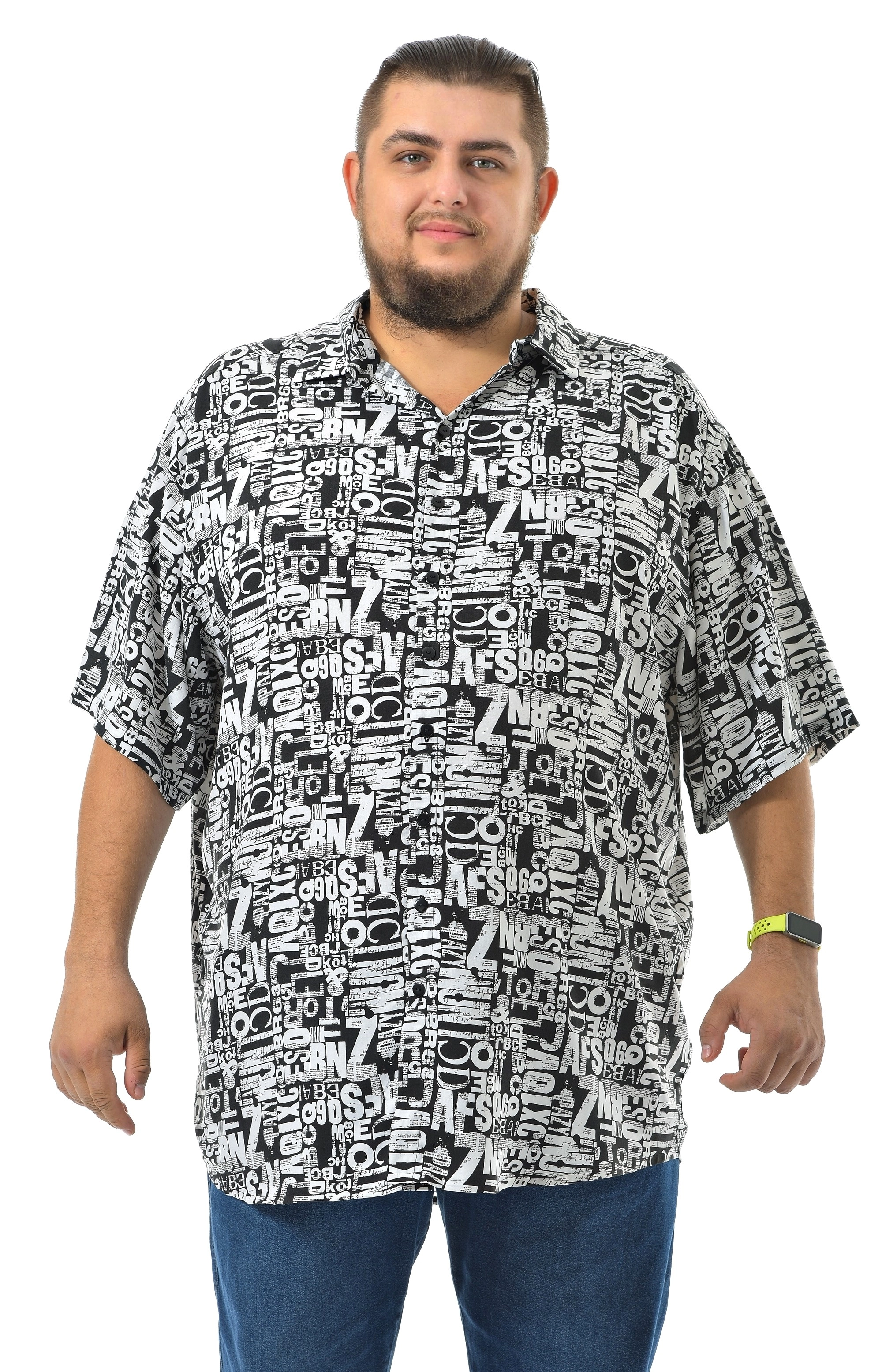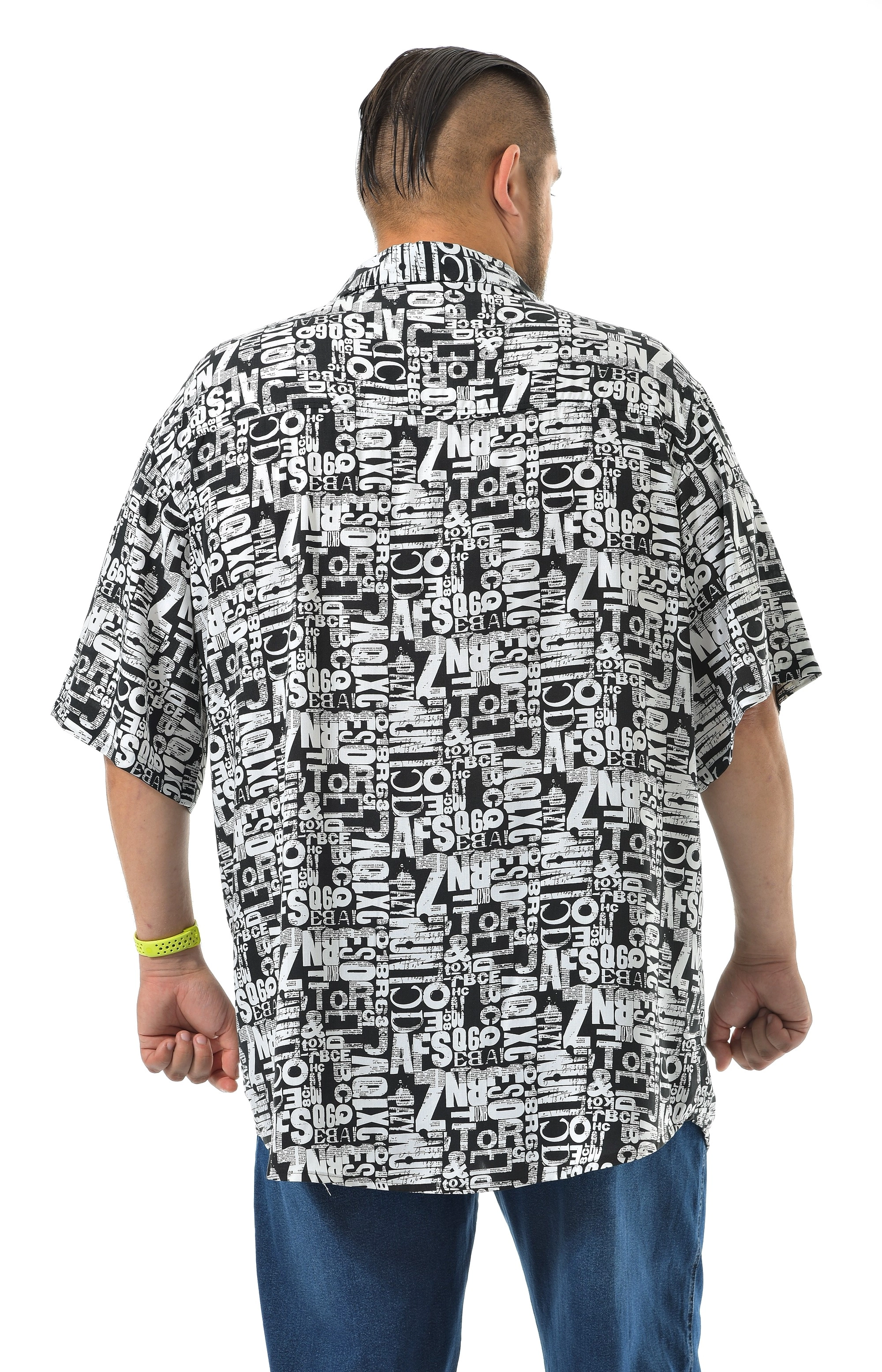 Мужская рубашка из штапеля по типу "гавайка". Черный основной фон с буквенным принтом. Застежка на пуговицы