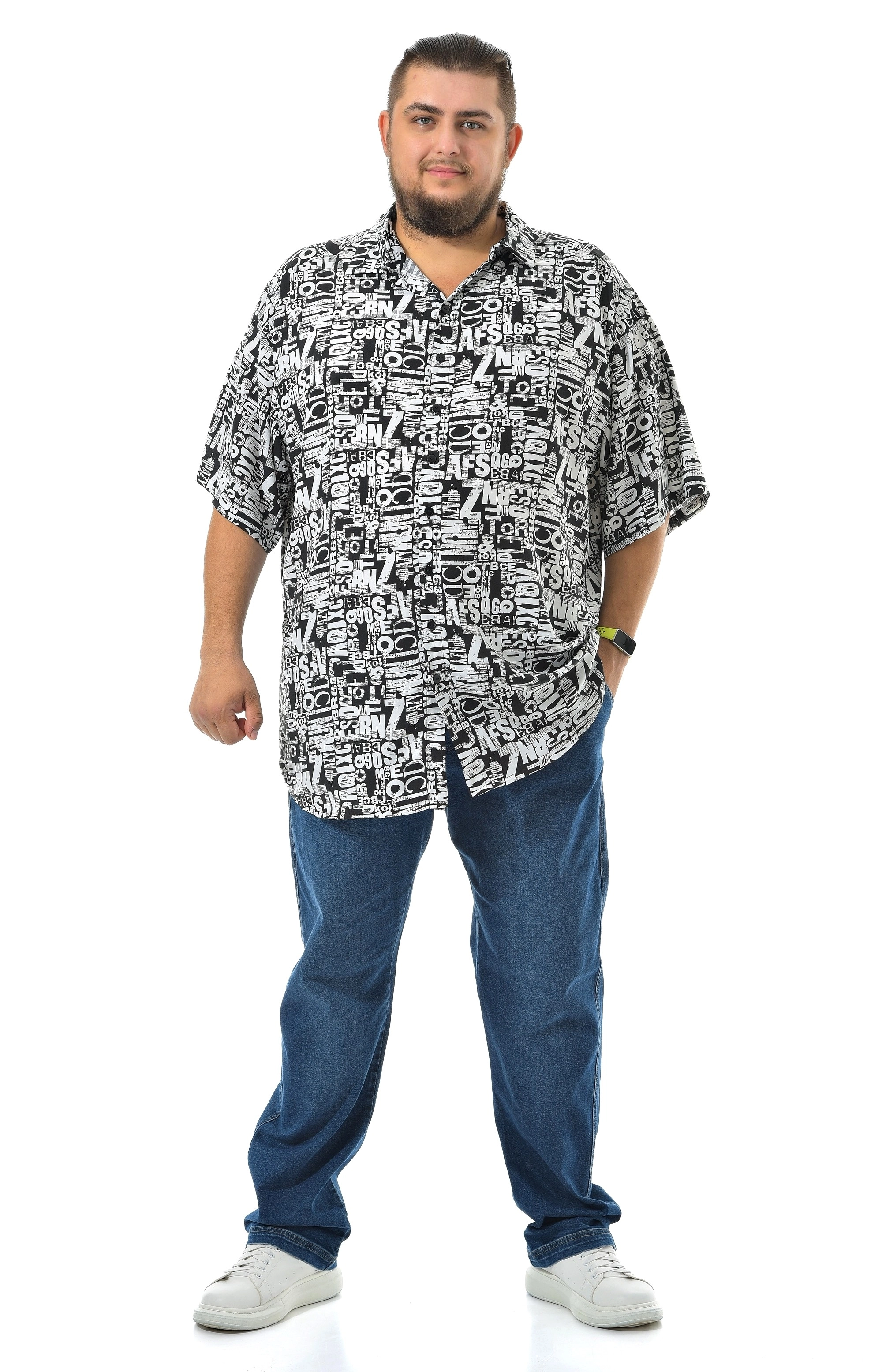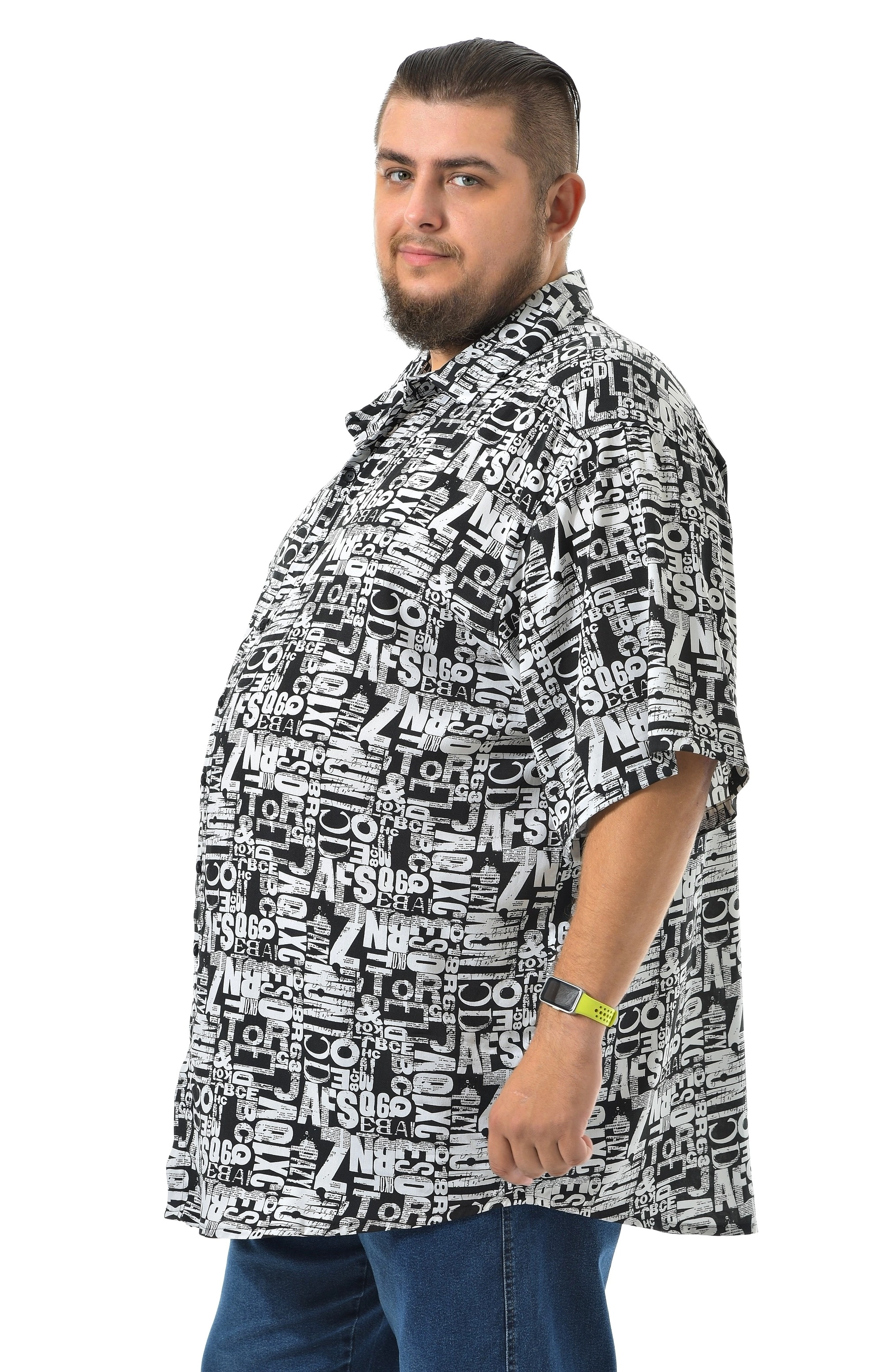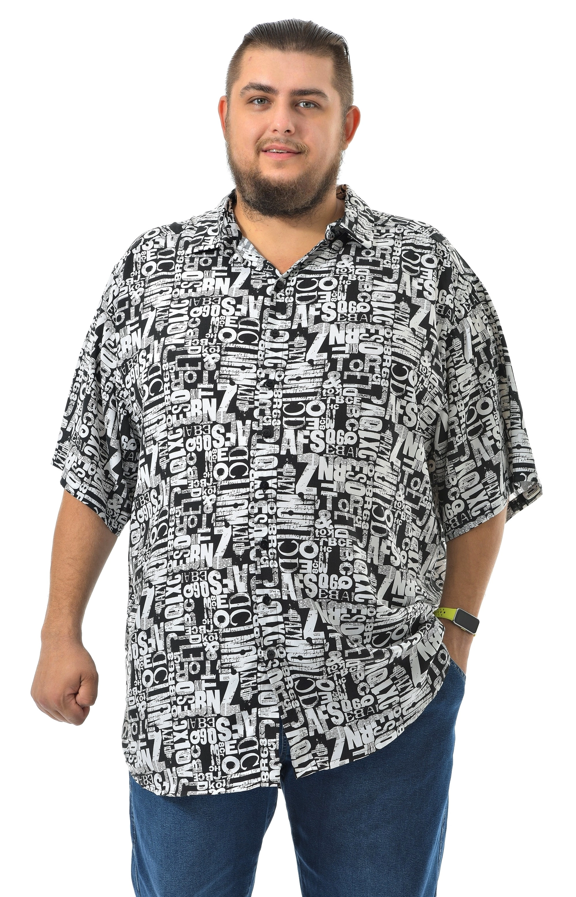 Мужская рубашка из штапеля по типу "гавайка". Черный основной фон с буквенным принтом. Застежка на пуговицы