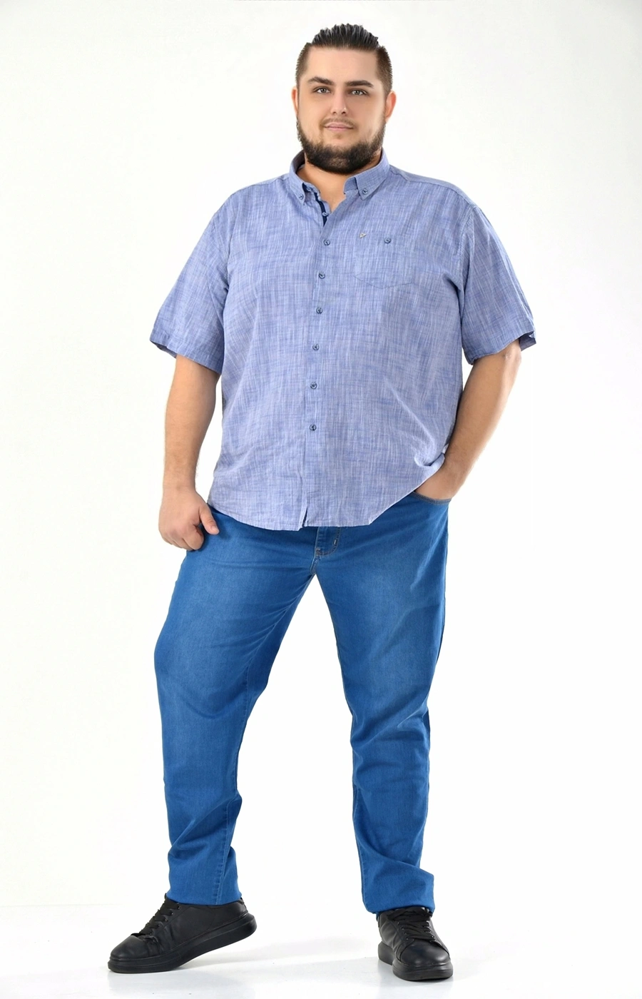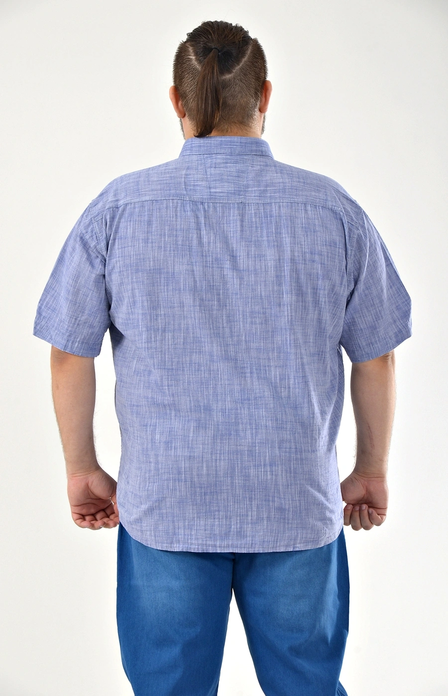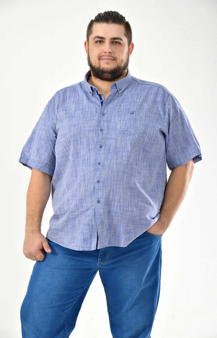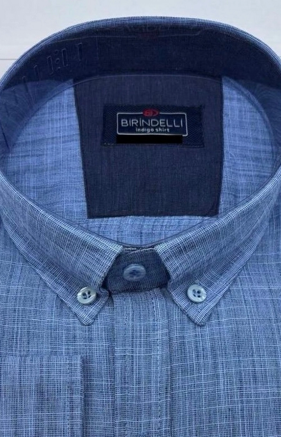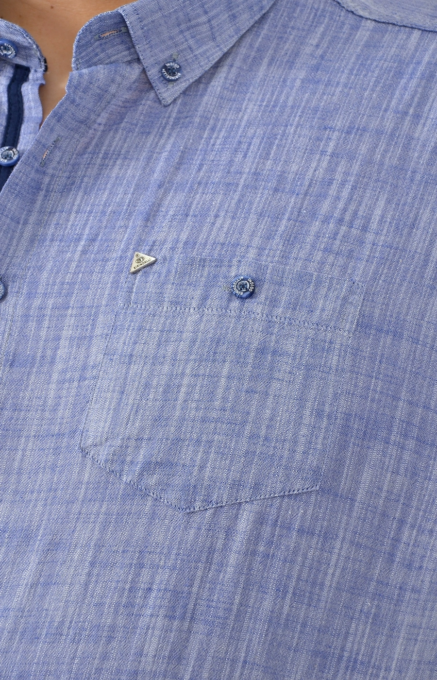 Синяя льняная рубашка с коротким рукавом. Один карман на груди. Воротник фиксирован пуговицами.