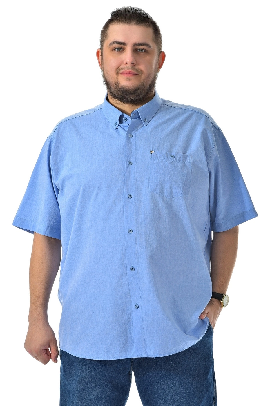 Голубая рубашка Birindelli с коротким рукавом выполнена из 100% хлопка. Натуральная ткань дарит комфорт и воздухопроницаемость, сохраняя аккуратный внешний вид даже при ежедневной носке. Прямой крой и свободная посадка делают модель универсальной для повседневных образов и стиля smart-casual. Классический воротник фиксируется пуговицами, на груди удобный карман. Такая рубашка отлично сочетается с брюками или джинсами. Доступен размер 03XL на талию 136 см. В каталоге «Большие люди» большой выбор хлопковых рубашек. Купить мужскую рубашку большого размера можно у нас.