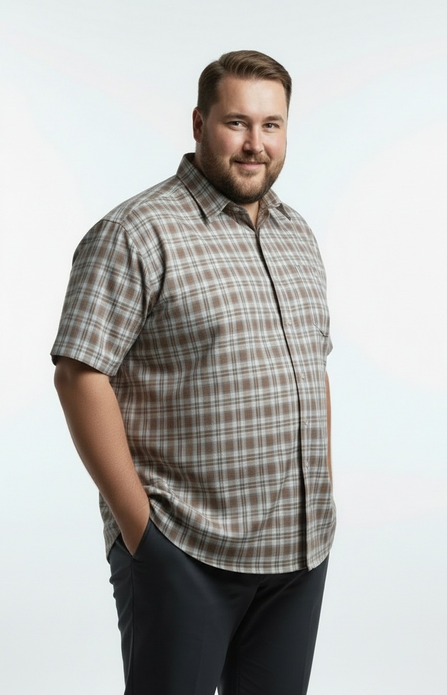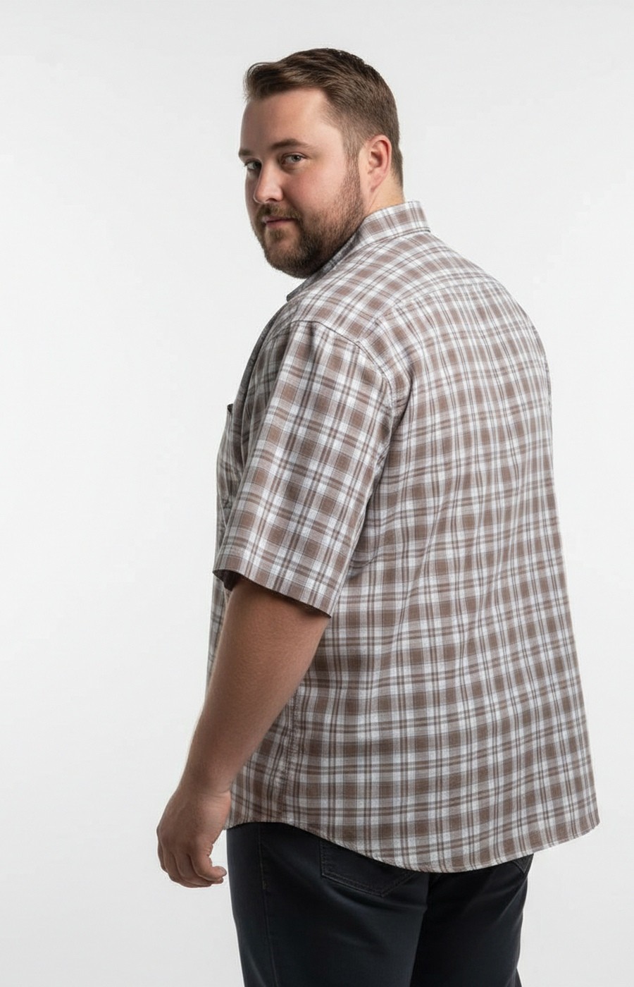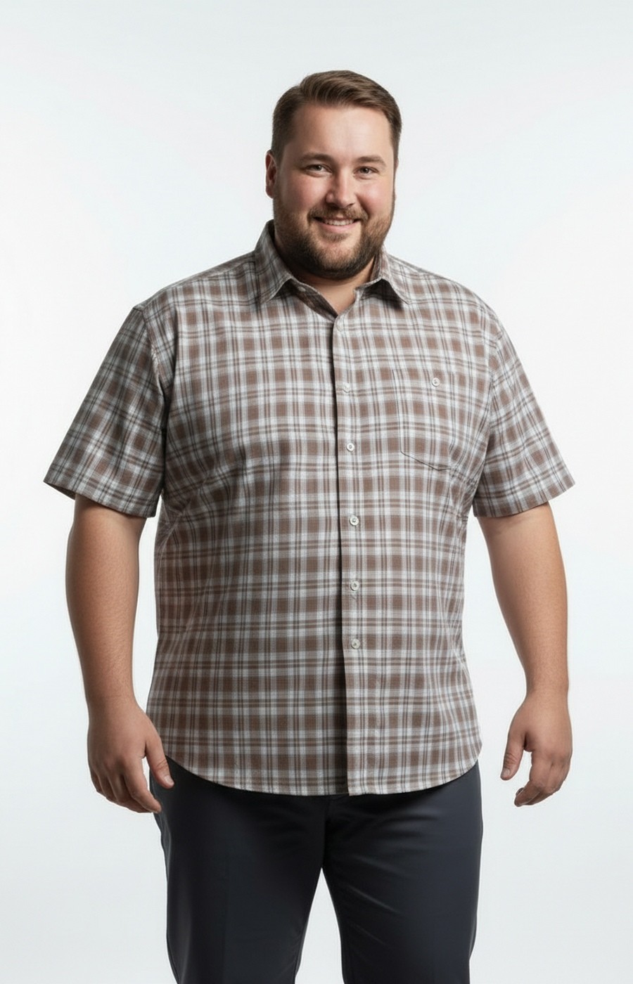 Мужская рубашка в клетку больших размеров с коротким рукавом изготовлена из лёгкой ткани с приятной к телу фактурой. Классический прямой крой обеспечивает свободную посадку и не стесняет движений, что важно для комфорта в повседневной носке. Рубашка застёгивается на пуговицы по всей длине планки, имеет отложной воротник и левый нагрудный карман. Клетчатый принт в бежево-коричнево-белой гамме делает модель универсальной для сочетаний с тёмными брюками и джинсами. Подходит для городских образов, неформальных встреч и летнего отдыха. Длина до середины бедра по фото позволяет носить навыпуск или заправлять в зависимости от ситуации. Лаконичный дизайн без лишних деталей делает рубашку практичным вариантом на каждый день. Подскажем размер и особенности посадки перед оформлением, доставим удобным для вас способом.