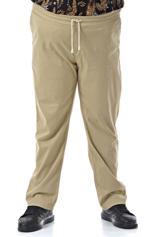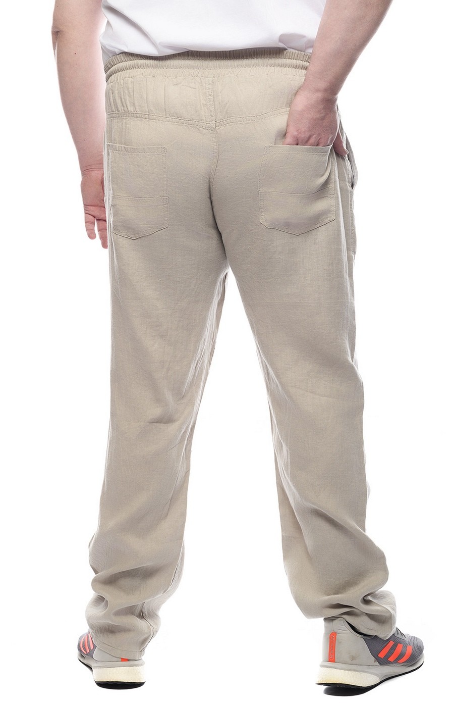 Бежевые льняные брюки с прямым свободным кроем обеспечивают комфортную посадку на талии и не стесняют движений в течение дня. Эластичный пояс с несколькими рядами резинки дополнен шнурком, который надежно фиксирует изделие и позволяет отрегулировать объем. Текстура ткани выглядит легкой и гладкой, что подчеркивает аккуратный, лаконичный вид брюк в повседневных и домашних образах. Прямые штанины без манжет спокойно ложатся по ноге и закрывают верх кроссовок, формируя собранный расслабленный силуэт. Если нужен совет по размеру и посадке, подскажем по вашим параметрам и организуем доставку удобным для вас способом.