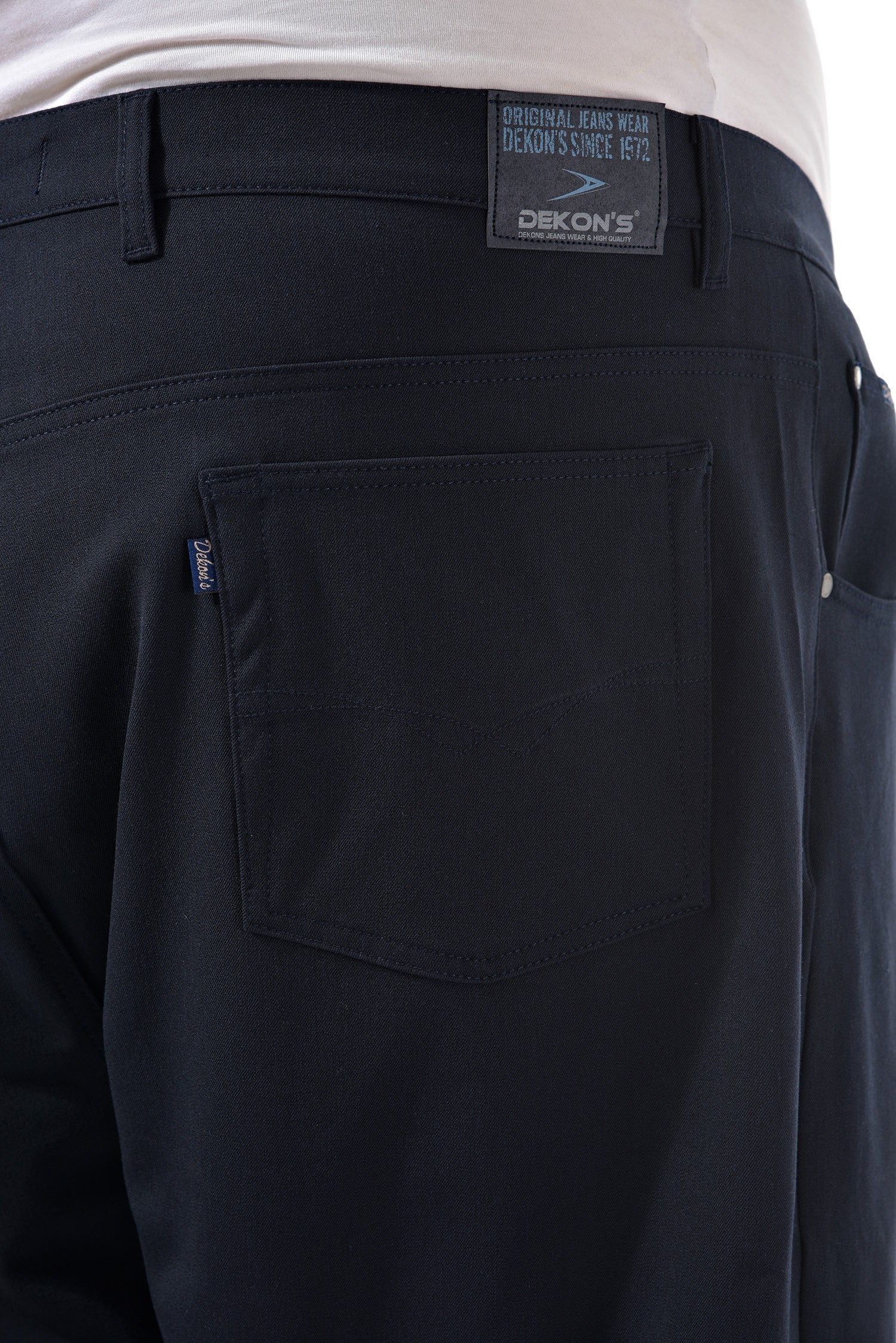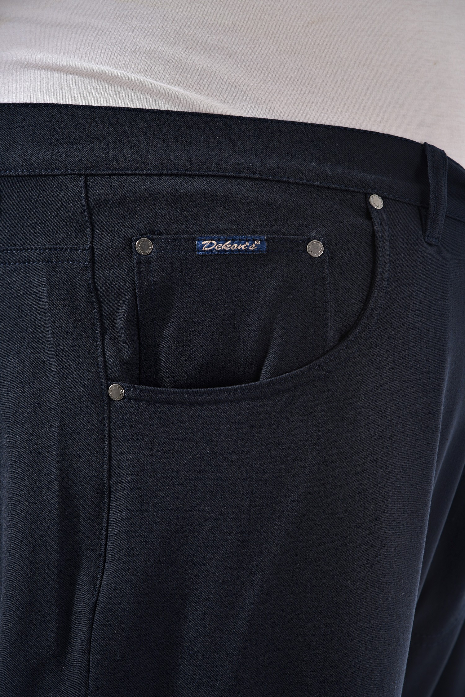 Мужские брюки из плотной эластичной ткани темно-синего цвета. Джинсовый крой. Модель одинаково уместна и в офисе, и в обычной жизни