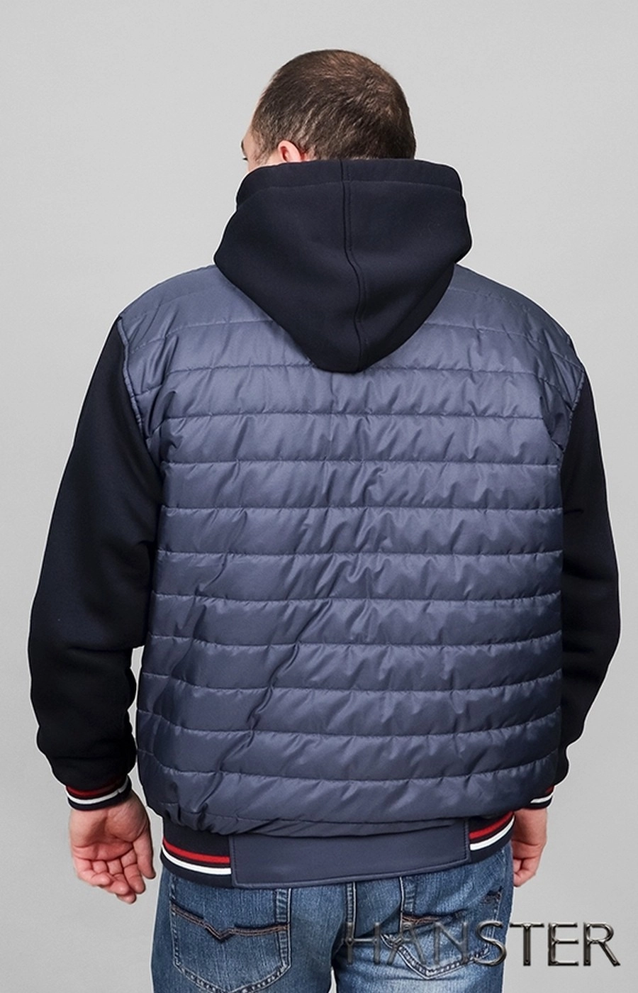 Сочетание стеганной крточной ткани и трикотажного полотна делает эту модель удобной и практичной. Центральная застежка на молнию и ветрозащитную планку с кнопками. Манжеты на рукавах и низ куртки с отделкой из трикотажа. Куртка с двумя нижними прорезными карманами. Капюшон несъемный , с утяжкой по краю. Подкладка куртки из хлопкосодержащей ткани, с двумя внутренними карманами на молнии