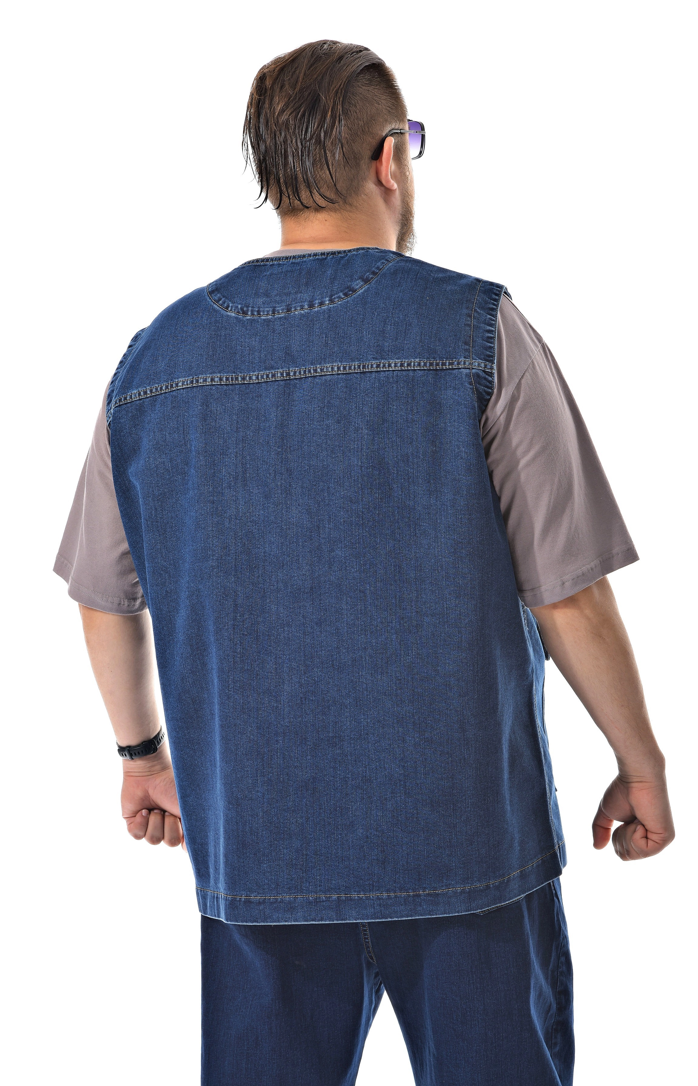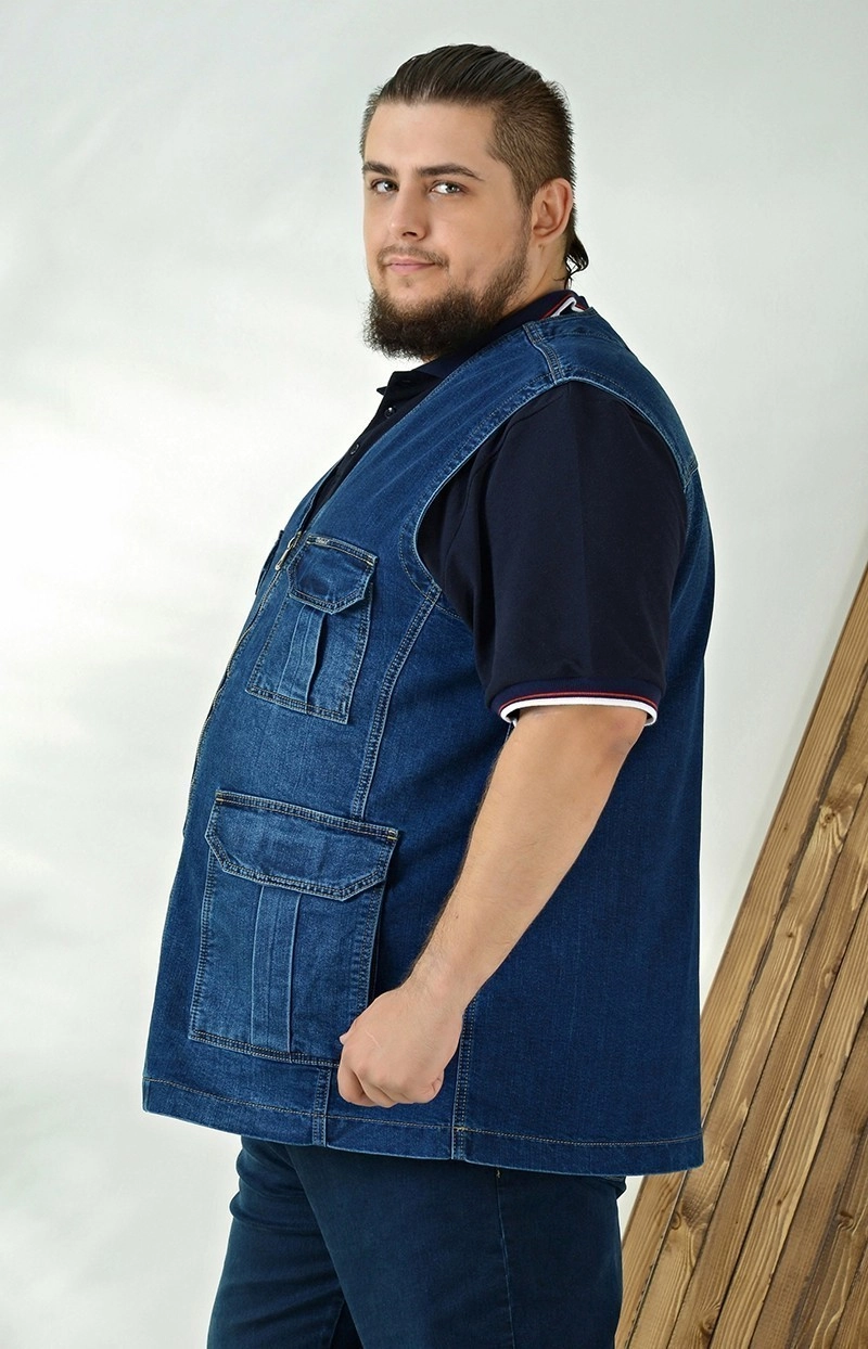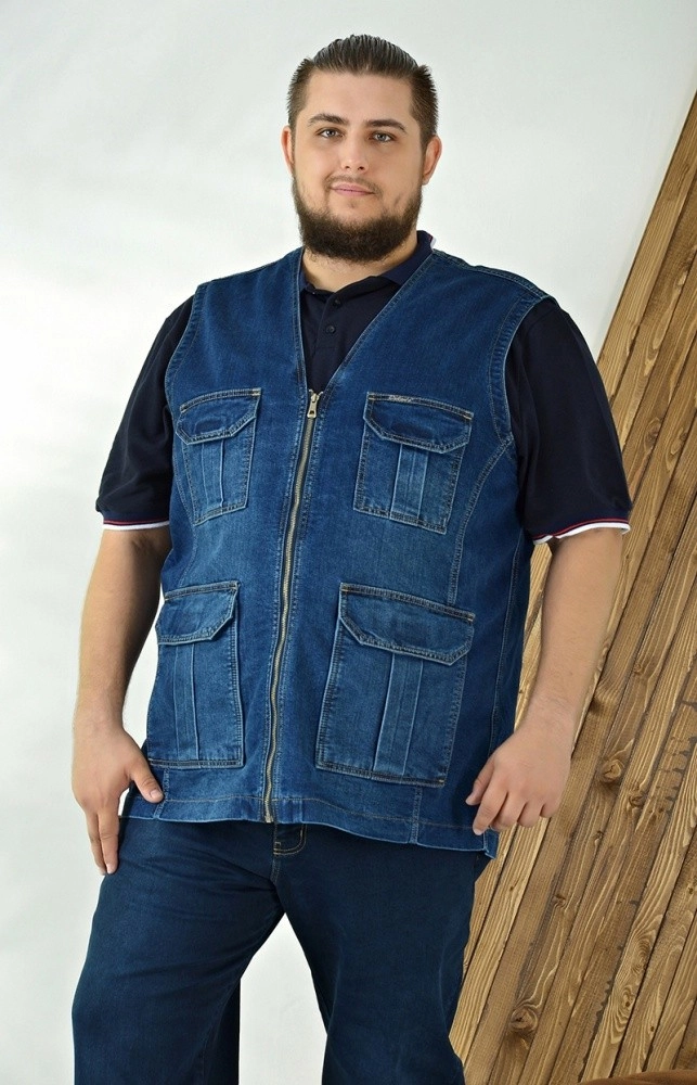 Джинсовый жилет свободного прямого кроя для мужчин больших размеров создан для повседневных образов и комфортной посадки на плечах и груди. Глубокий V-образный вырез без воротника открывает зону горловины и позволяет легко надевать жилет поверх футболок и лонгсливов. Центральная молния по всей длине фиксирует изделие и сохраняет аккуратный внешний вид в застегнутом и расстегнутом вариантах. Плотный деним насыщенного синего цвета держит форму и подчеркивает лаконичный, но практичный стиль. Впереди расположены объемные накладные детали с фигурными клапанами и декоративными строчками, которые добавляют жилету рабочий, уличный характер и собирают образ для города, дачи или отдыха. Проймы выполнены достаточно широкими, чтобы жилет не стеснял движений рук и сидел удобно в течение дня. Если нужны подсказки по посадке на вашу фигуру, поможем определиться с размером и оформим доставку удобным для вас способом.