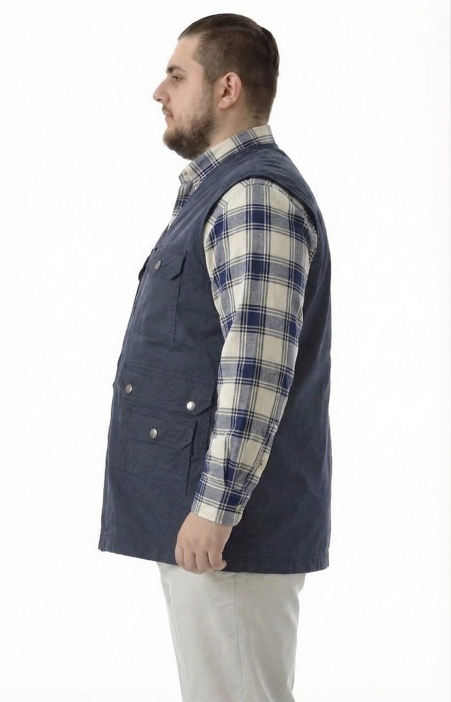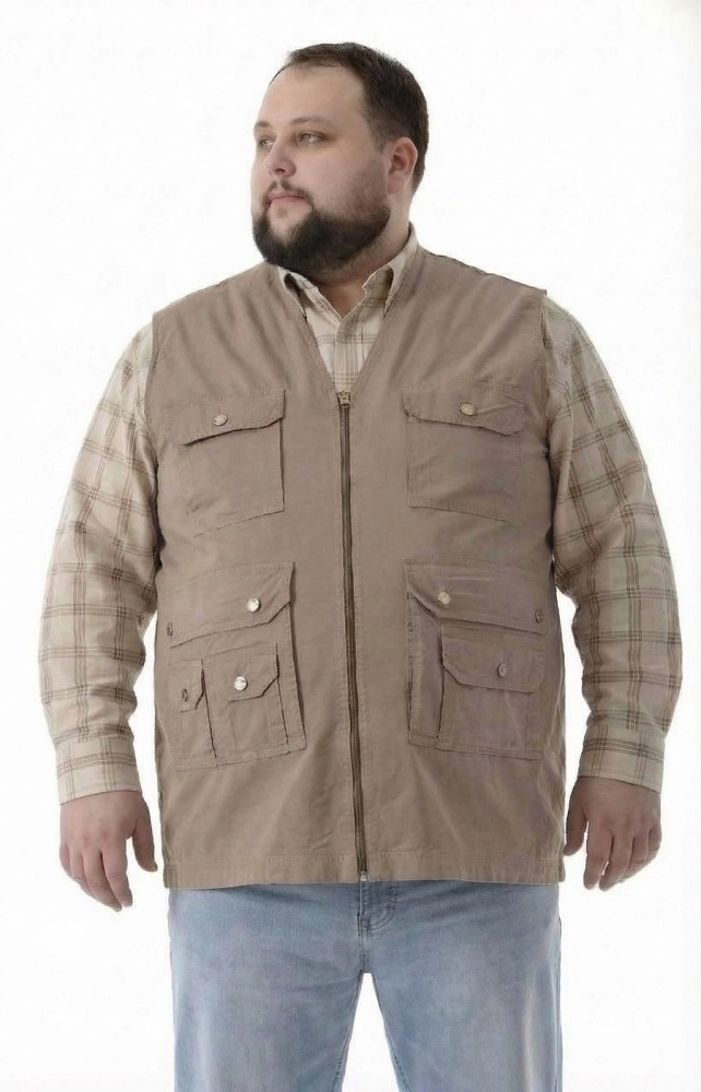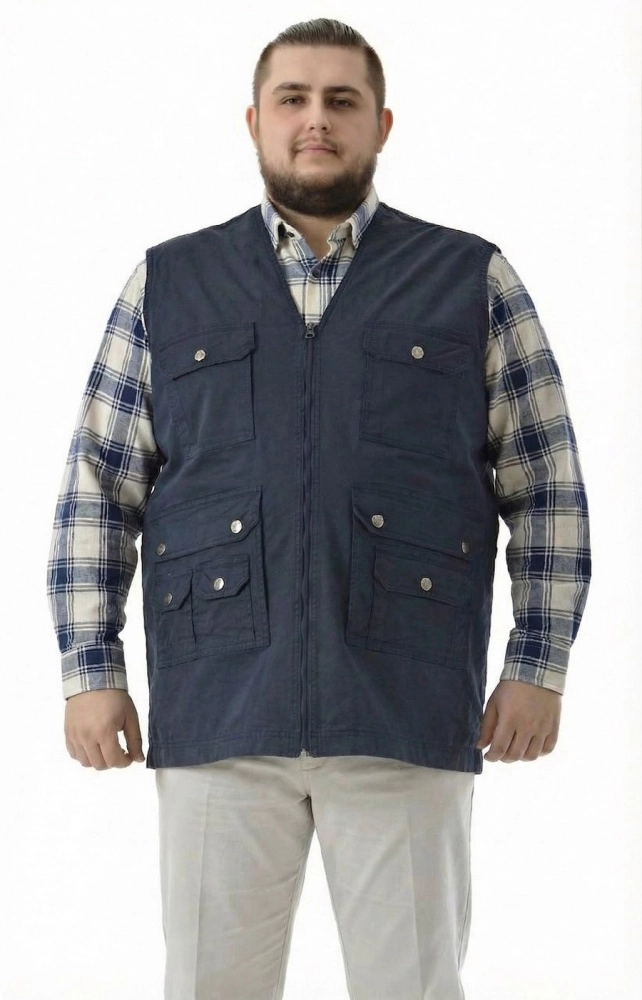 Мужской жилет габардиновый прямого кроя обеспечивает комфортную посадку и не стесняет движений, а темно-синий цвет легко вписывается в повседневный гардероб. Модель без воротника с V-образной линией горловины аккуратно смотрится поверх футболки или тонкого лонгслива, формируя собранный повседневный образ для города и отдыха. Центральная застежка-молния по всей длине позволяет быстро расстегнуть или застегнуть жилет, регулируя комфорт. Плотная на вид ткань держит форму, а ровные швы и аккуратная прострочка подчеркивают лаконичный, практичный дизайн. Умеренная длина по бедру делает жилет удобным для повседневной носки, поездок и прогулок. Перед заказом подскажем размер и поможем с посадкой по вашим параметрам, организуем доставку удобным для вас способом — просто напишите нам любым удобным способом.