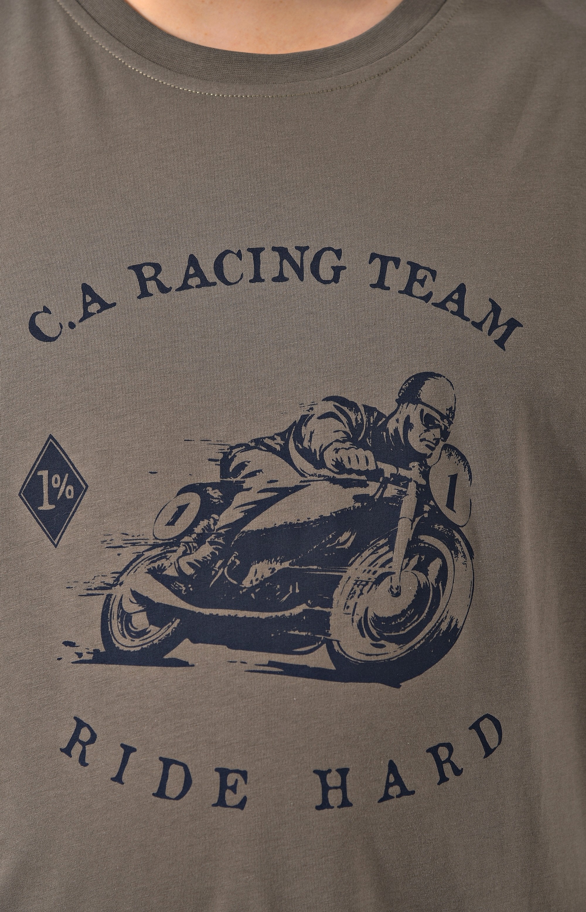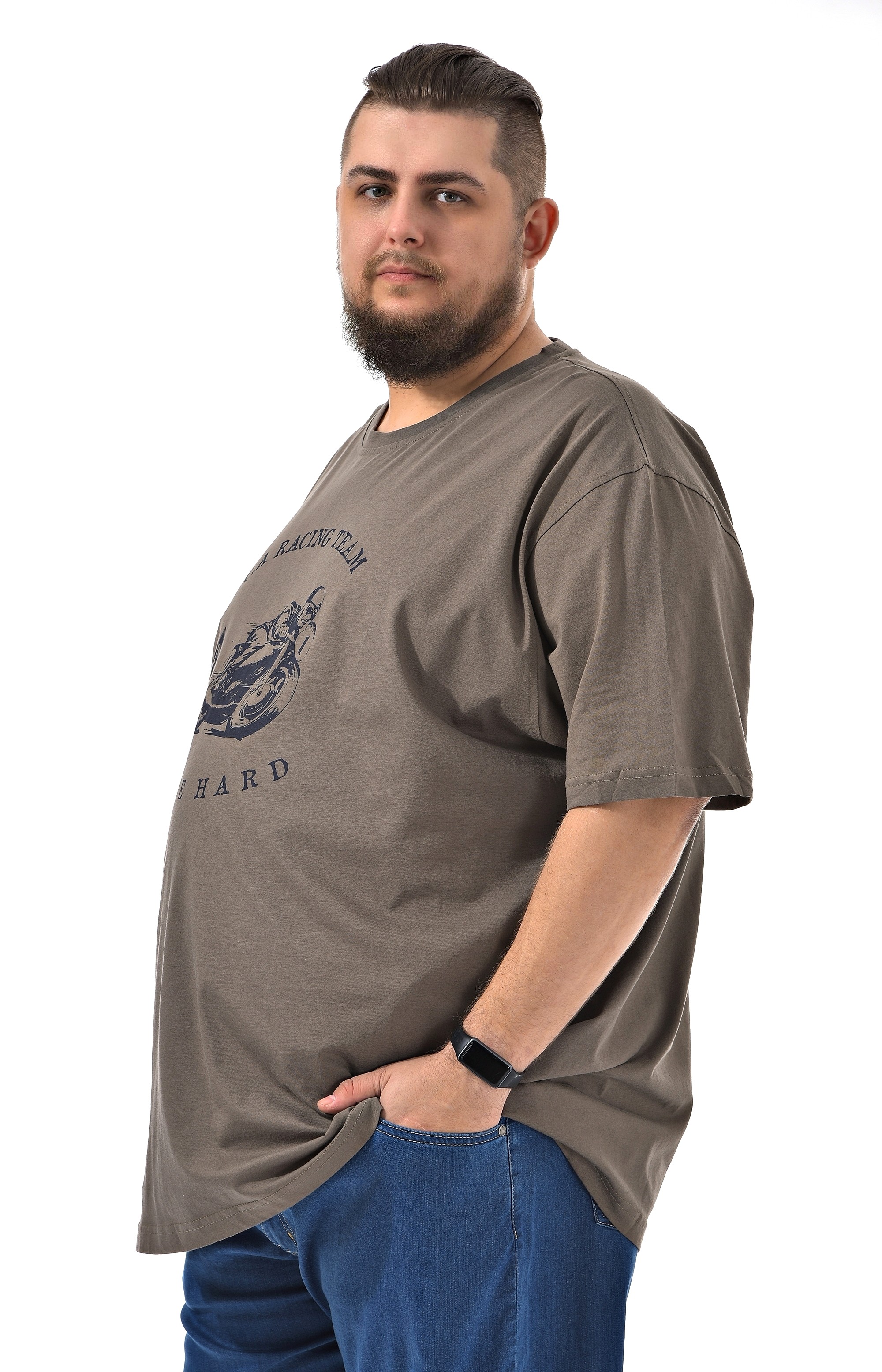 Мужская футболка Borcan club с круглым вырезом. Цвет - хаки. Стильный буквенный рисунок. Средняя длина. Без кармана