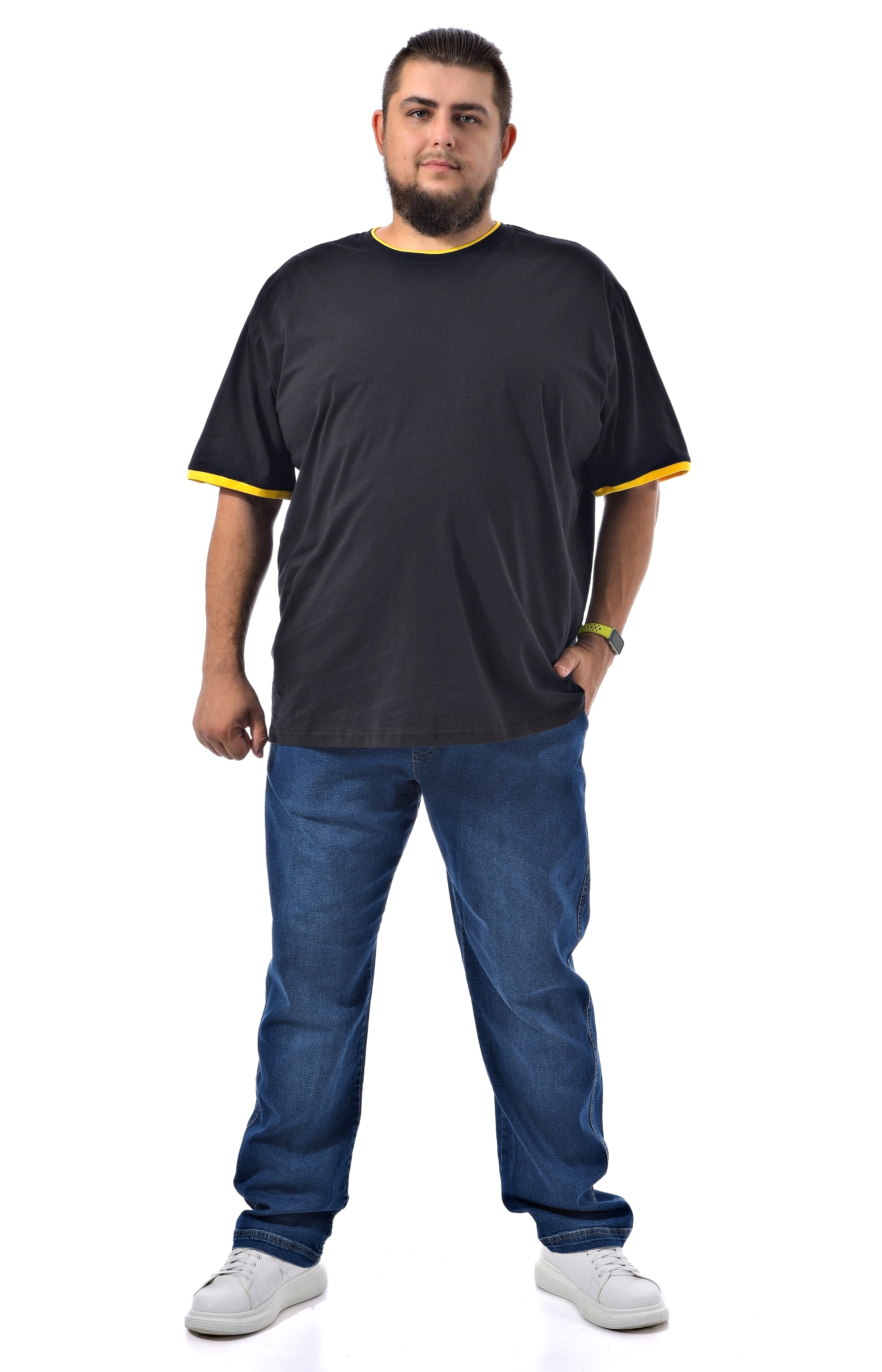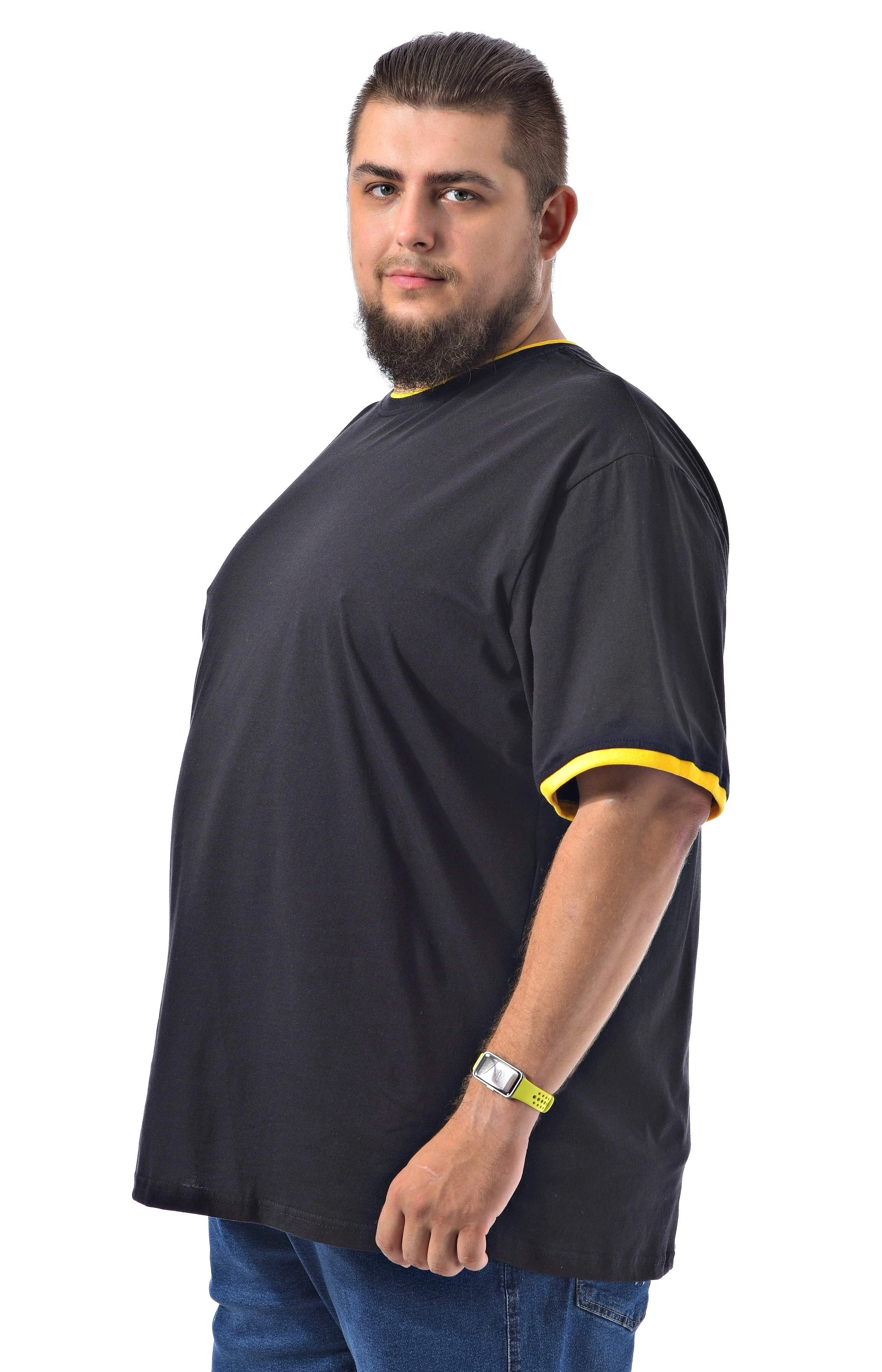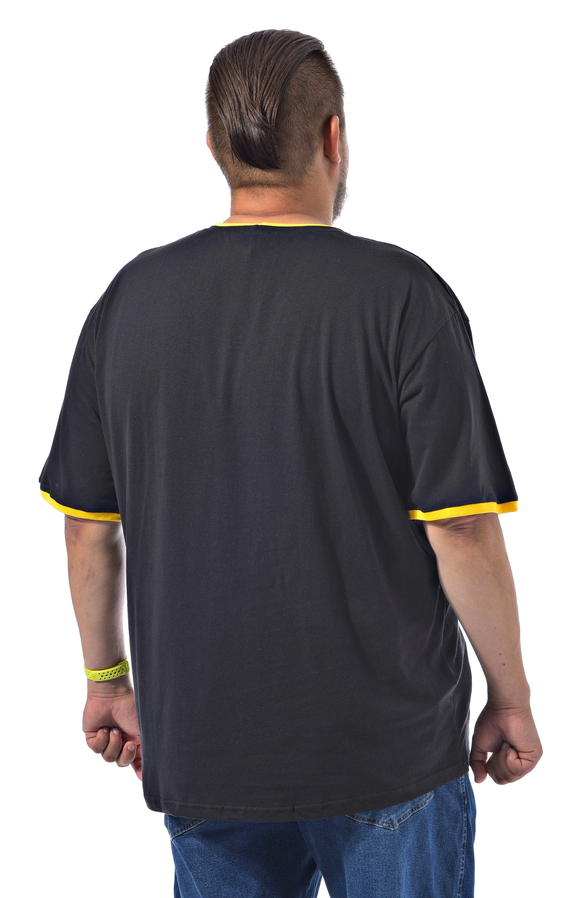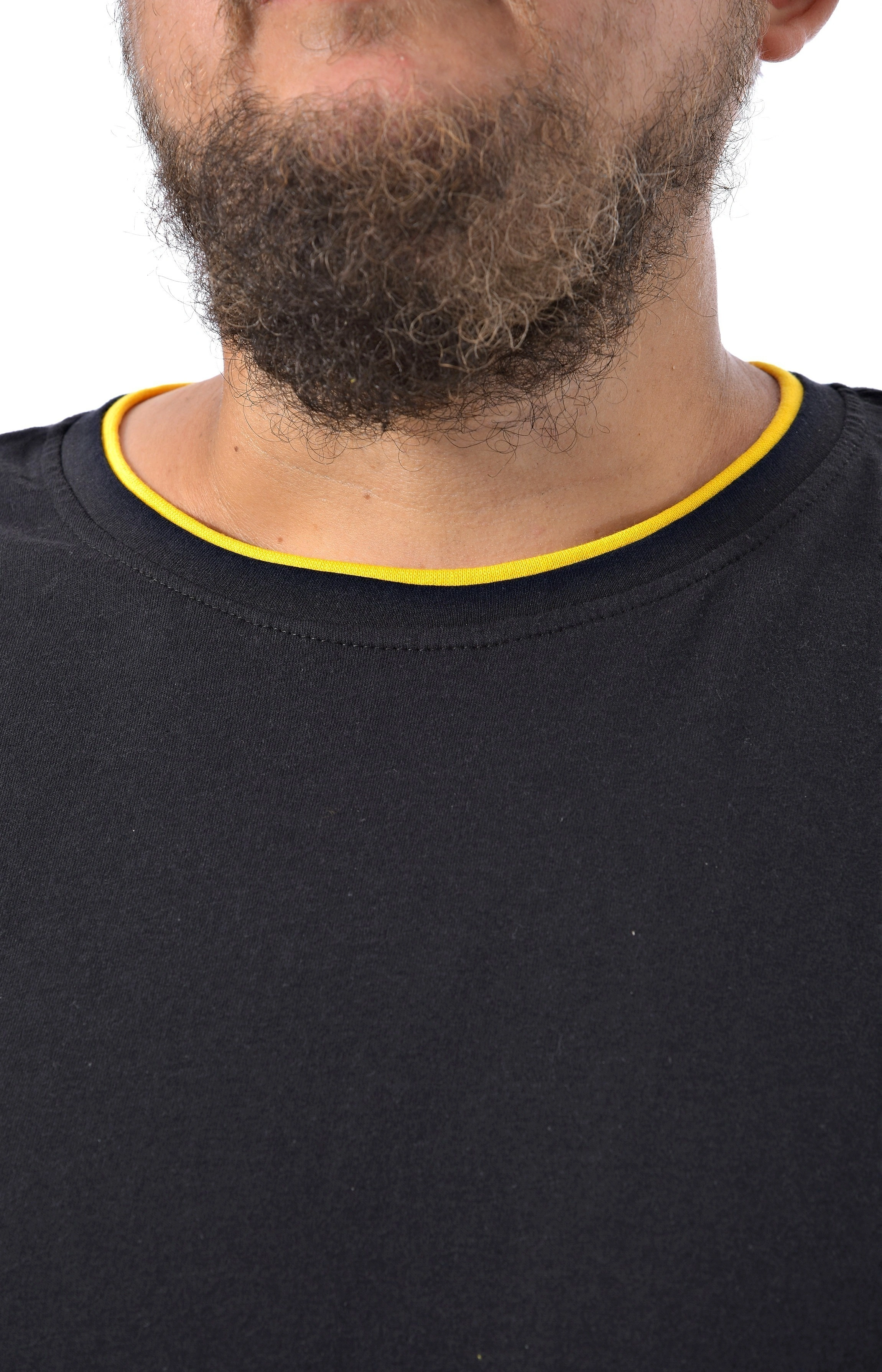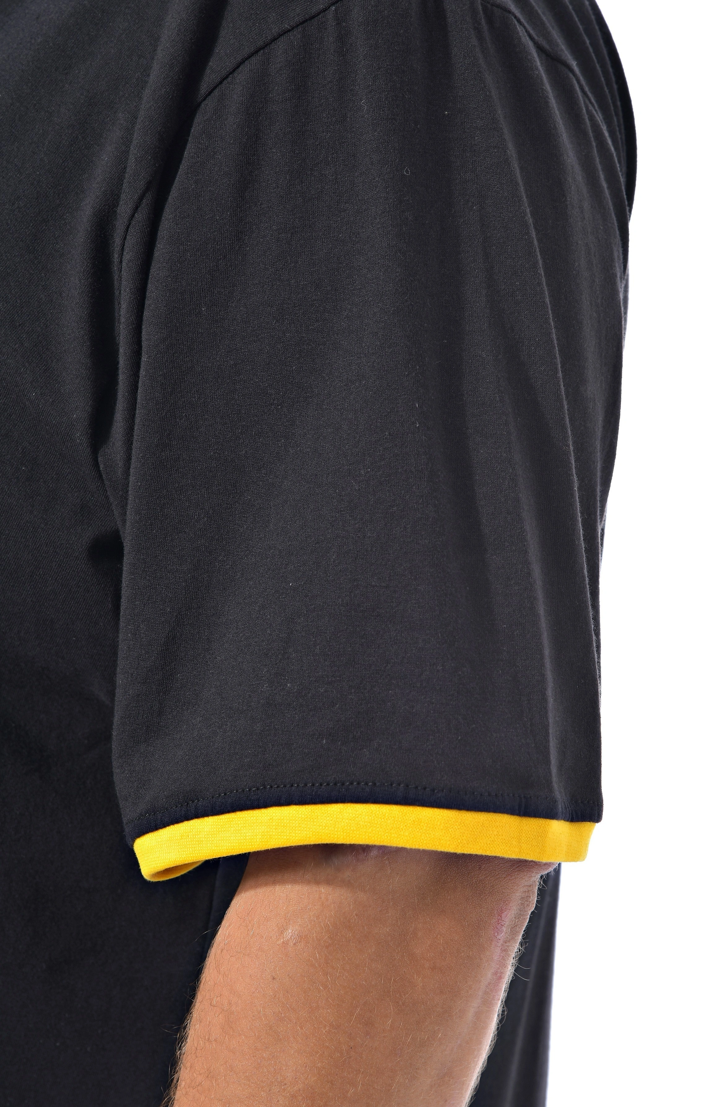 Мужская футболка черного цвета с двойной отделкой по вороту - рибаной черного и желтого цветов.