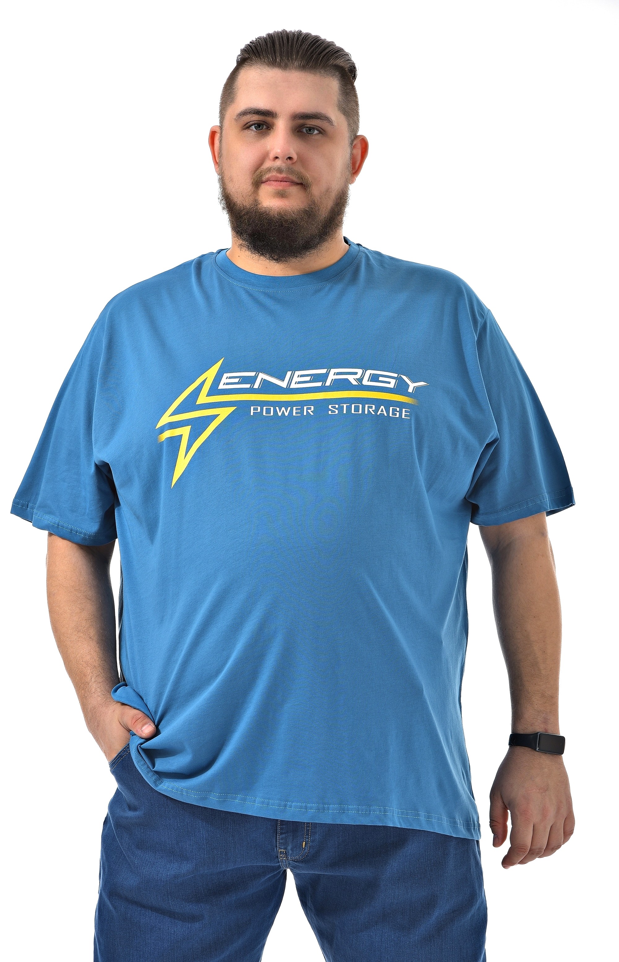 Мужская футболка голубого цвета с круглым вырезом. Рисунок на груди