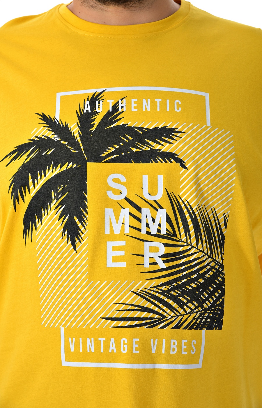Желтая мужская футболка свободного кроя обеспечивает комфортную посадку и не стесняет движений, подходит для повседневных образов в городе и на отдыхе. Материал с гладкой поверхностью ровно ложится по плечам и груди, длина по кадру закрывает линию бедер и позволяет носить модель навыпуск. Круглая горловина выполнена в тон основного цвета, сохраняя аккуратный и собранный вид. Крупный контрастный принт с пальмами и надписями на груди придает яркое летнее настроение и хорошо сочетается с джинсами, шортами и лёгкими брюками. Подскажем подходящий размер и посадку по вашим параметрам и организуем доставку удобным для вас способом, чтобы футболка быстро оказалась в вашем гардеробе.
