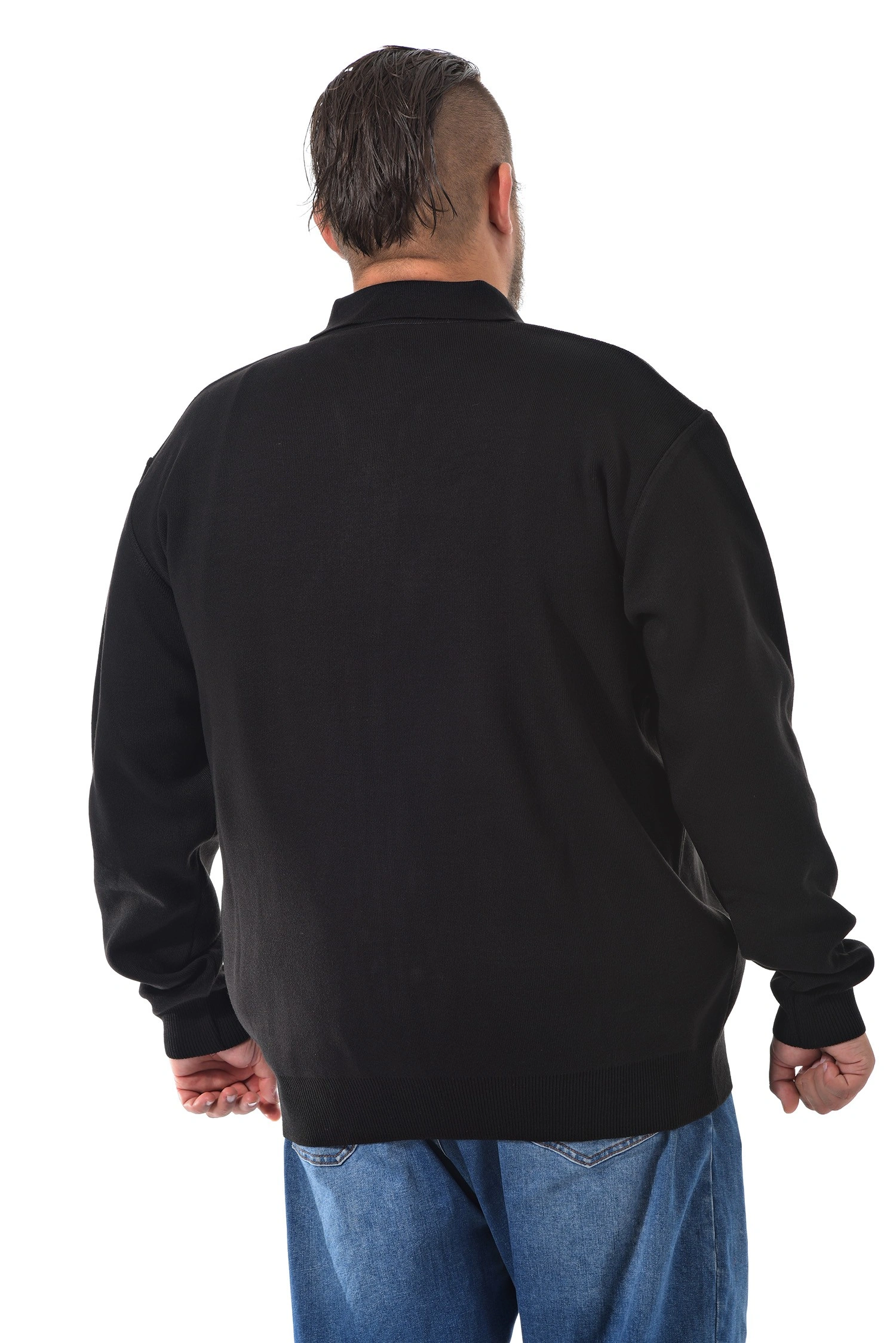 Классический кардиган на молнии чёрного цвета. Модель имеет два прорезных кармана. Именно такой мужской кардиган можно смело сочетать не только с классическими сорочками, но и с футболками, теннисками, поло. Манжеты и низ изделия на трикотажной резинке