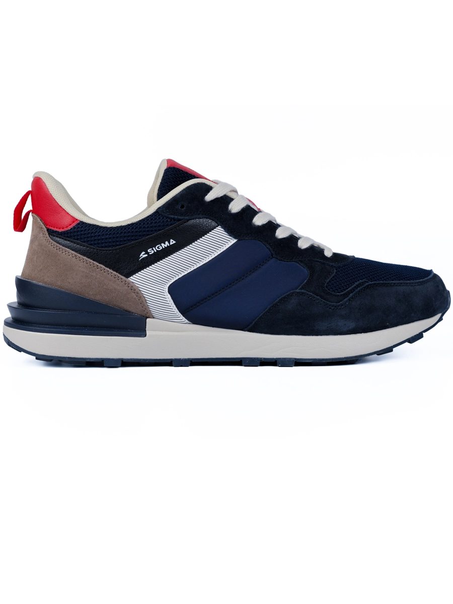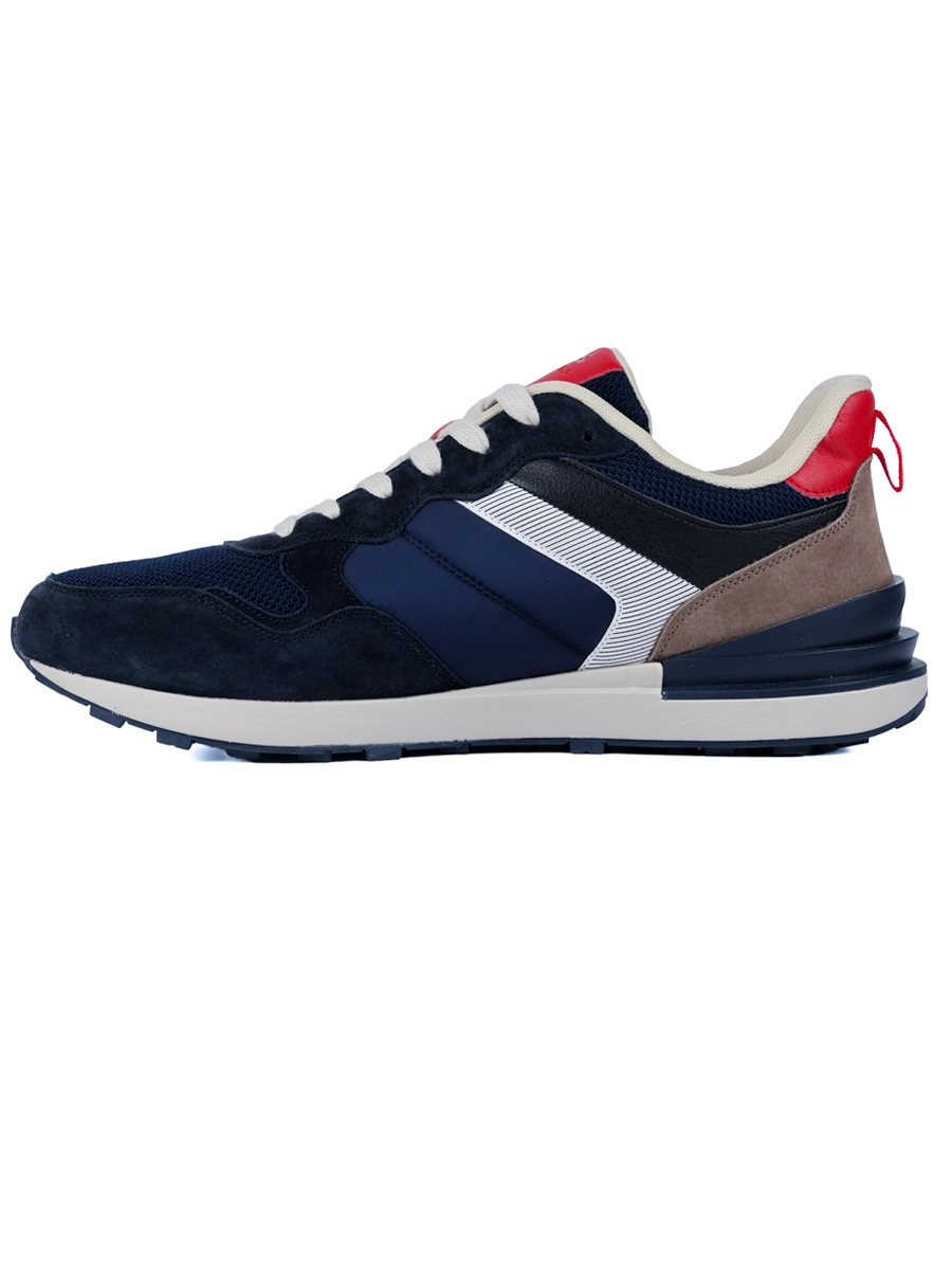 Мужские кроссовки в сочетании темно-синего, красного и нейтральных оттенков с комфортной посадкой и классической шнуровкой для надежной фиксации стопы. Верх собран из плотных панелей с мягко-бархатистой фактурой и сетчатыми вставками, за счет чего пара выглядит структурно и аккуратно. Контрастные боковые детали и небольшие логотипы подчеркивают спортивный характер модели, делают ее уместной для повседневных городских образов и отдыха. Объемный задник с красной вставкой поддерживает пятку, светлая подошва средней высоты с рельефным протектором обеспечивает устойчивость на асфальте и других ровных поверхностях. Если не уверены, какой размер и посадка будут удобнее, подскажем по вашим параметрам и оформим доставку тем способом, который вам проще всего получить.