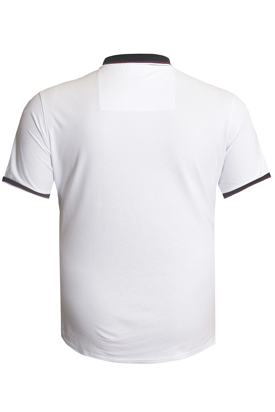 Мужская стильная тенниска белого цвета из ткани "лакоста" с контрастным синим воротником. Застежка на пуговицы