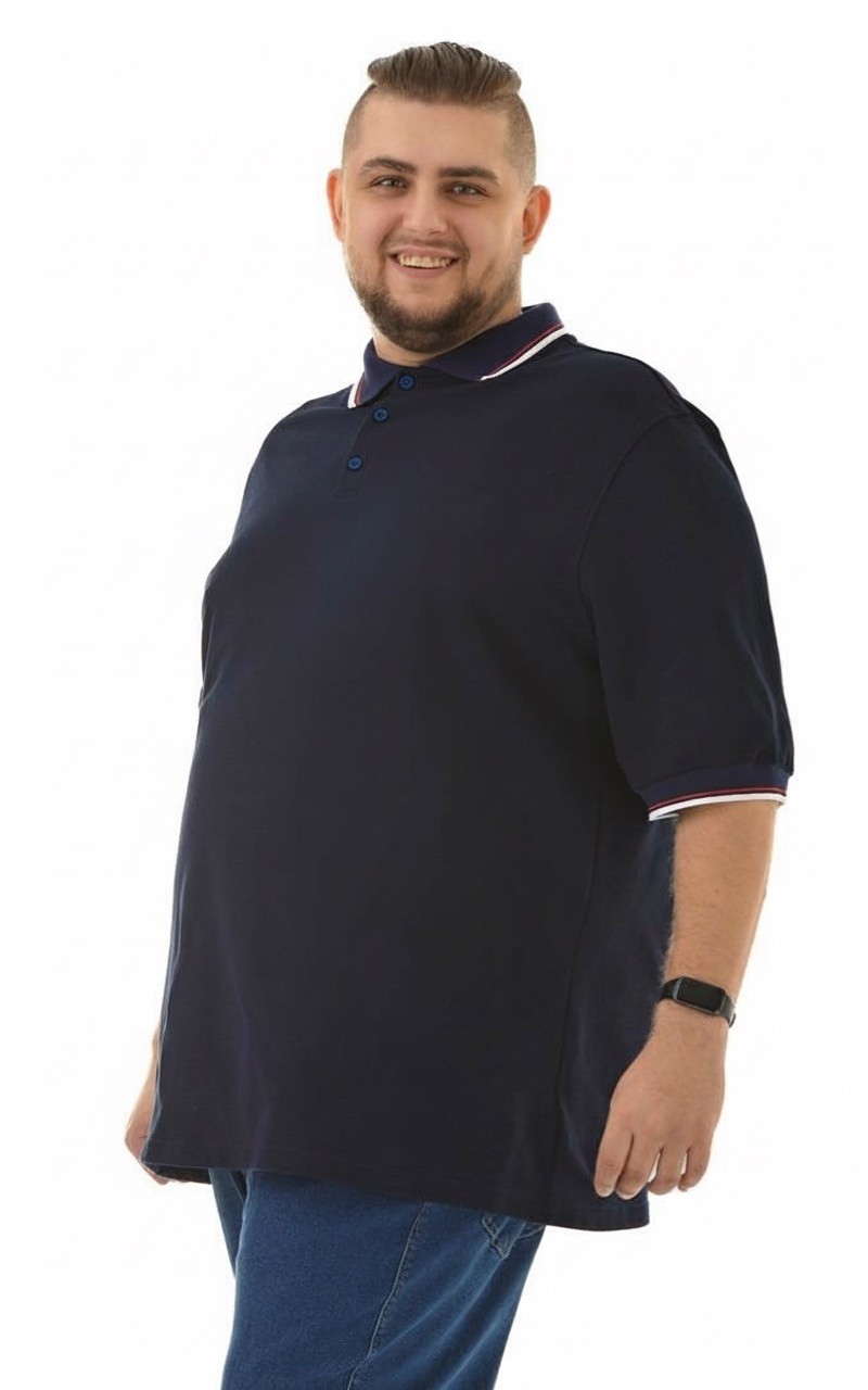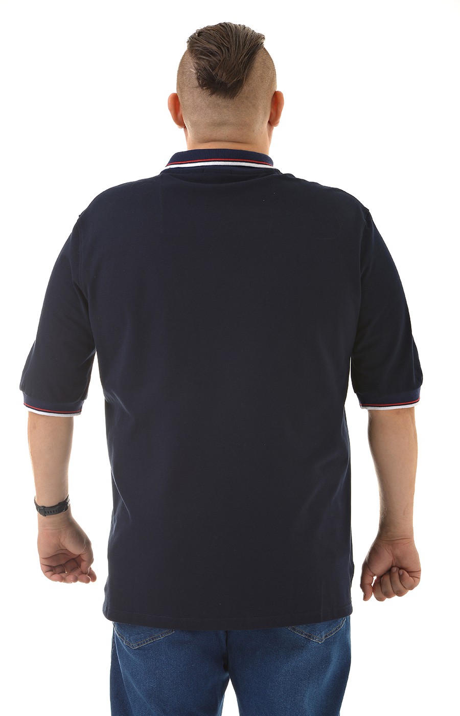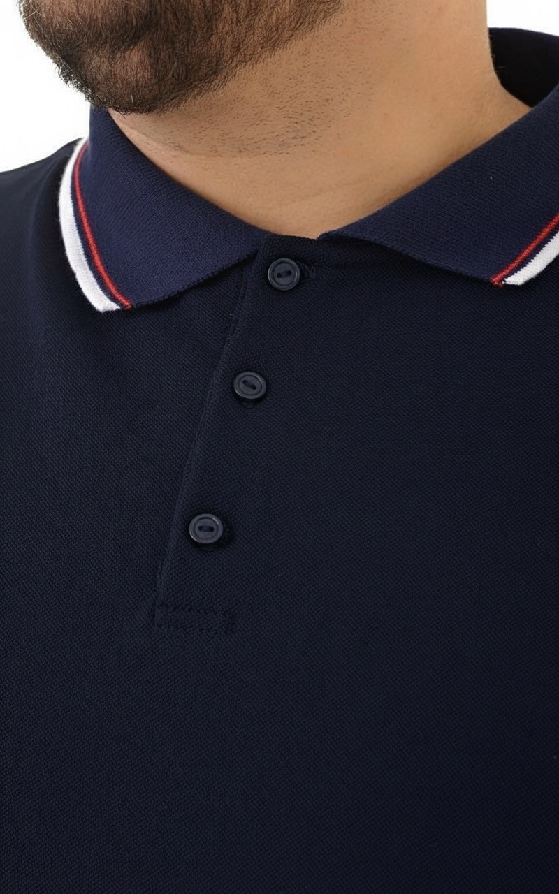 Мужская стильная тенниска темно-синего цвета из ткани "лакоста" с контрастным синим воротником и манжетами на рукавах. Застежка на пуговицы