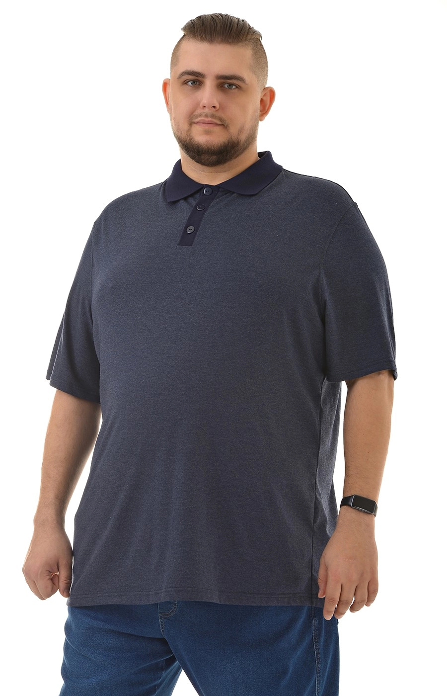 Мужская тенниска темно-синего цвета из хлопковой ткани кулирка с темно-синим воротником. Застежка на пуговицы