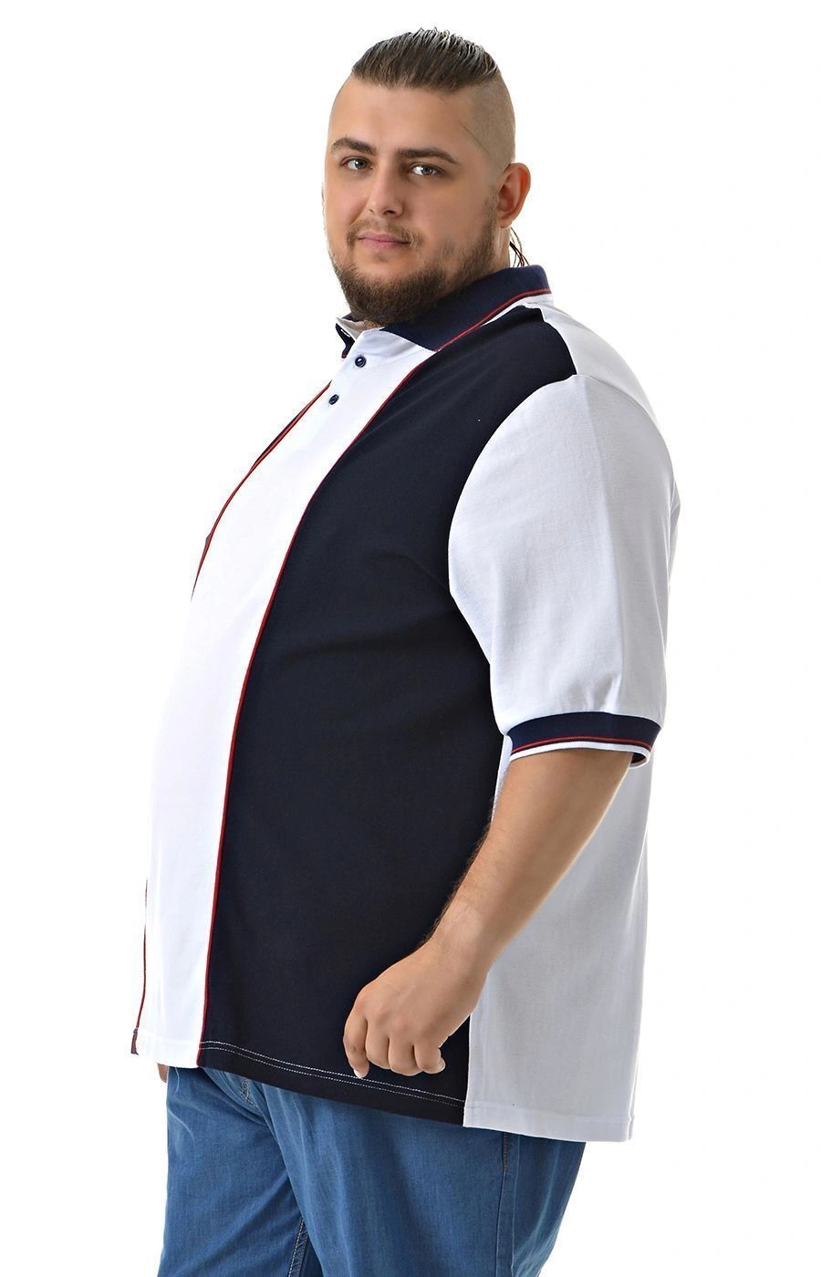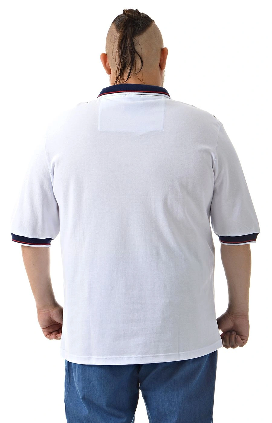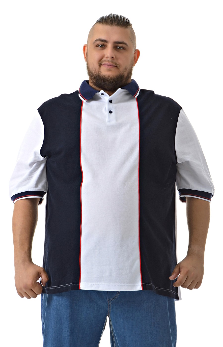 Стильная мужская тенниска больших размеров "Большие люди" с контрастными вставками — качественная футболка-поло из ткани пике 100% хлопка. Поло из экологичной мягкой ткани пике приятно ощущается на коже и хорошо пропускает воздух. Натуральный 100% хлопок обеспечивает комфорт и долговечность. Контрастные темно-синие вставки на воротнике, рукавах и манжетах добавляют стильный спортивный акцент.