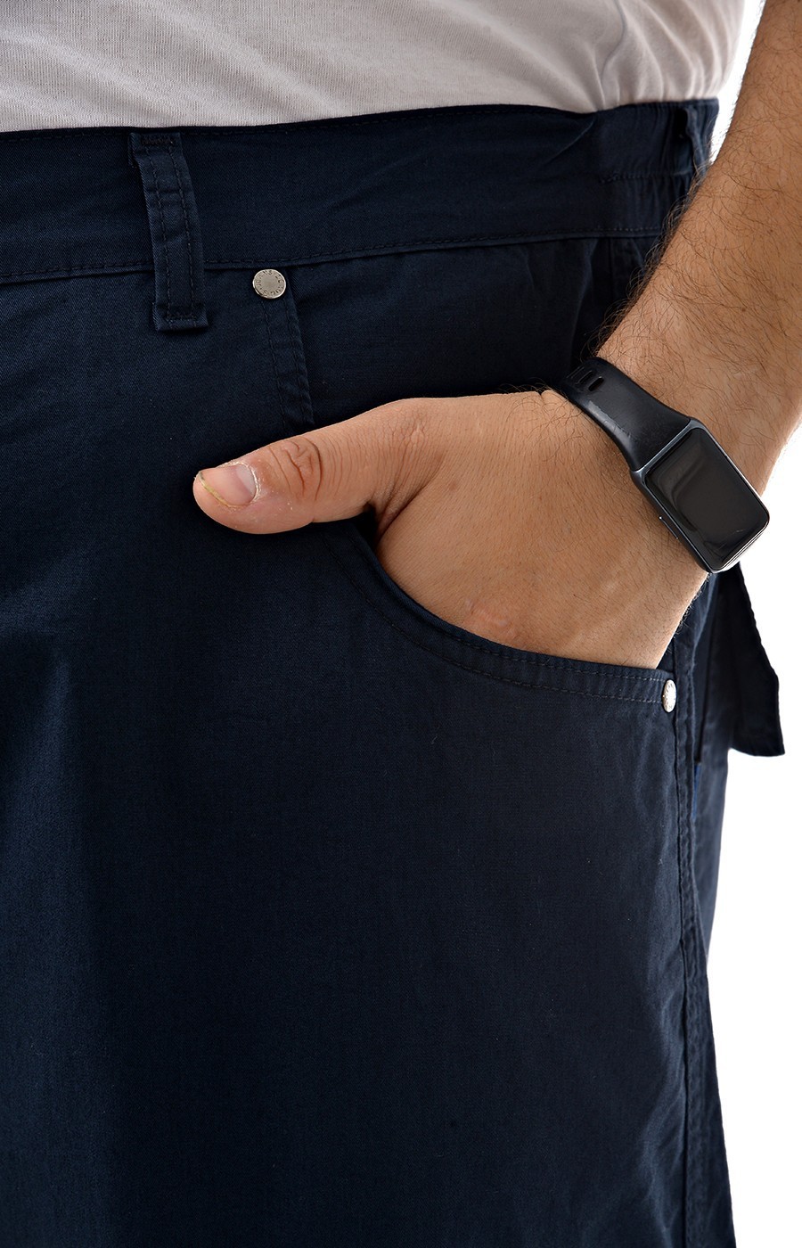 Габардиновые мужские бриджи темно-синего цвета. Застежка на молнию и пуговицу. Накладные карманы на бедрах и сзади. Пояс на резинке по спинке