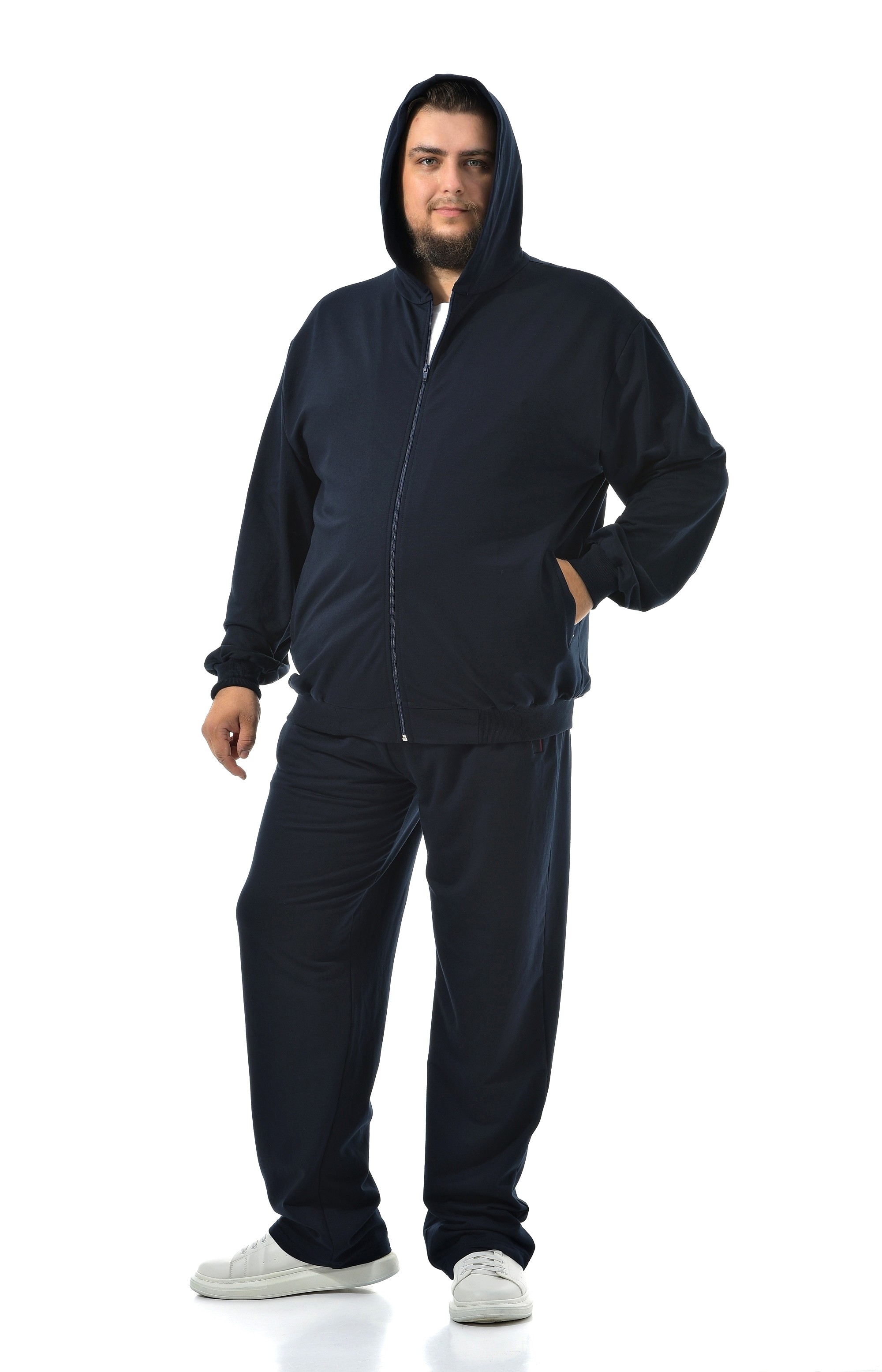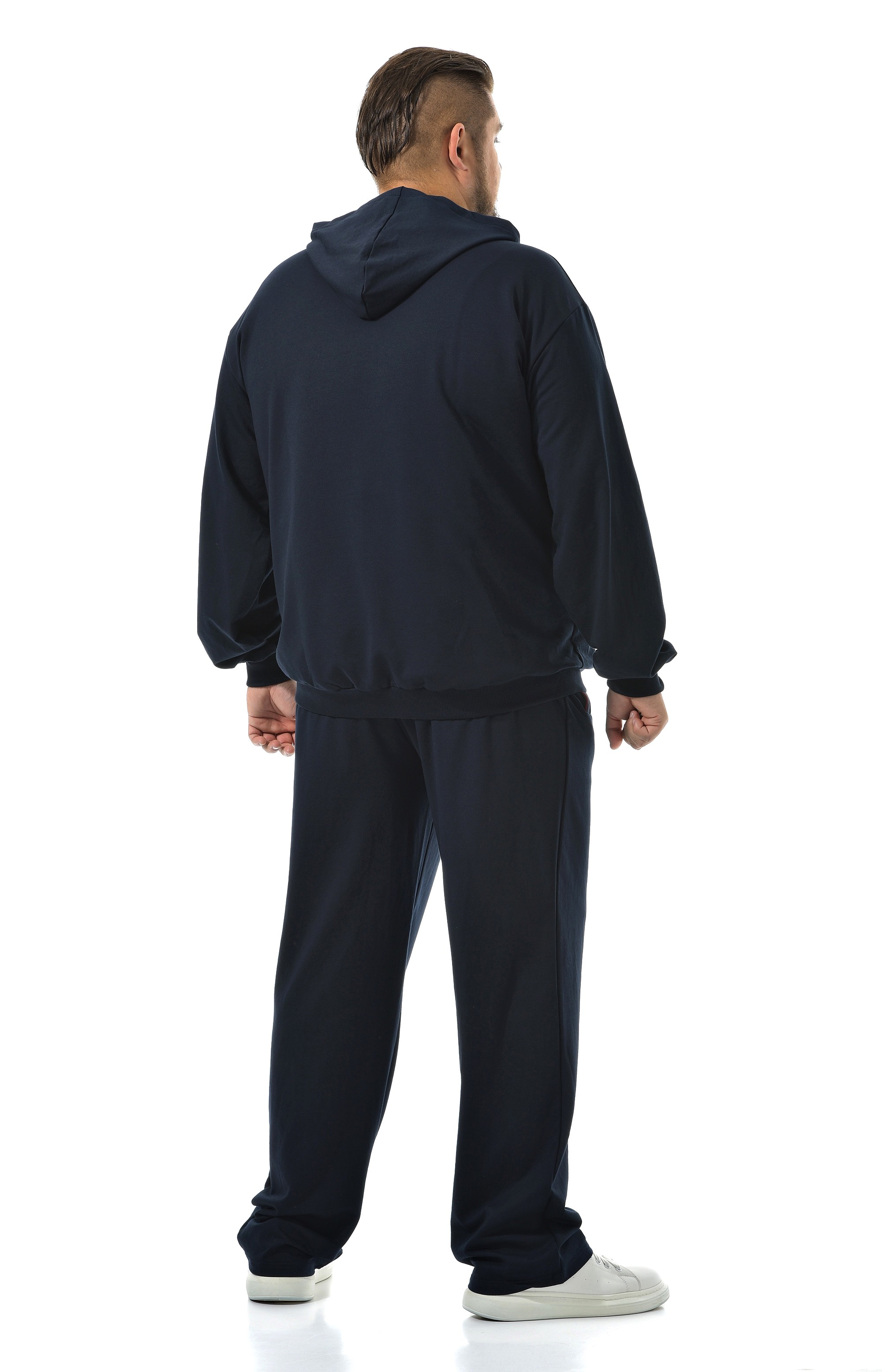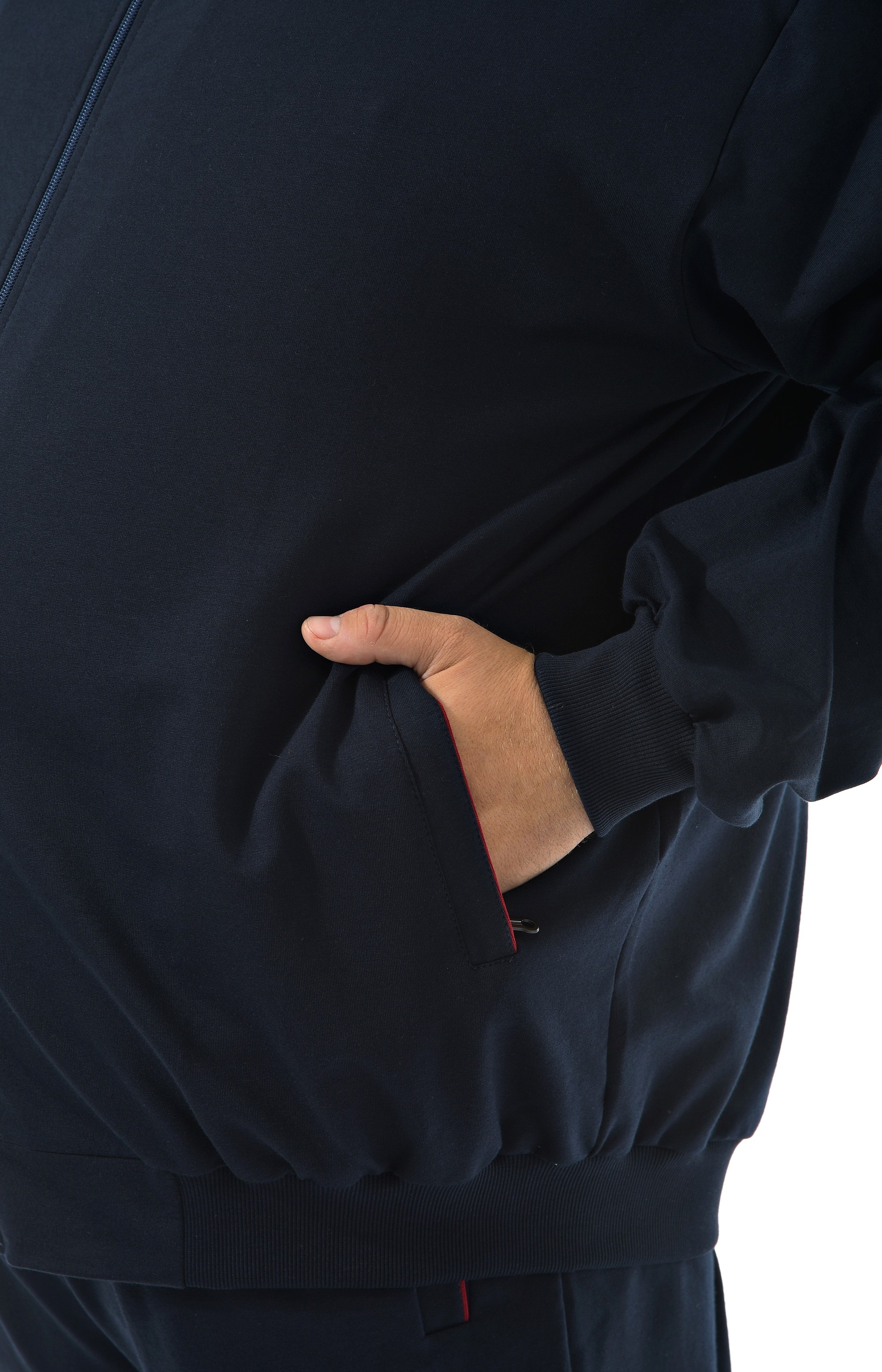 Стильный мужской спортивный костюм темно-синего цвета. Центральная застежка на молнию. Отделка бордовым кантом по карману