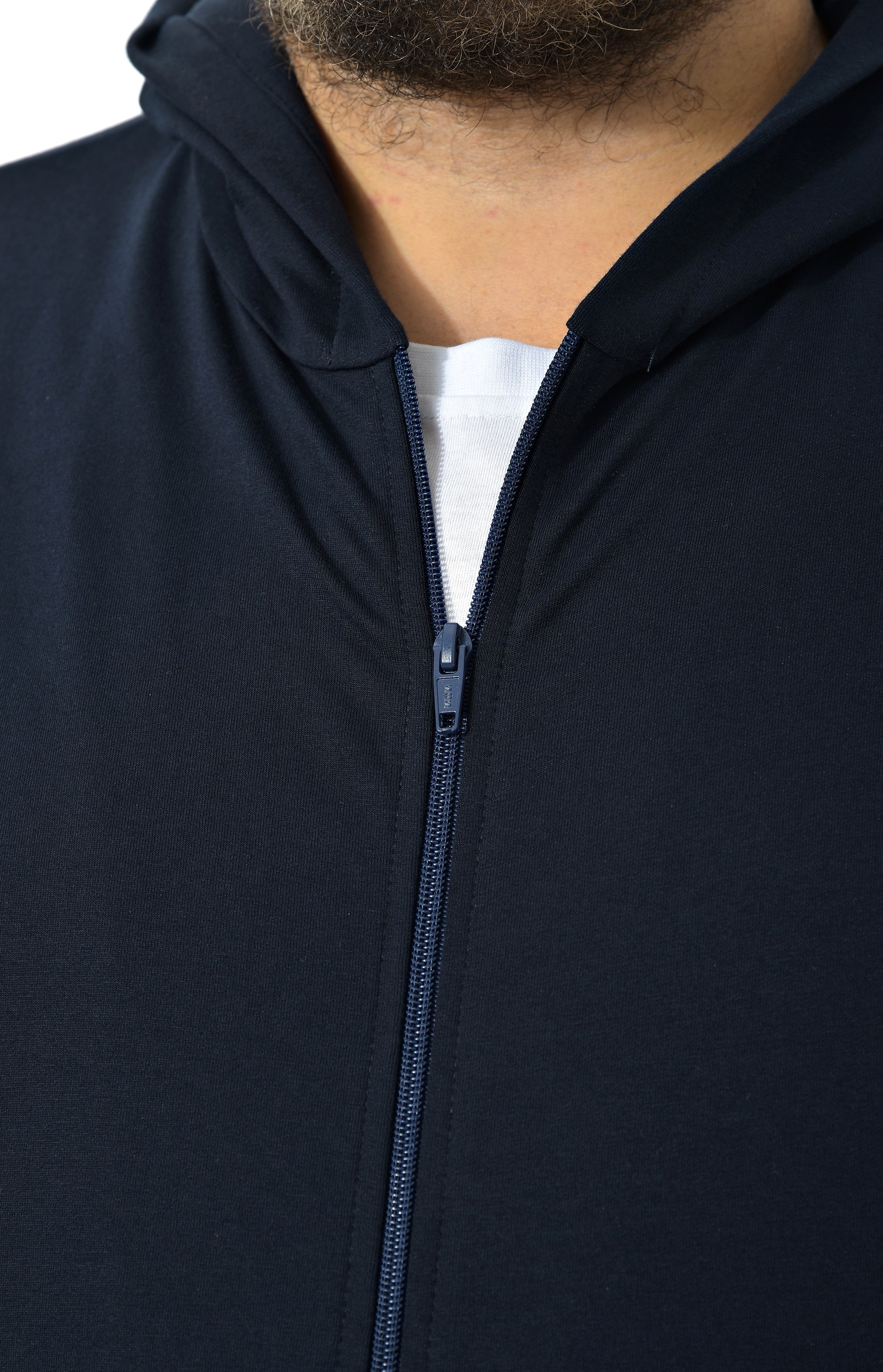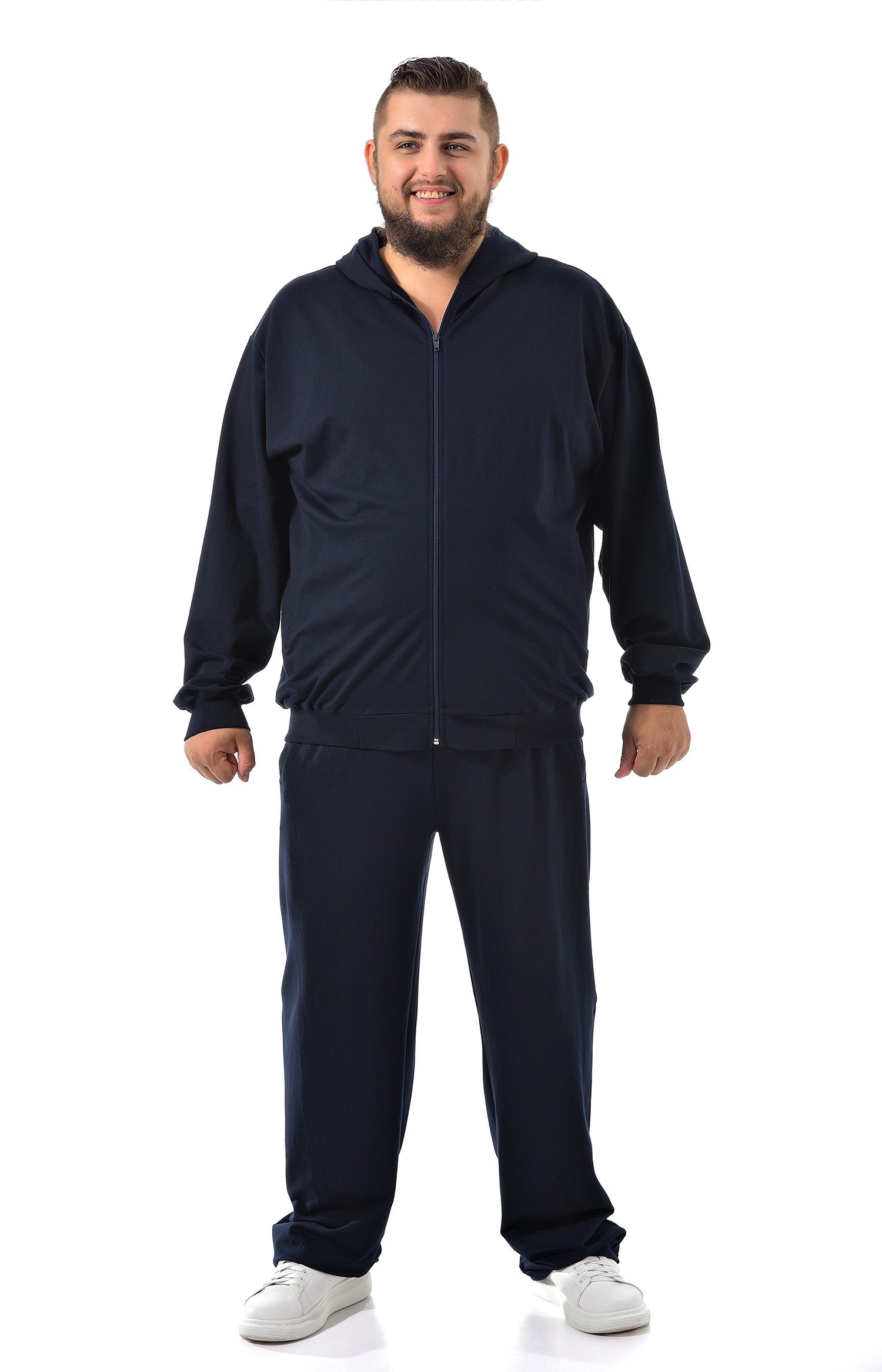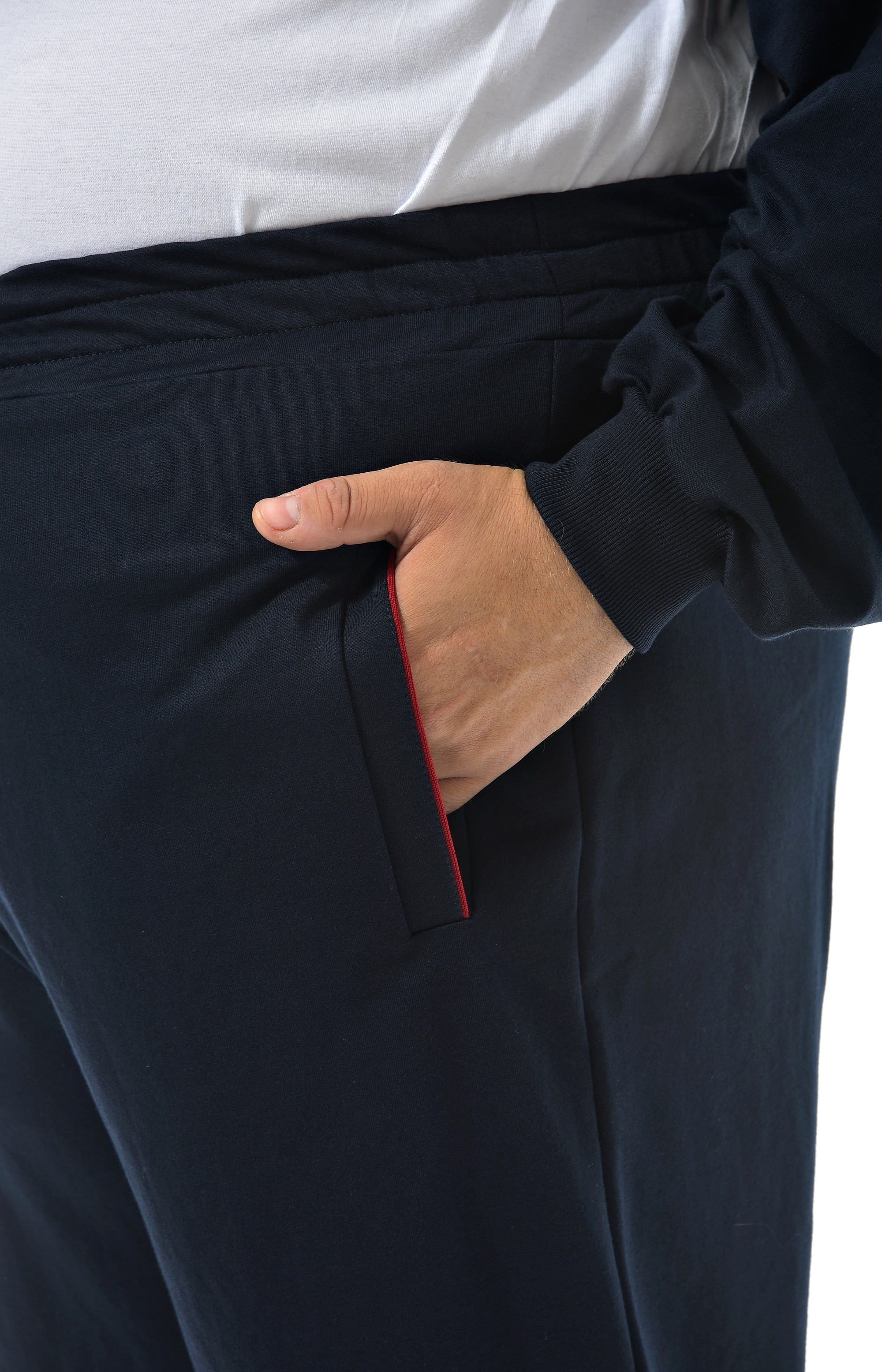 Стильный мужской спортивный костюм темно-синего цвета. Центральная застежка на молнию. Отделка бордовым кантом по карману