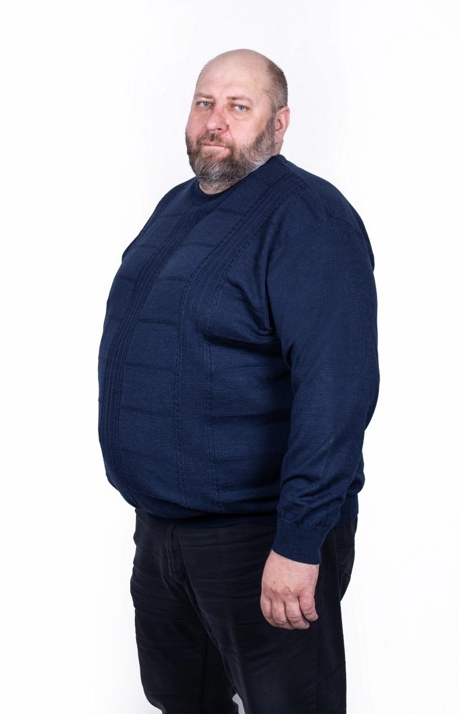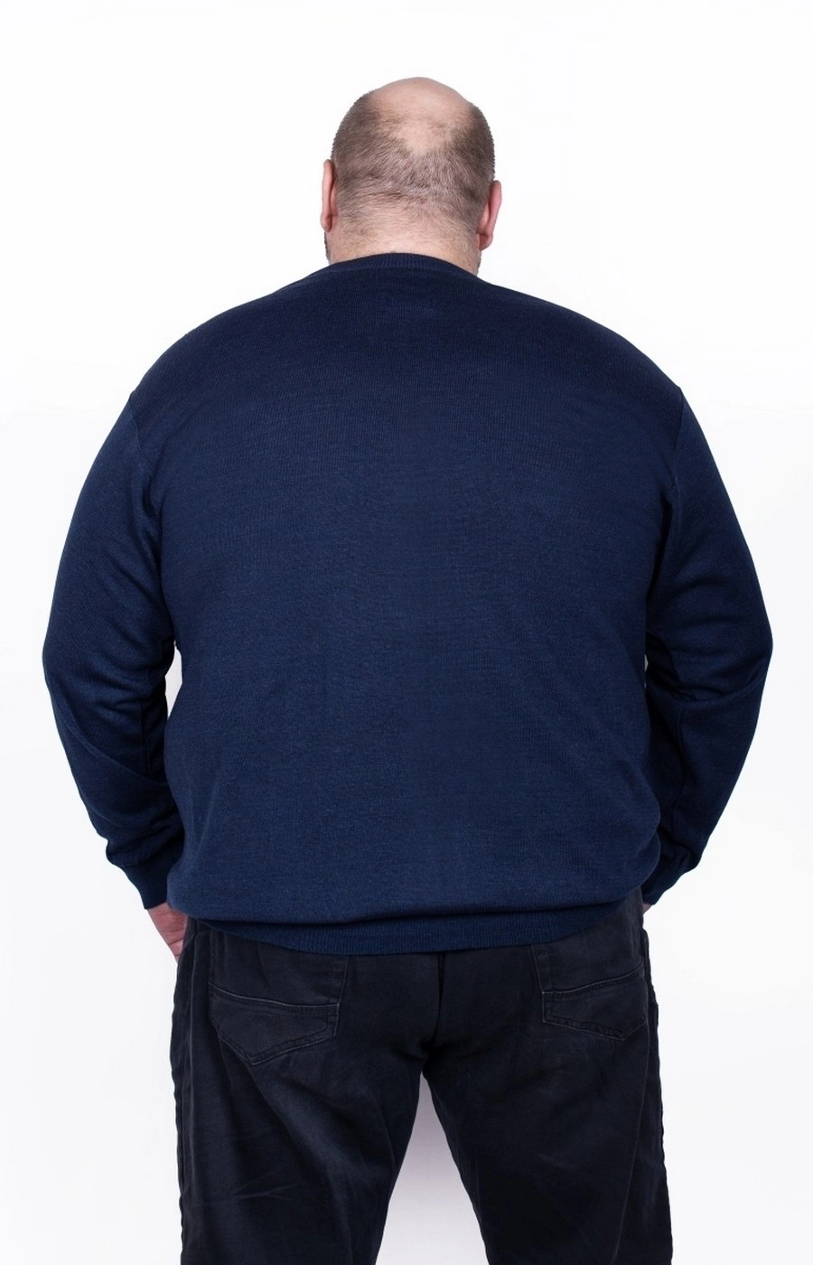 Синий мужской джемпер синего цвета с круглым вырезом. Стильная вязка изделия