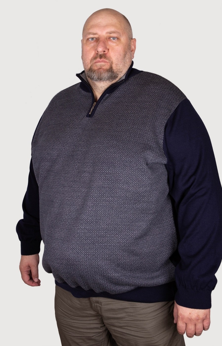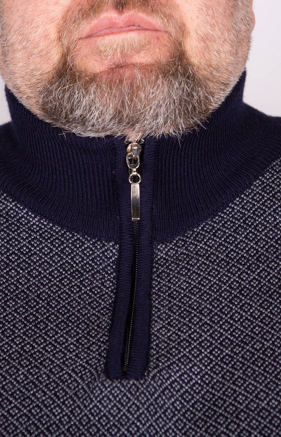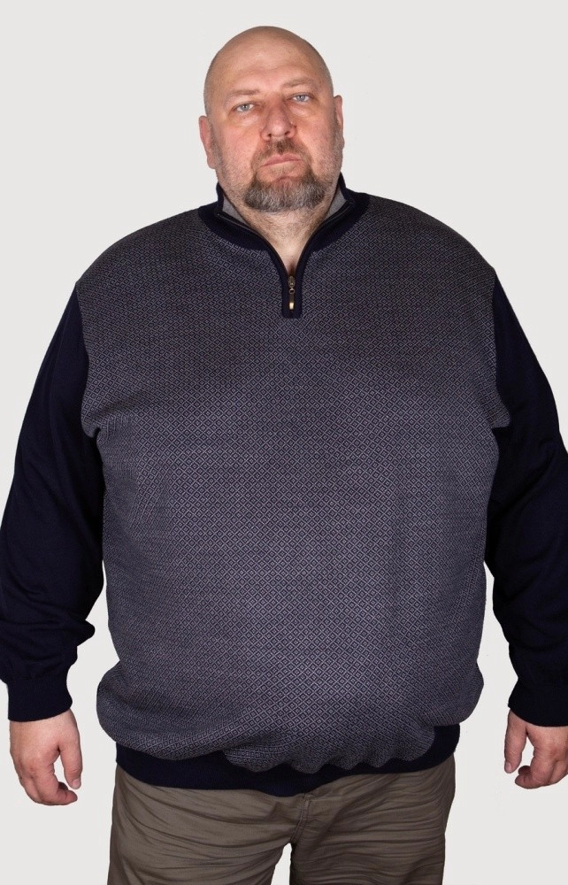 Оригинальный мужской джемпер синего цвета с высоким воротом. Ворот стойка с застежкой на молнию