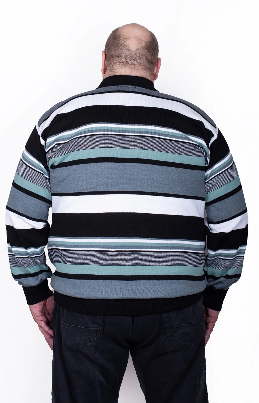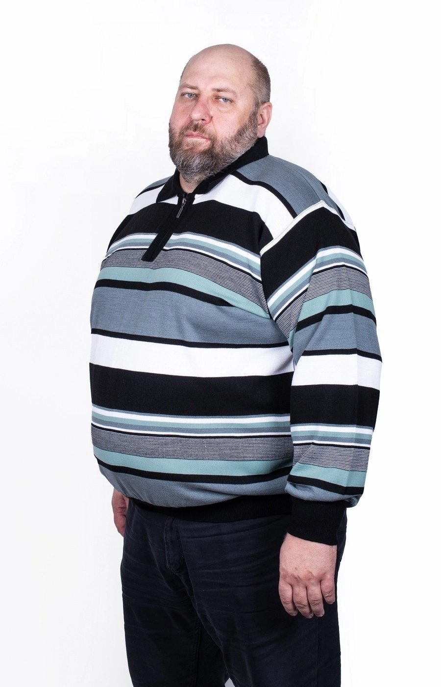 Мужской свитер - поло синего цвета в контрастную полоску. Ворот на молнии.