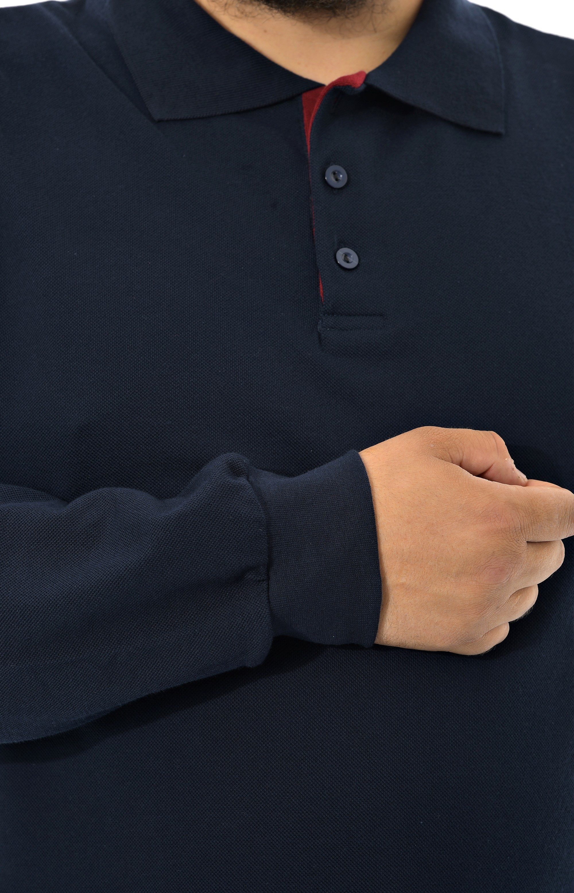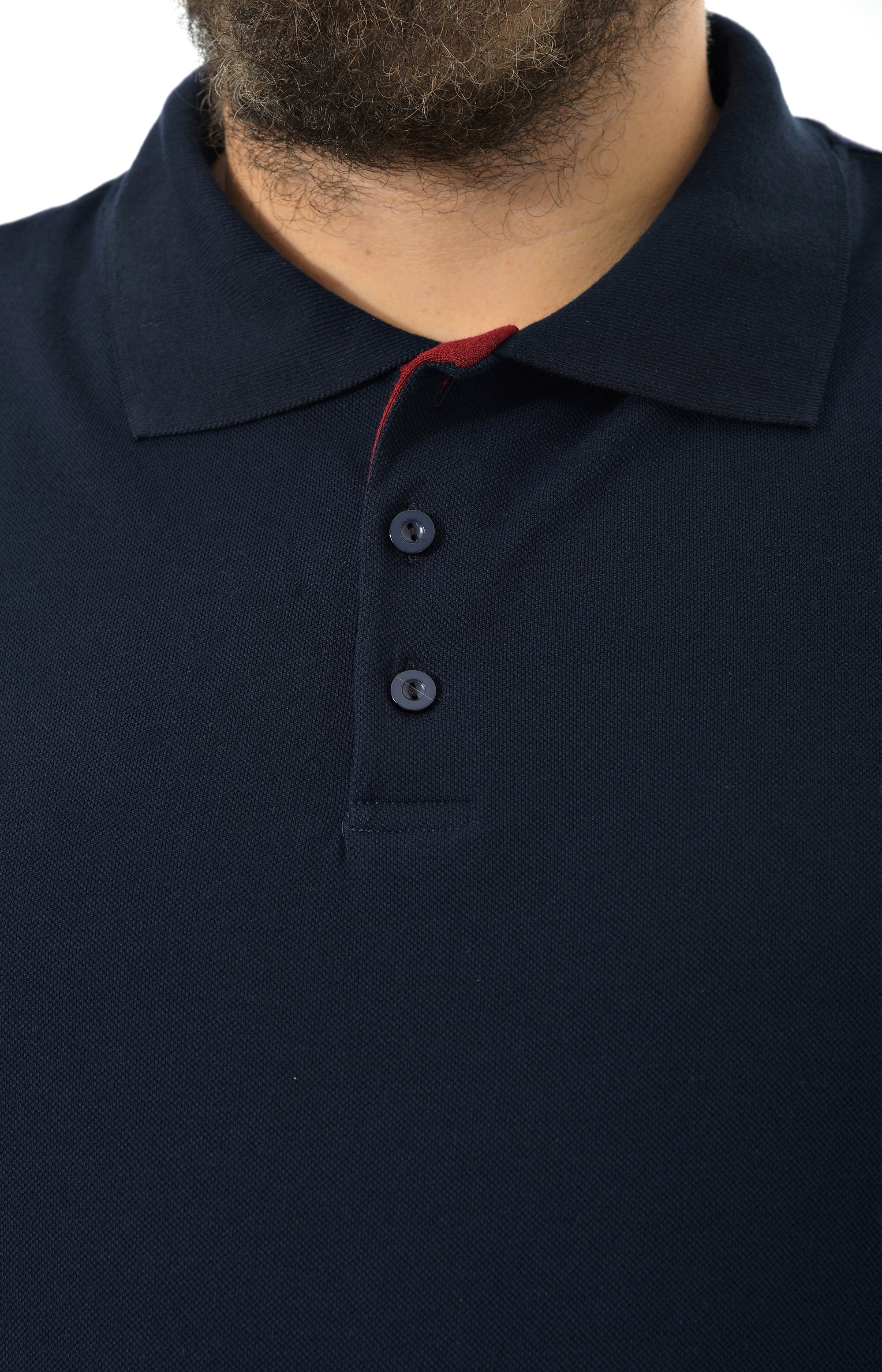 Мужская тенниска поло синего цвета с бордовой отделкой на кармане и планке воротника. Застежка на пуговицы. Ткань пике "лакоста". Низ изделия на резинке