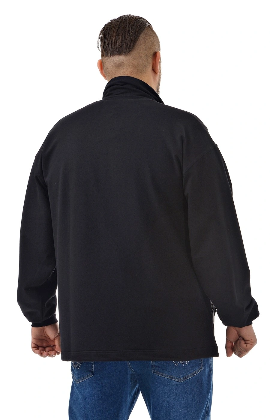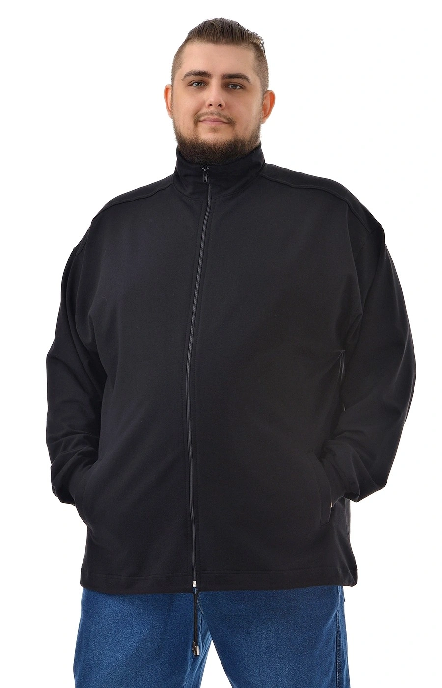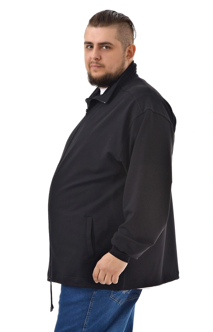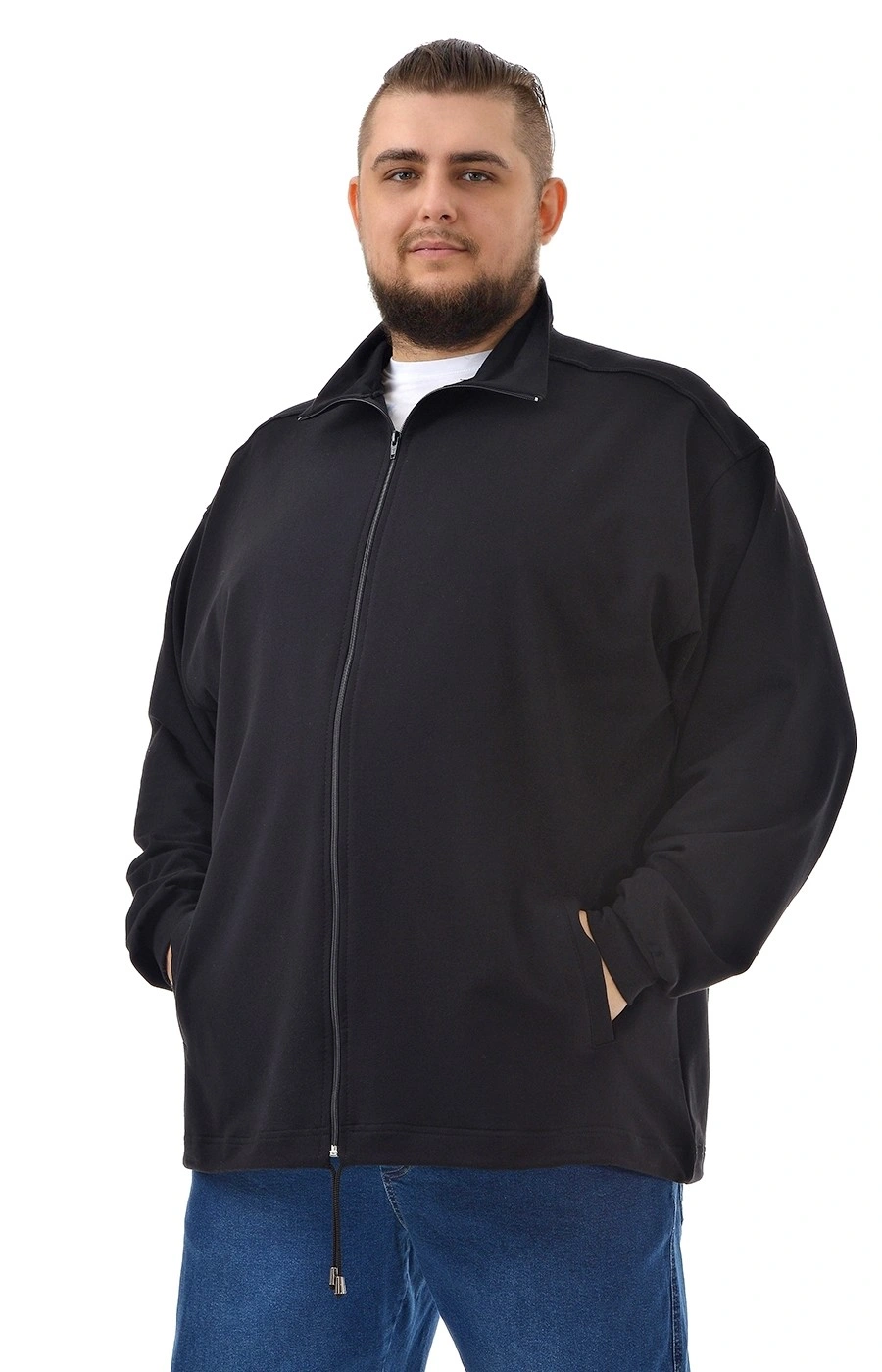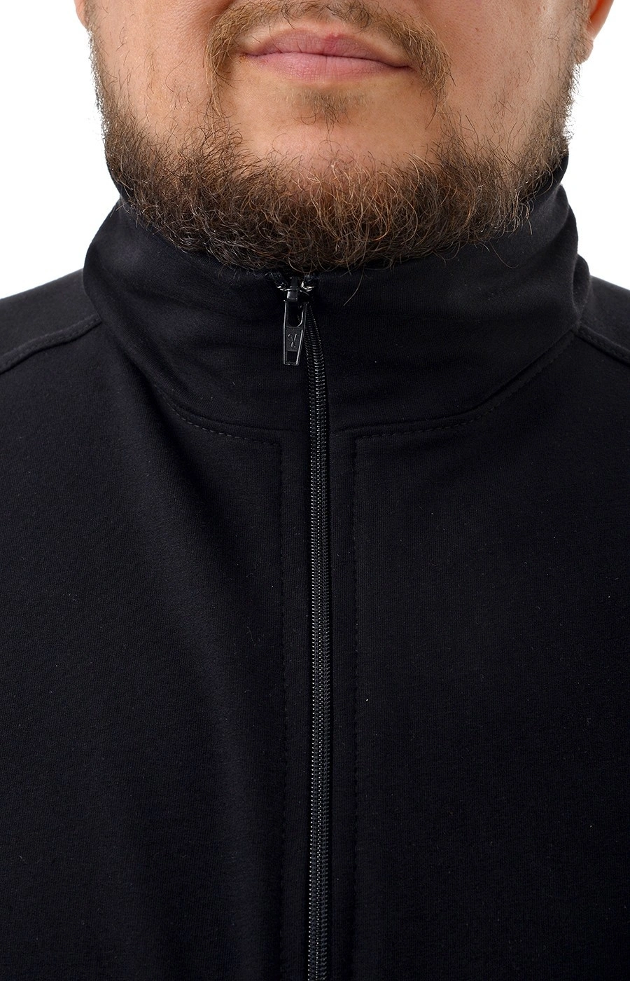 Тонкая мужская олимпийка прямого кроя черного цвета. Модель выполнена из трикотажного полотна с гладкой поверхностью из смеси хлопка 65%, полиэстера 30%, 5% эластана. При этом ткань прочная и износостойкая, не садится и не линяет после стирки. Центральная застёжка на молнию. Рукава изделия на трикотажной резинке. Дополняют образ два вместительных боковых кармана.