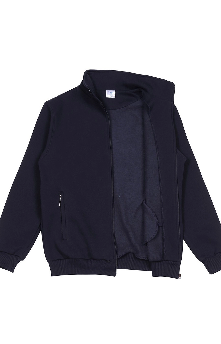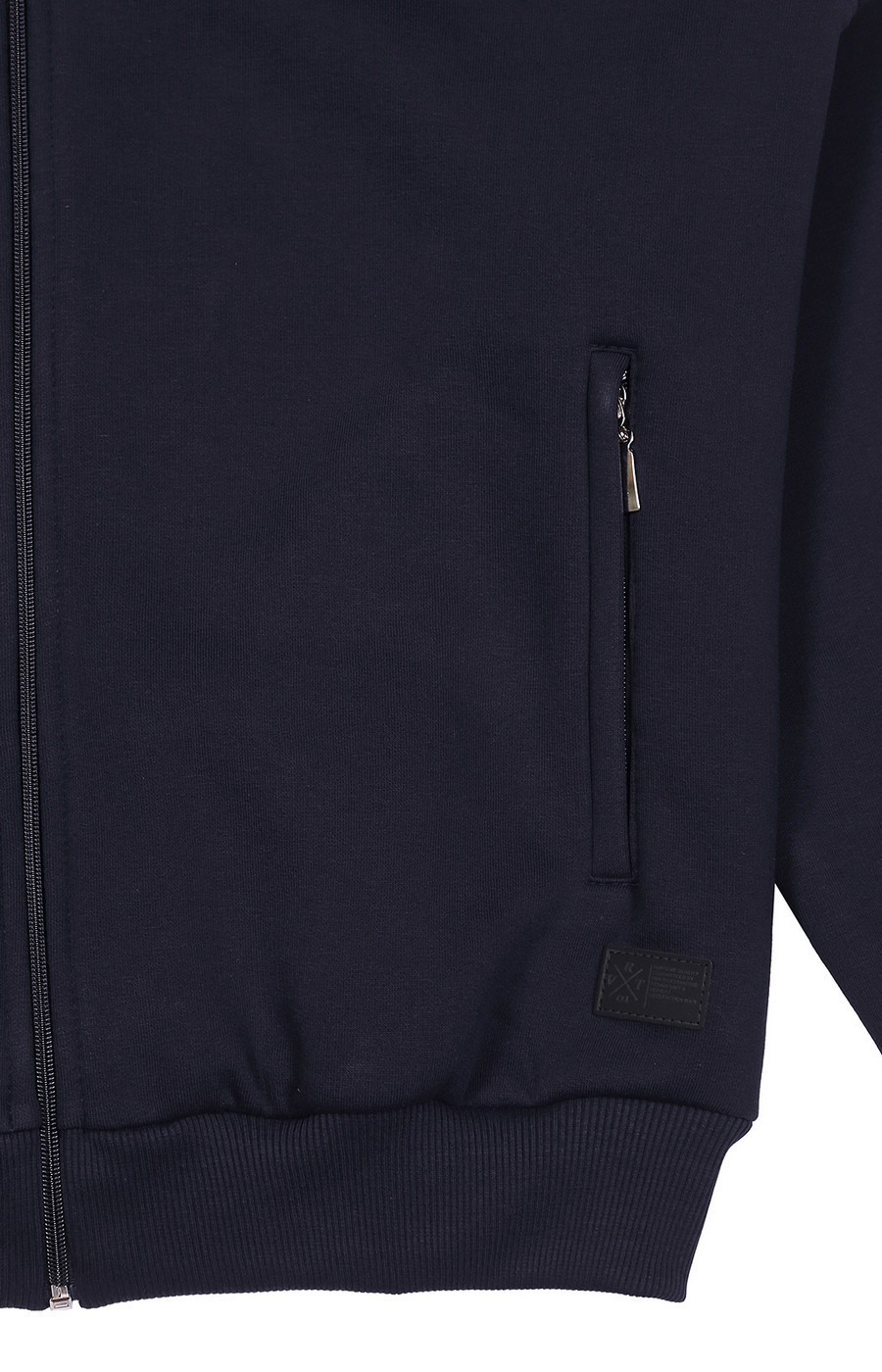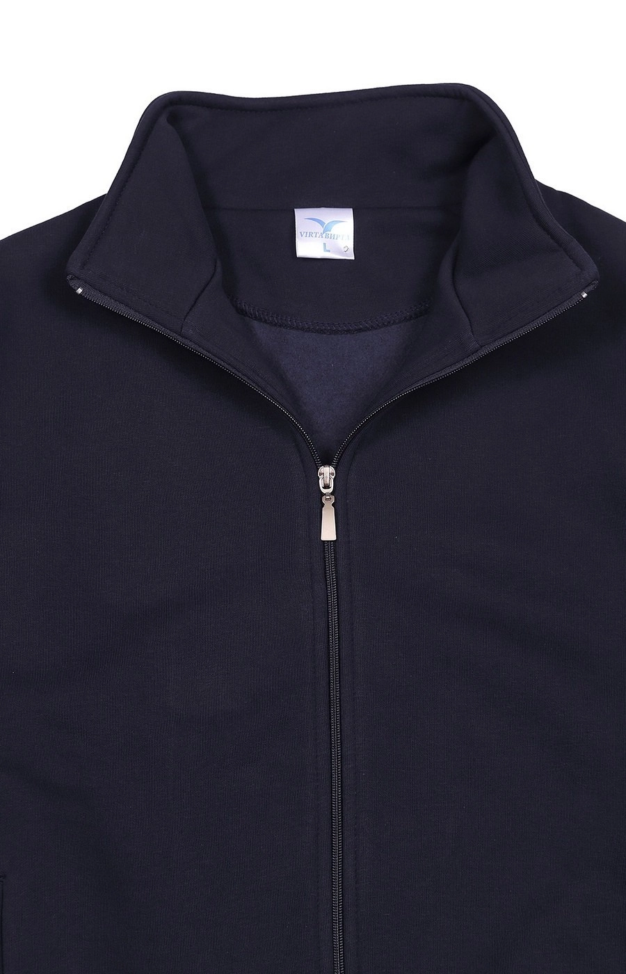 Темно синяя олимпийка на молнии. Ворот - стойка. Два прорезных кармана. Небольшая нашивка коричневого цвета с логотипом.