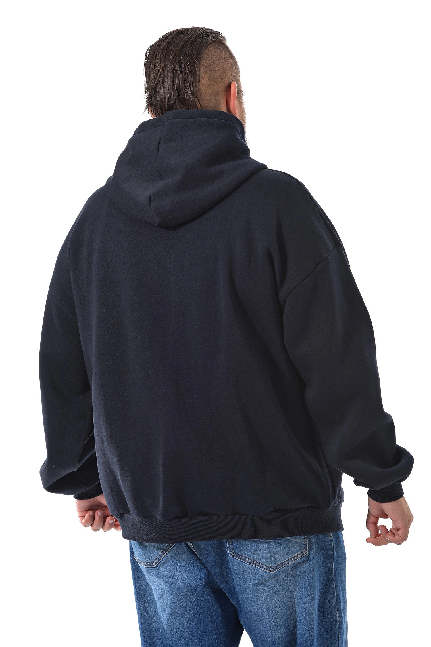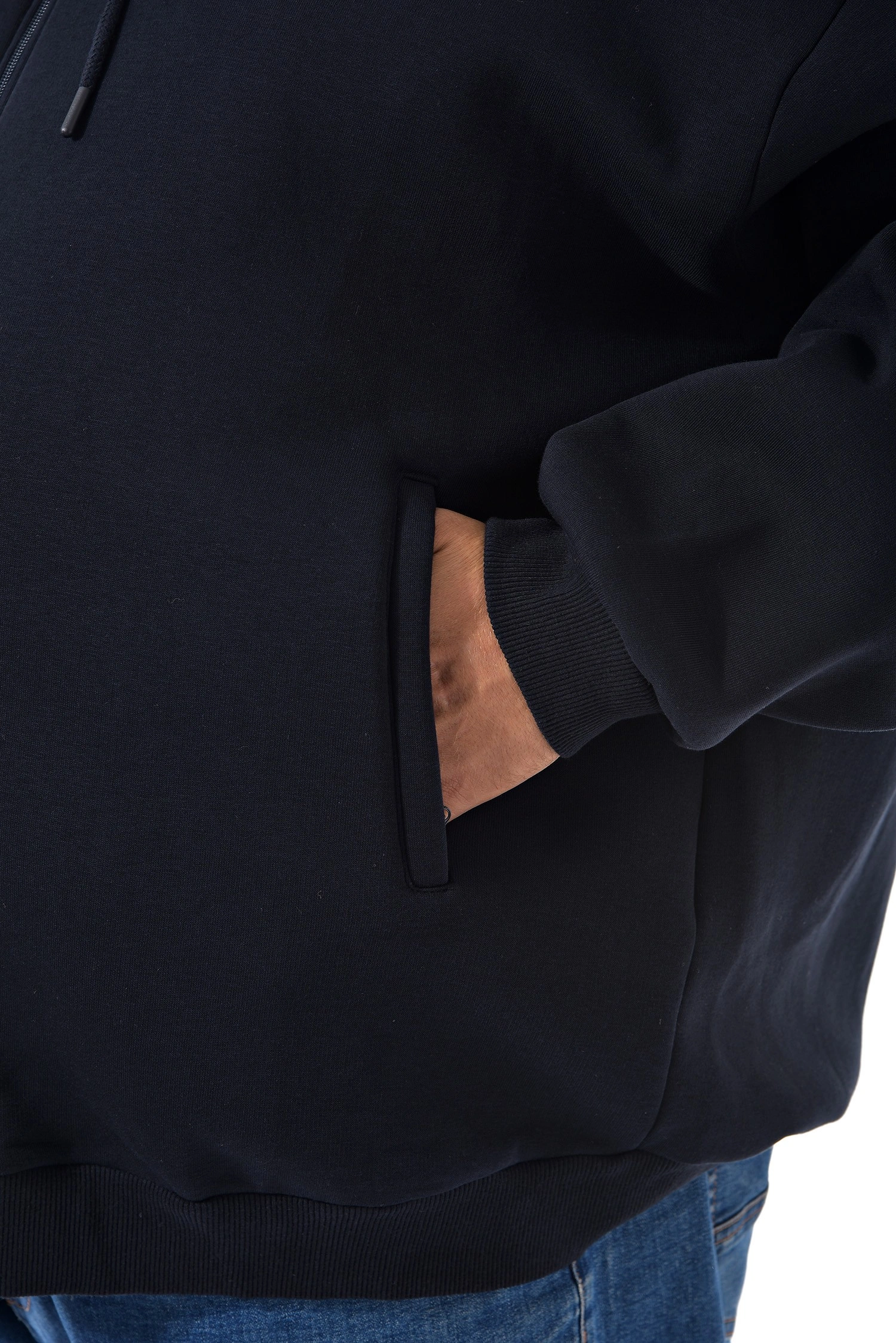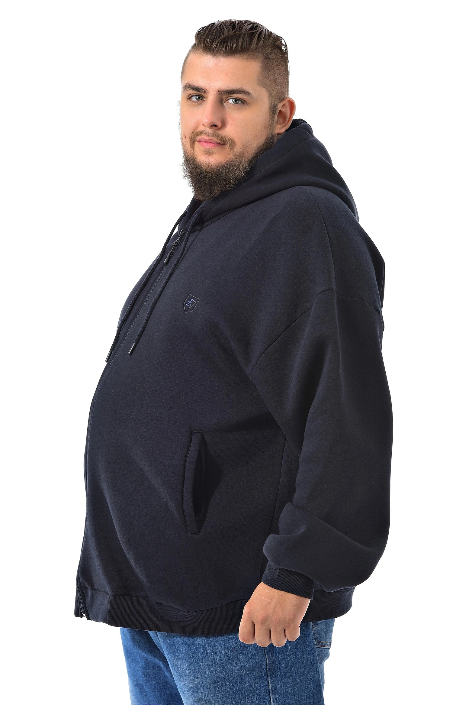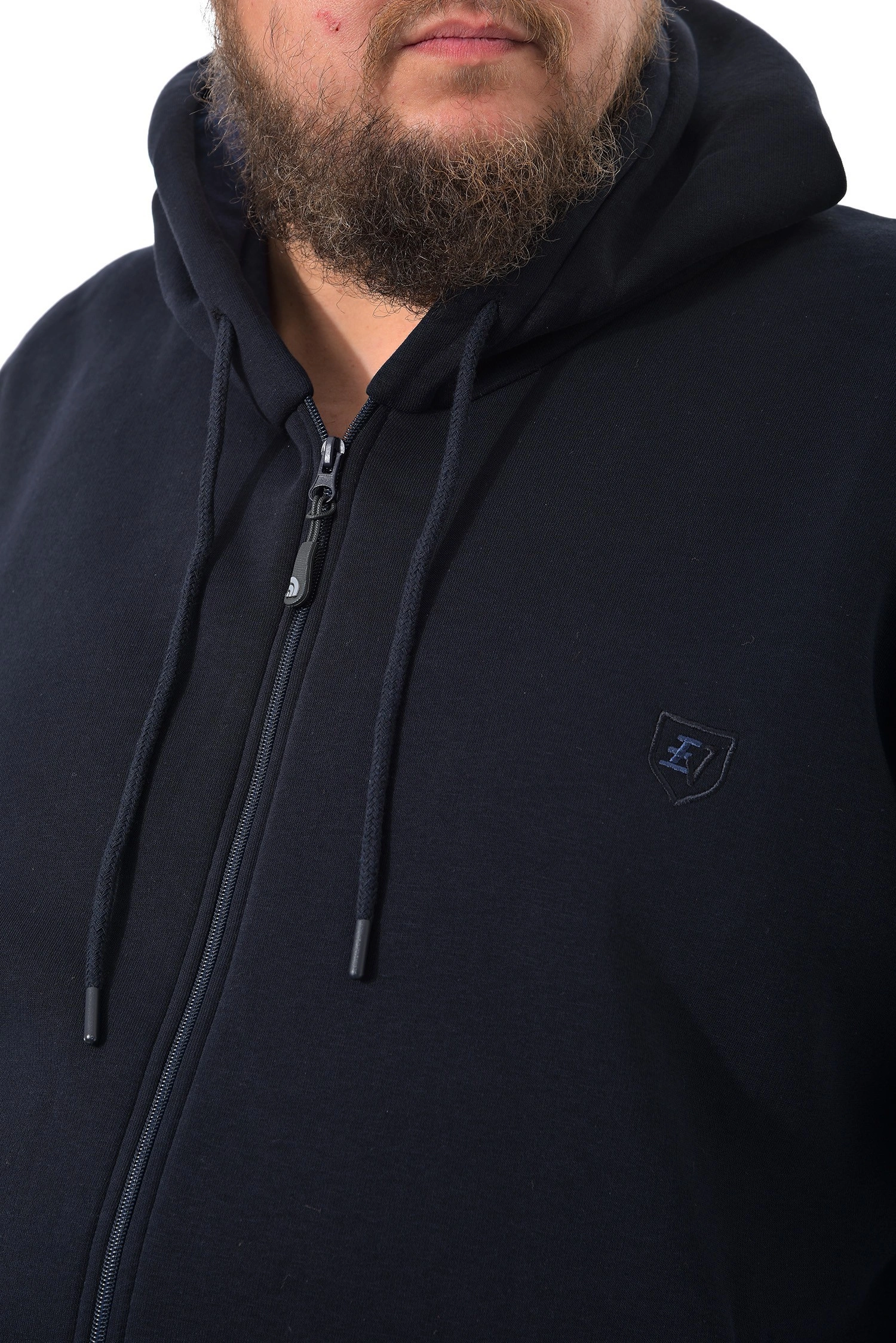 Мужская темно-синяя толстовка с капюшоном. Центральная застежка на молнию. Небольшая вышивка логотипа на груди.