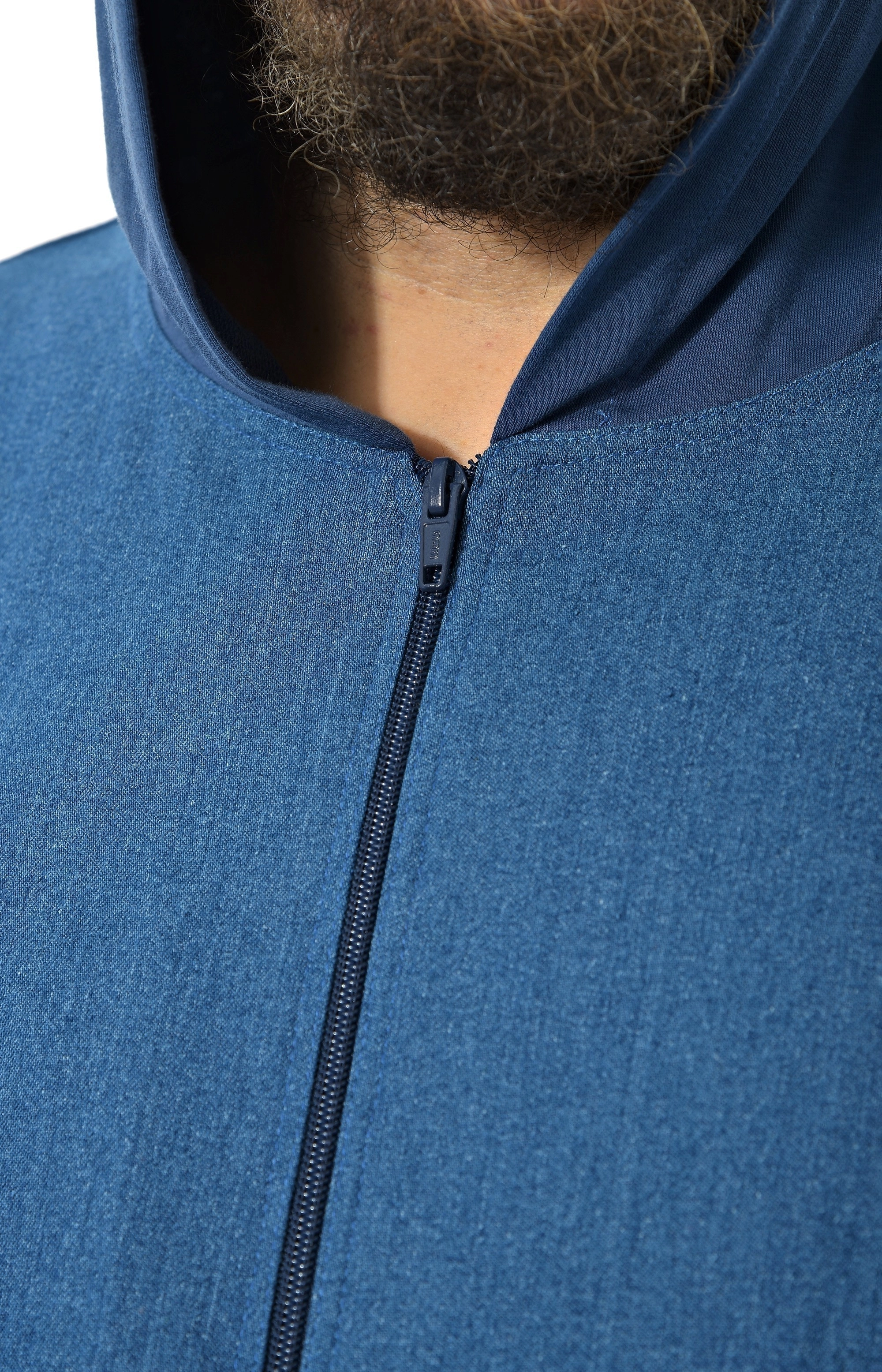 Комбинированная мужская толстовка из джинсы. Без подкладки, капюшон не съёмный с утяжкой по краю. Толстовка с двумя прорезными карманами. Рукава и низ изделия на трикотажной резинке. Толстовка мужская на сегодня является одним из самых популярных предметов одежды. Идеально подходит к любым штанам, джинсам и спортивной одежде.