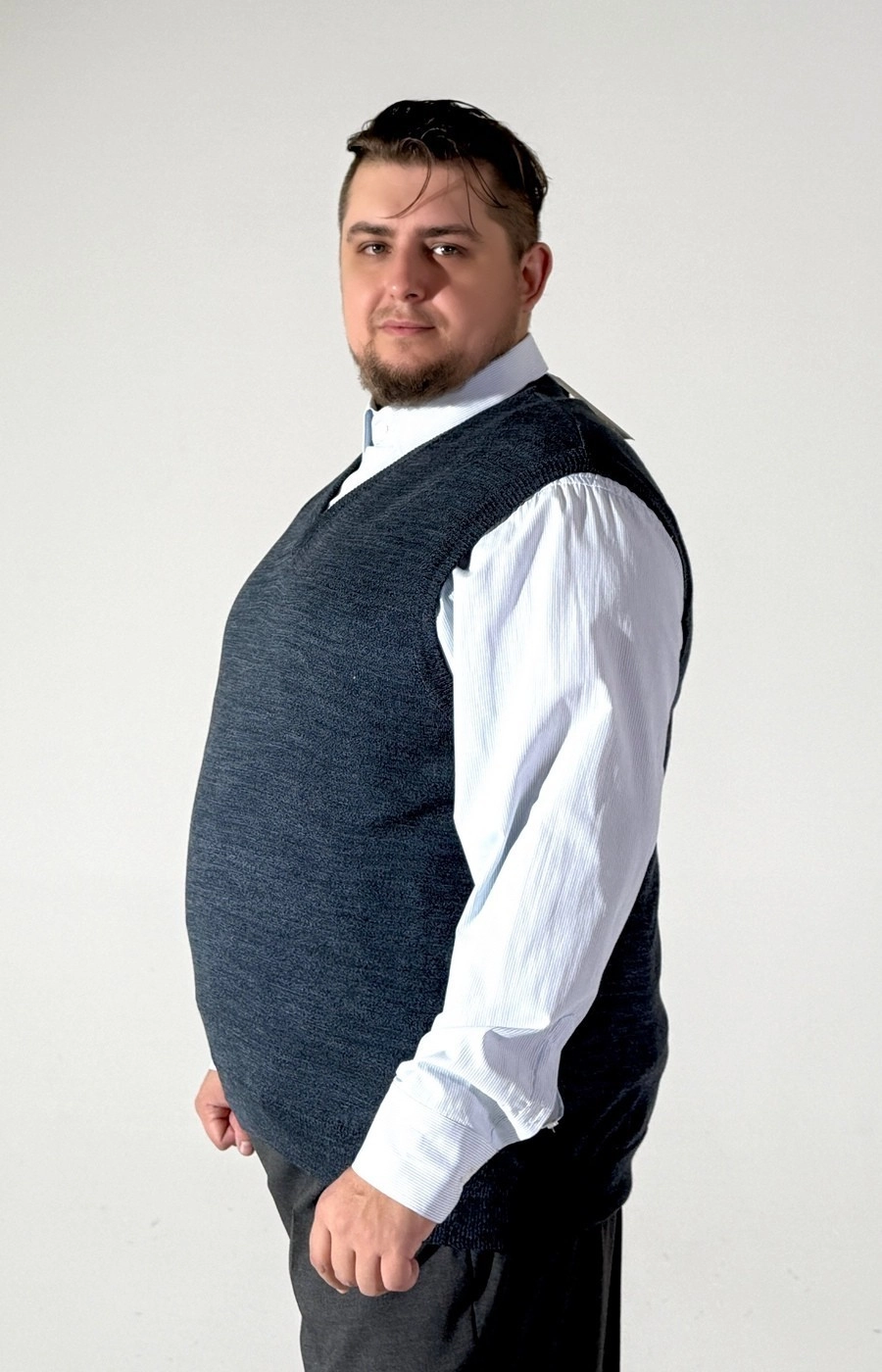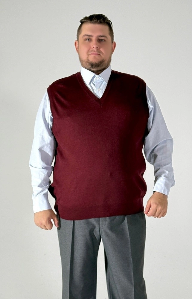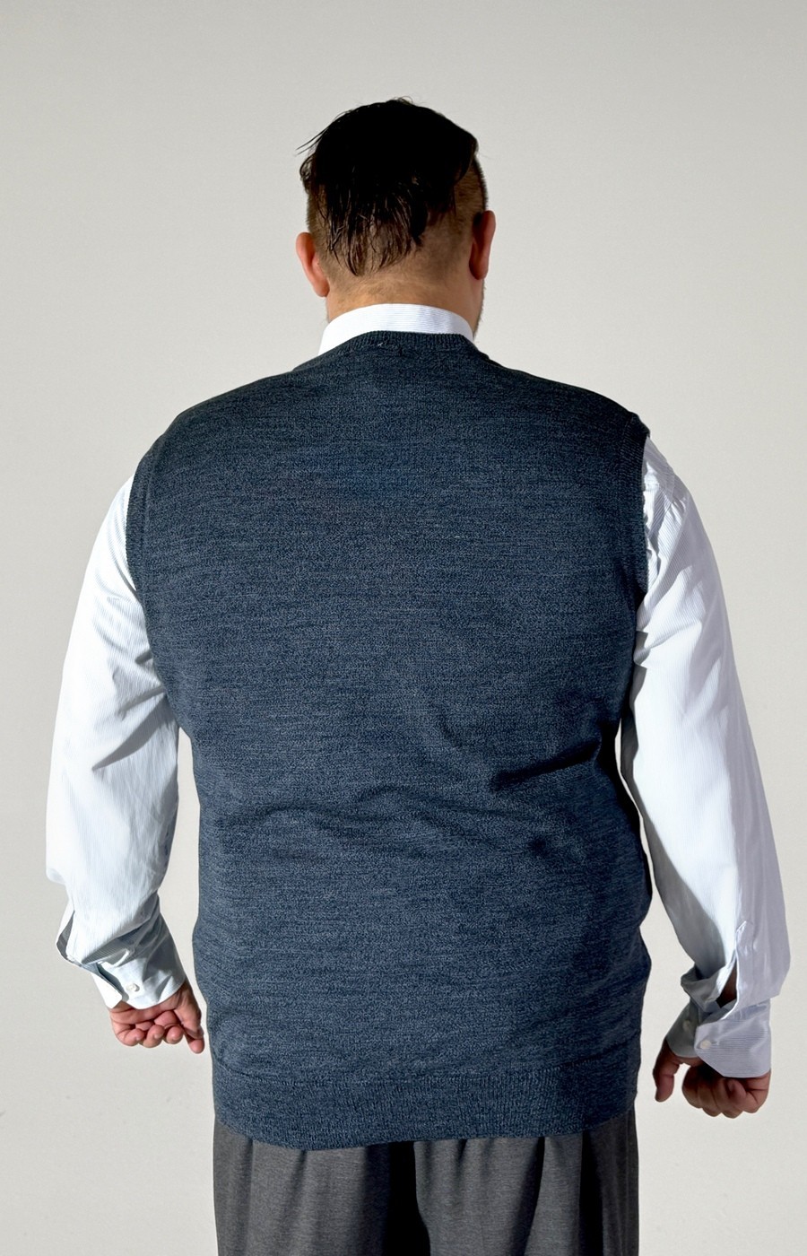 Трикотажный вязаный жилет синего цвета с вырезом уголком