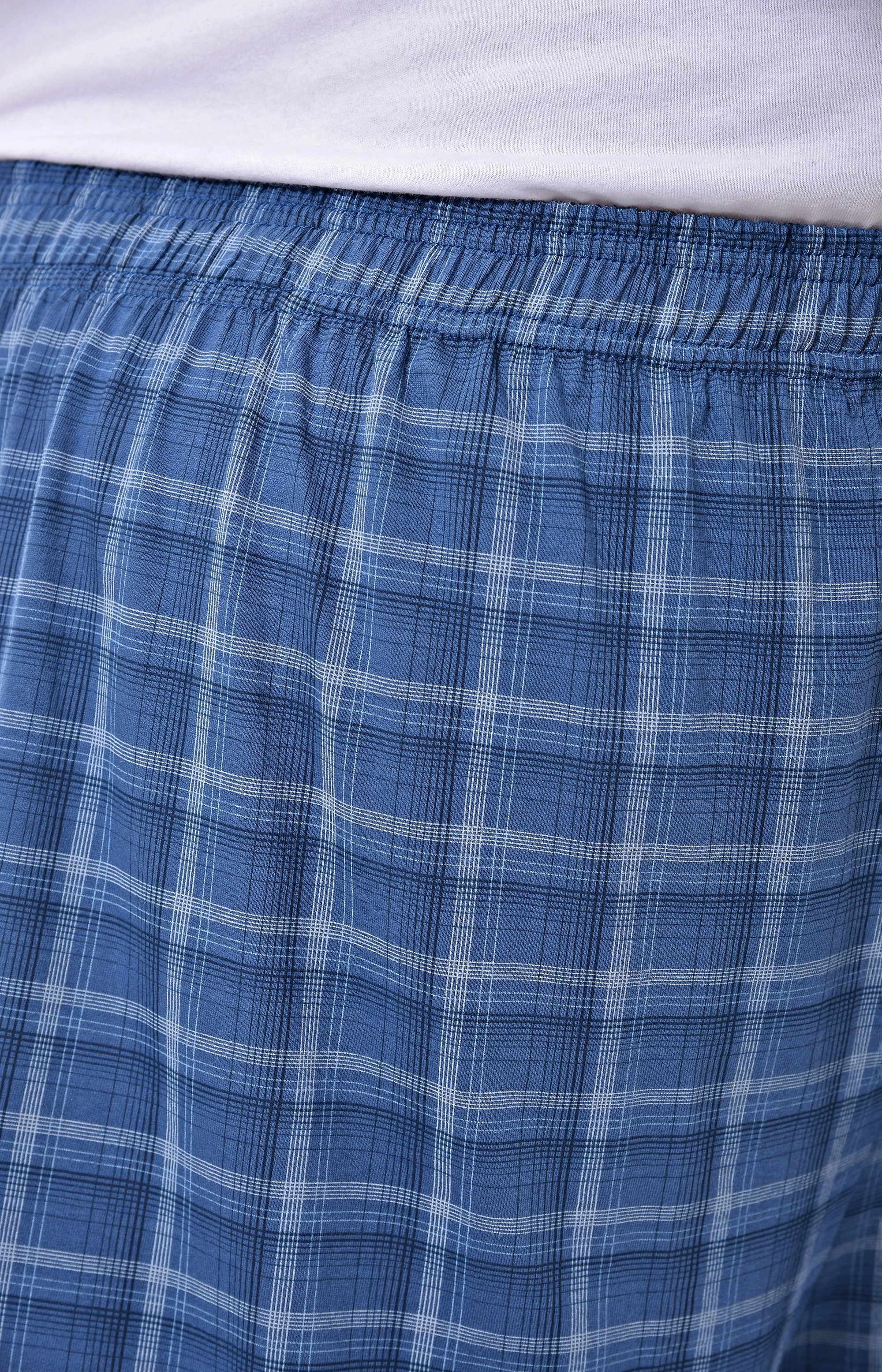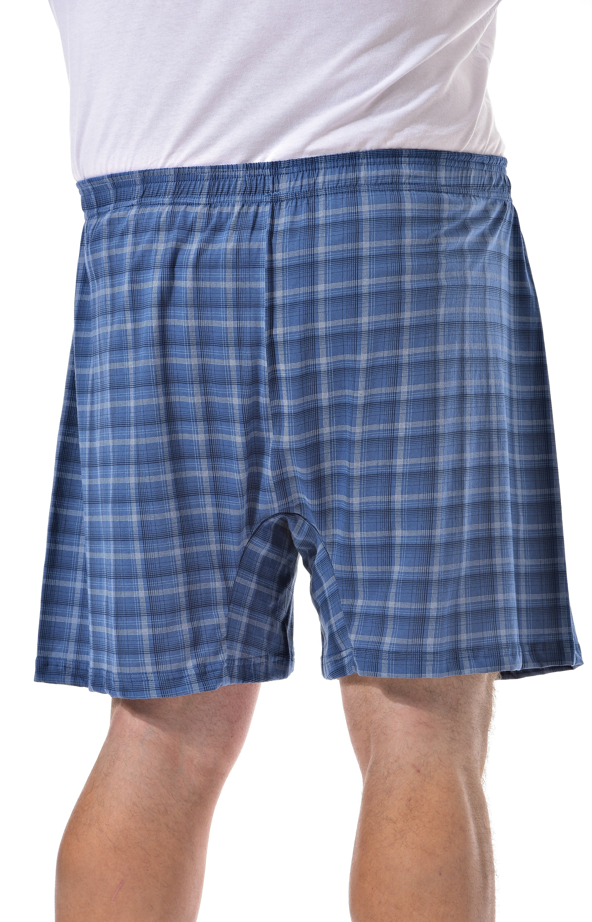 Мужские трусы шорты синего цвета в клетку. Базовая модель из хлопкового полотна. На полной резинке без застежек.