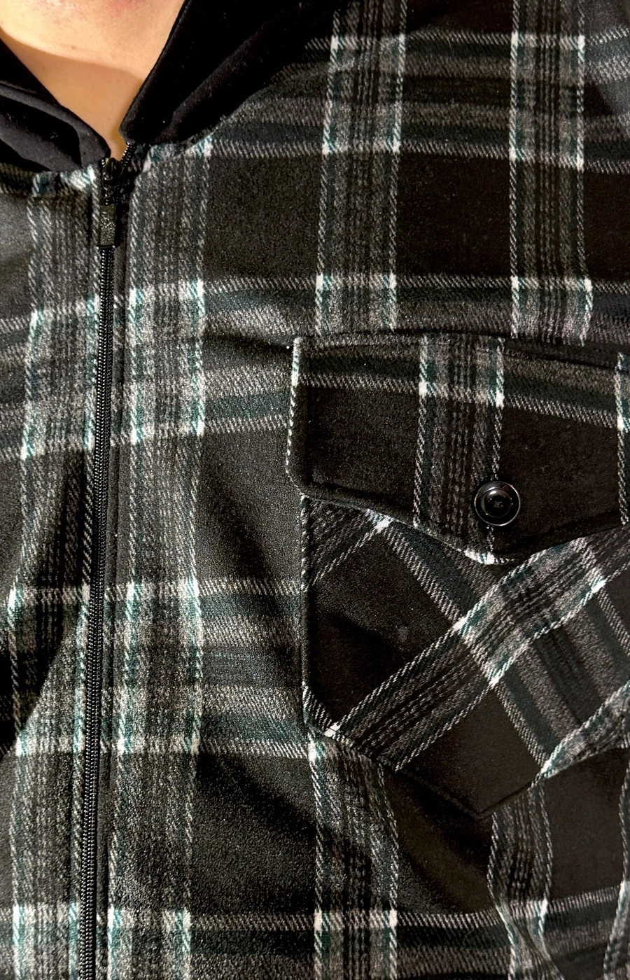 Мужская ветровка - рубашка в клетку, без подкладки прямого кроя. Два накладных кармана на груди, застёгивающиеся на пуговицу. Плотные манжеты на рукавах с застёжкой на пуговицах. Капюшон несъёмный. Материал рубашки легко стирать. Стильная ветровка рубашечного стиля прекрасно сочетается с одеждой из базового гардероба.
