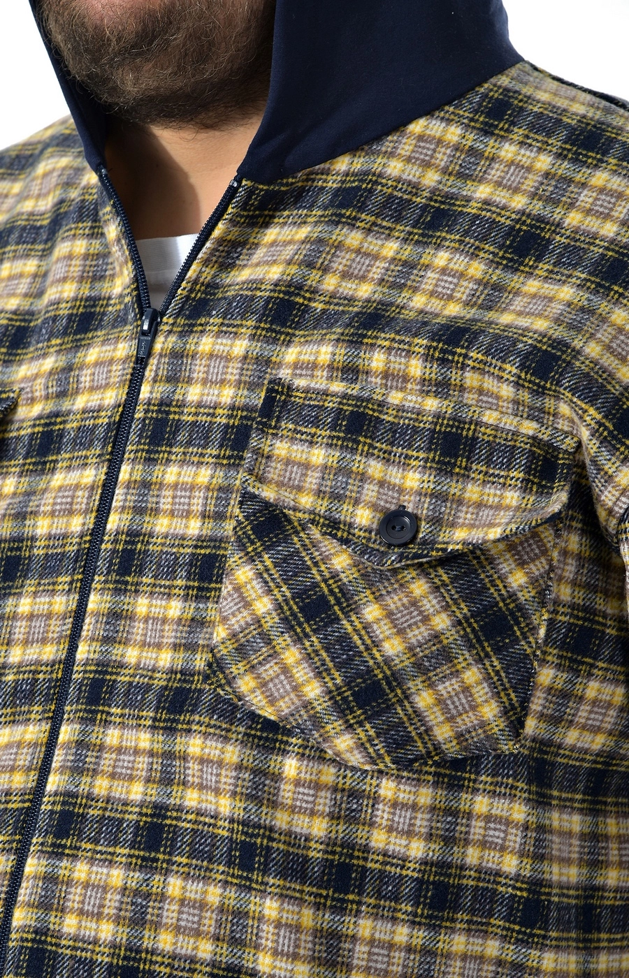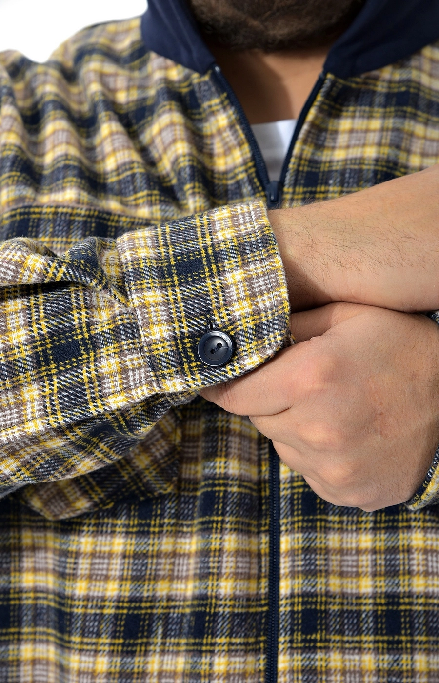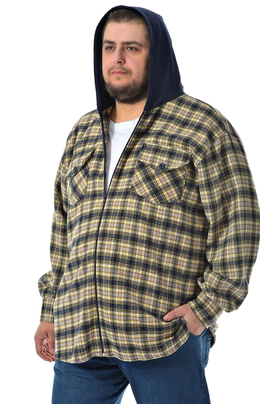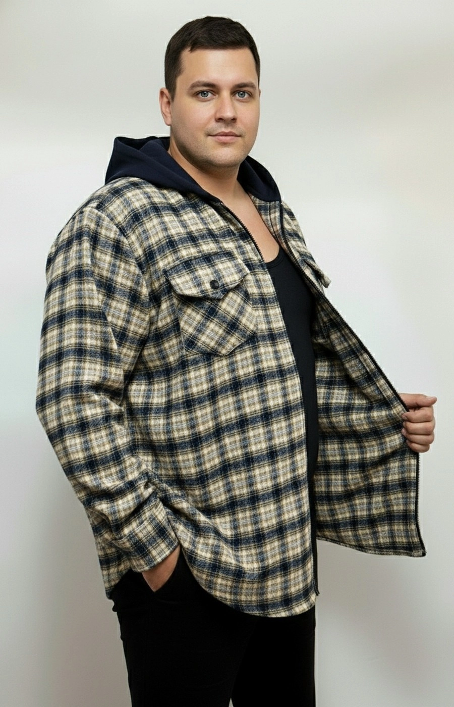 Мужская рубашка-ветровка бежево-синяя в крупную клетку с прямым свободным кроем и удобной молнией по центру создает собранный повседневный образ для города и отдыха. Объемный капюшон темно-синего цвета с кулиской подчеркивает спортивный характер модели и дополняет базовую круглую горловину. Длина до линии бедра по кадру и комфортная посадка не стесняют движений и позволяют надевать рубашку поверх футболки или легкого свитшота. На груди видны накладные клапаны на пуговицах, поддерживающие лаконичный, но практичный дизайн, а длинные рукава формируют цельный уличный стиль. Подскажем размер и посадку по вашим параметрам и организуем доставку удобным для вас способом, чтобы покупка прошла спокойно и без лишних хлопот.