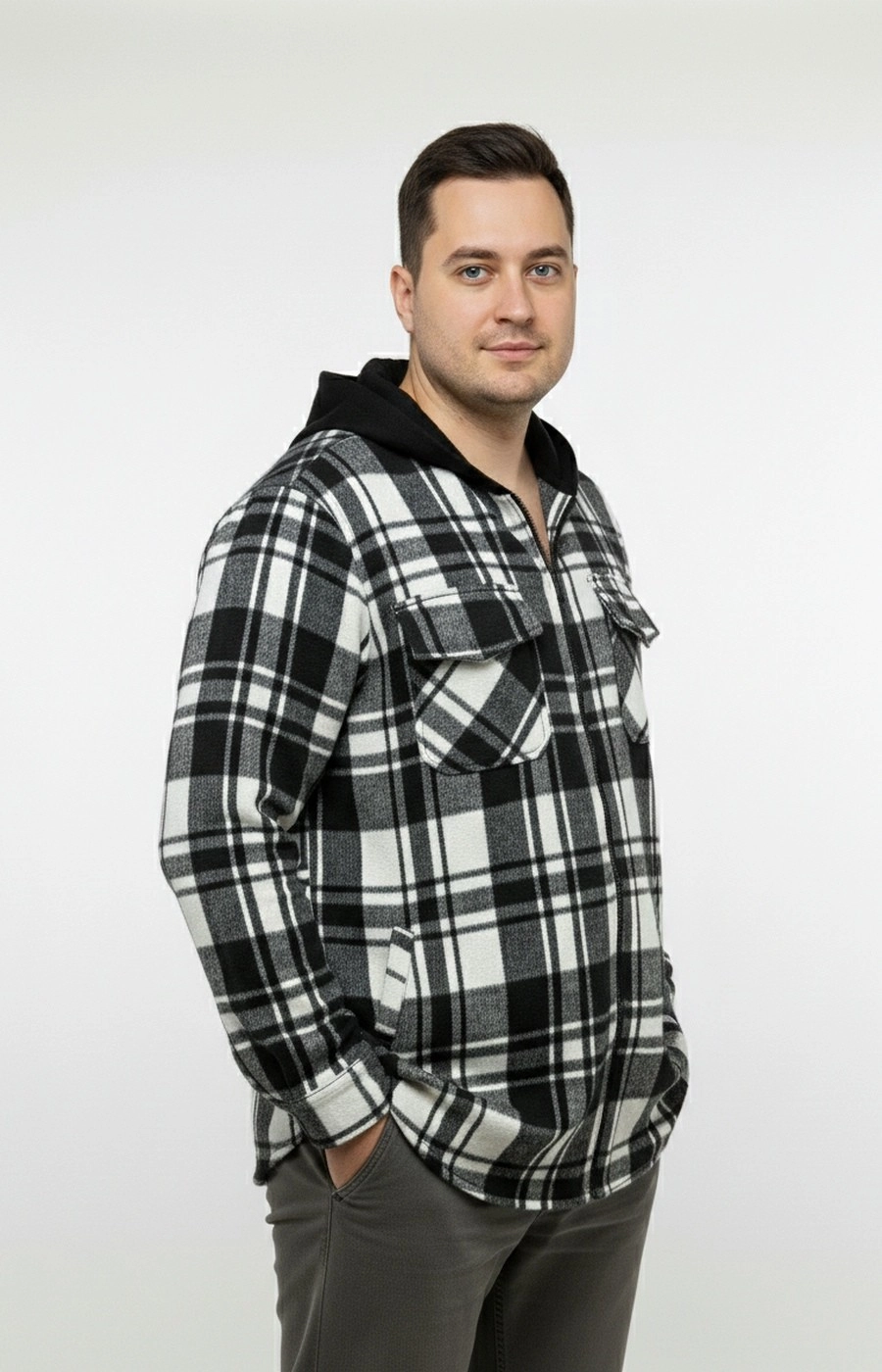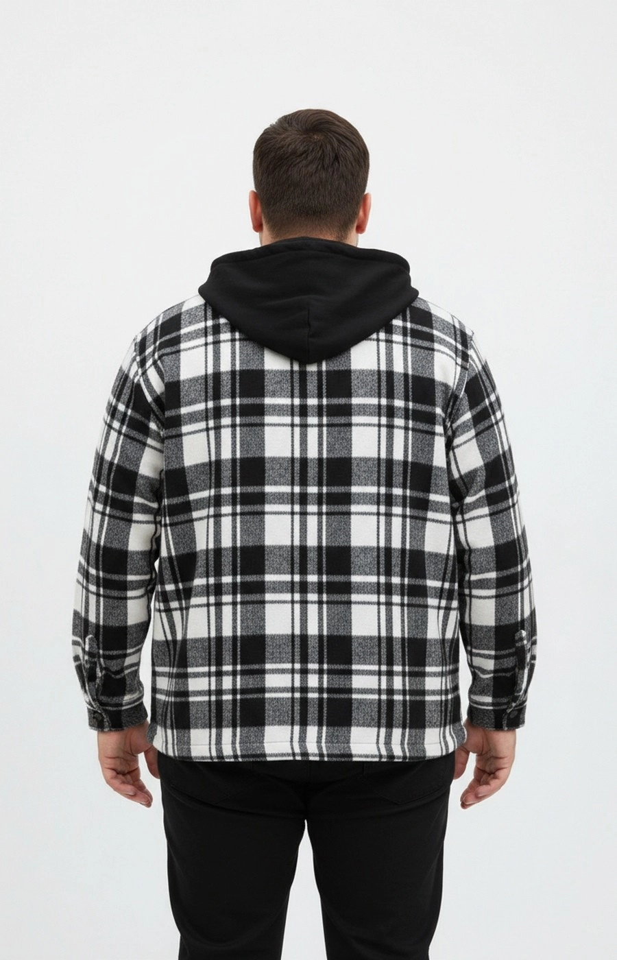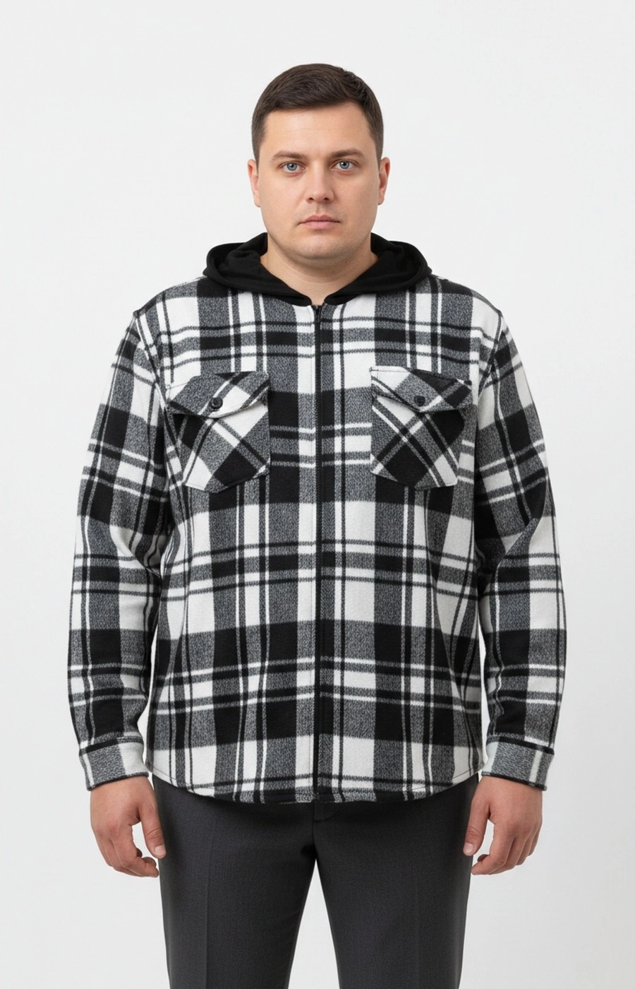 Мужская рубашка ветровка черно белая в крупную клетку с прямым свободным кроем обеспечивает комфортную посадку и не стесняет движений в повседневных образах. Контрастный черно-белый рисунок создает аккуратный, собранный вид, а объемный капюшон добавляет практичности и подчеркивает уличный стиль. Застежка на пуговицы по всей длине позволяет носить модель как верхний слой поверх футболки или худи, а удлиненная линия до бедра по кадру делает вещь удобной для города и отдыха. Накладные нагрудные клапаны и классические манжеты поддерживают лаконичный, но выразительный дизайн. Если нужны подсказки по размеру и посадке, расскажем о вариантах и организуем доставку удобным именно вам способом.