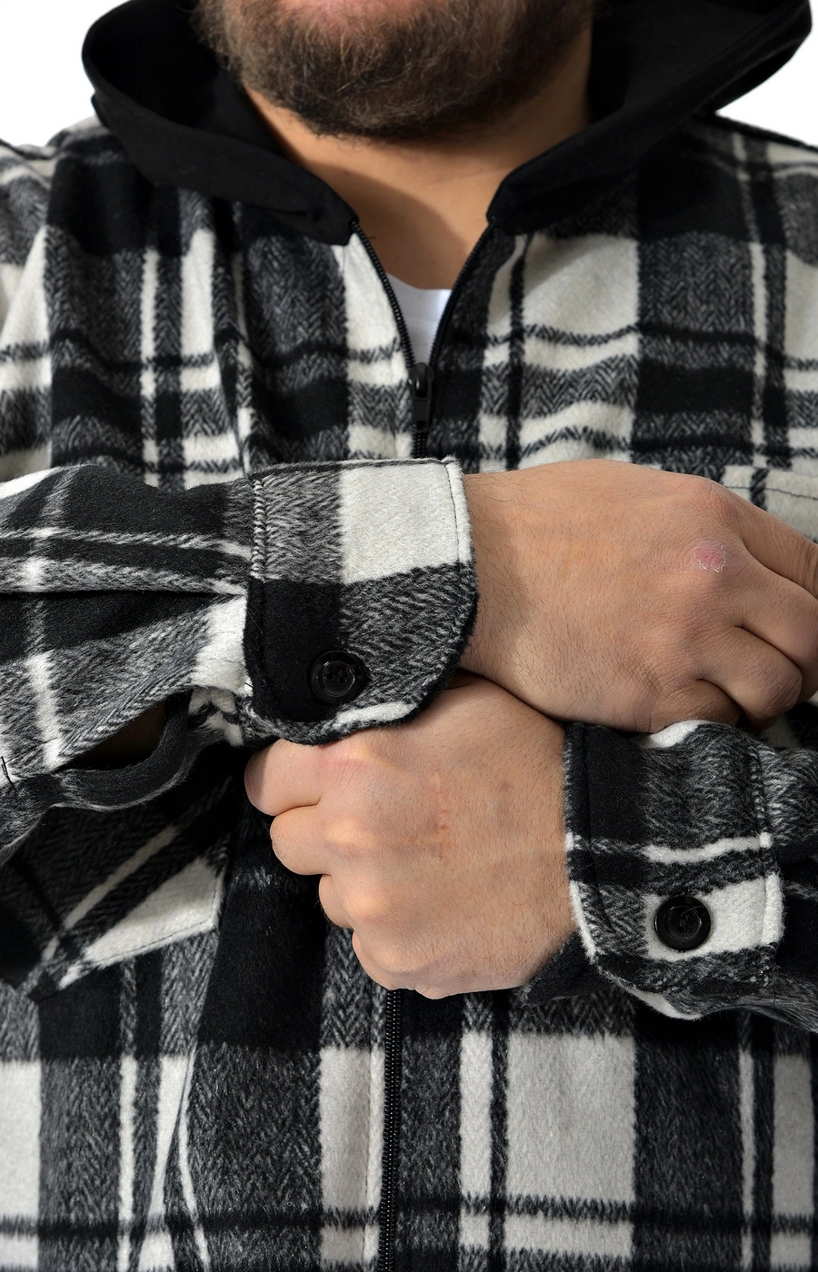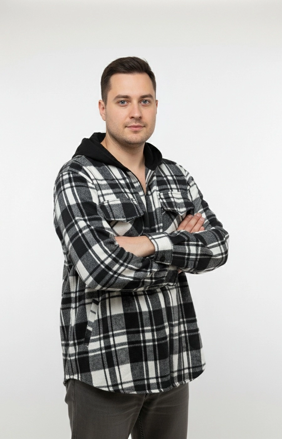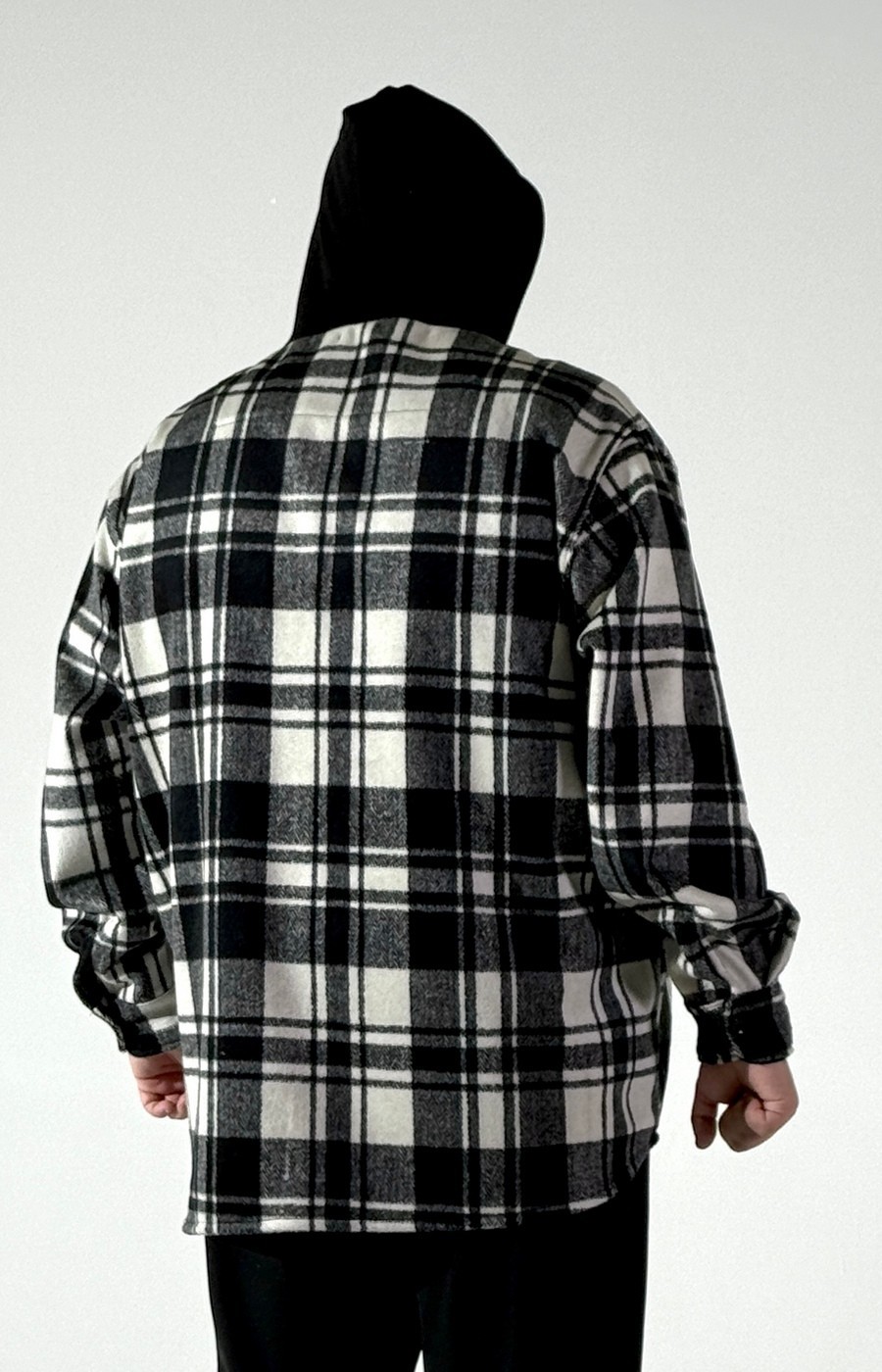Мужская рубашка ветровка черно белая в крупную клетку с прямым свободным кроем обеспечивает комфортную посадку и не стесняет движений в повседневных образах. Контрастный черно-белый рисунок создает аккуратный, собранный вид, а объемный капюшон добавляет практичности и подчеркивает уличный стиль. Застежка на пуговицы по всей длине позволяет носить модель как верхний слой поверх футболки или худи, а удлиненная линия до бедра по кадру делает вещь удобной для города и отдыха. Накладные нагрудные клапаны и классические манжеты поддерживают лаконичный, но выразительный дизайн. Если нужны подсказки по размеру и посадке, расскажем о вариантах и организуем доставку удобным именно вам способом.