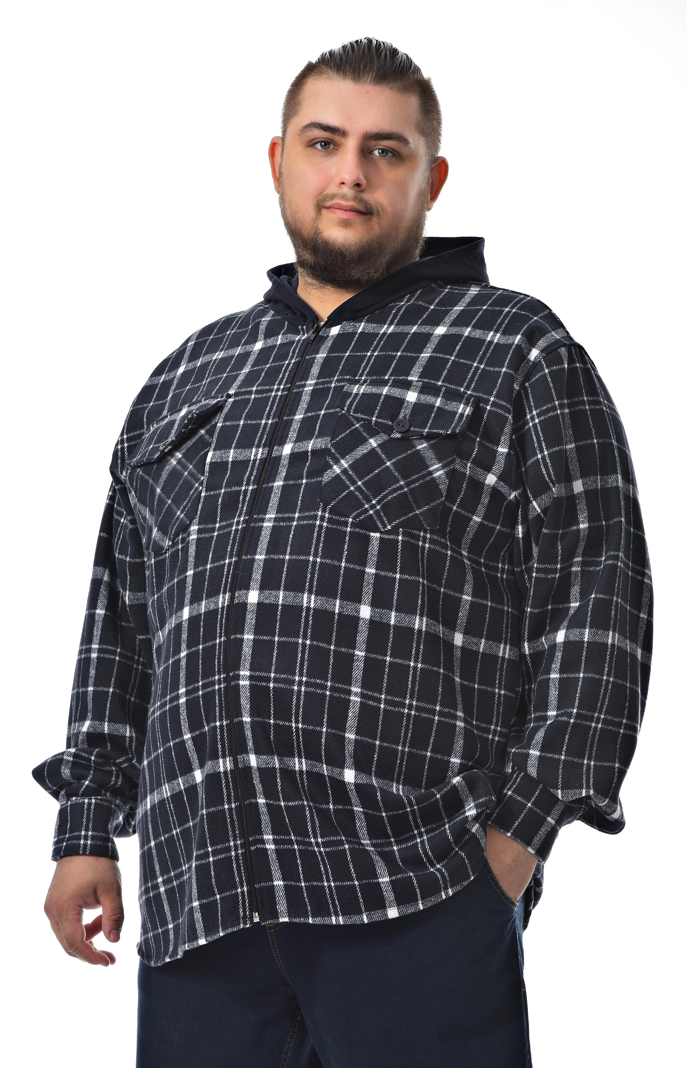 Мужская ветровка - рубашка в клетку, без подкладки, прямого кроя, тёмно синего цвета. Два накладных кармана на груди, застёгивающимися на пуговицу. Центральная застёжка на молнию. Рукав длинный втачной. Однотонный, несъёмный капюшон. Стильная ветровка рубашечного стиля прекрасно сочетается с одеждой из базового гардероба.