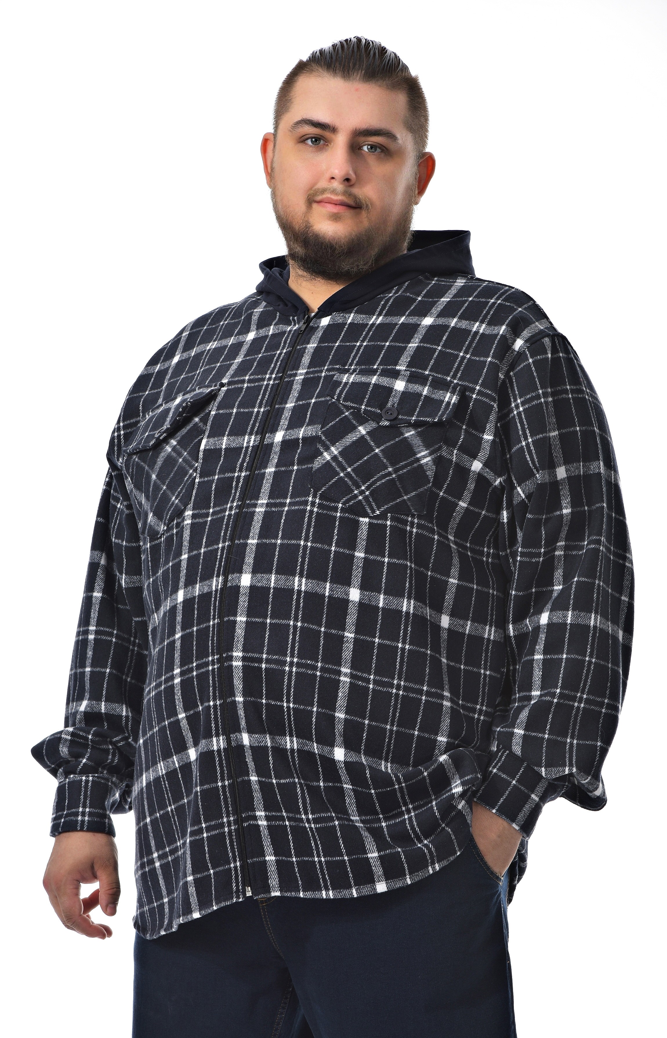 Мужская ветровка рубашка прямого свободного кроя в клетку создана для комфортной посадки и повседневных образов. Темный фон с контрастным белым и серым рисунком придает вещи лаконичный, собранный вид, уместный и для города, и для отдыха. По кадру длина до линии бедра, застежка на молнию идет по центру, обеспечивая удобную фиксацию и защищая от ветра. Ворот выполнен с капюшоном, что добавляет практичности на улице и поддерживает расслабленный, но аккуратный стиль. На груди — две нагрудные планки с клапанами на пуговицах, поддерживающие геометрию клетки и общий строгий характер модели. Рукава свободные, не стесняют движений, манжеты фиксируются на пуговицу для более собранного силуэта. Если нужны уточнения по посадке и размеру, подскажем по вашим параметрам и организуем доставку удобным для вас способом.