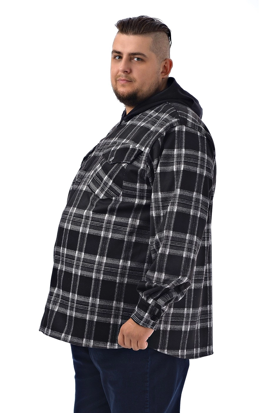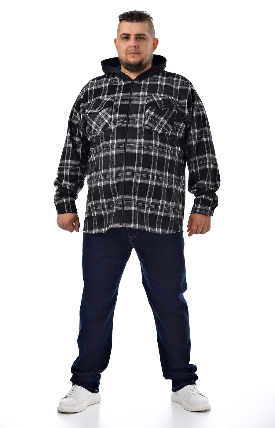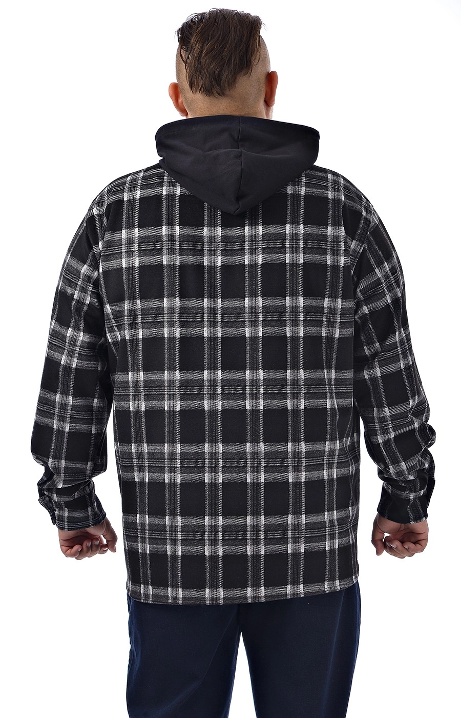 Мужская ветровка - рубашка в клетку, без подкладки, прямого кроя. Расцветка - черная в серо-белую клетку и черным капюшоном. Два накладных кармана на груди, застёгивающимися на пуговицу. Центральная застёжка на молнию. Рукав длинный втачной. Однотонный, несъёмный капюшон. Стильная ветровка рубашечного стиля прекрасно сочетается с одеждой из базового гардероба.