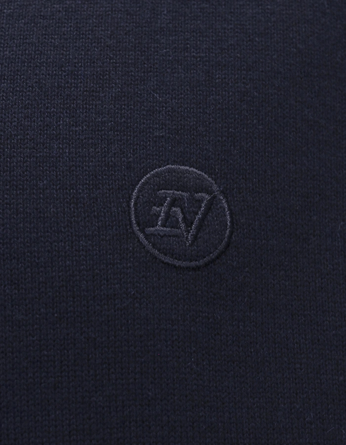 Вязанный жилет темно синего цвета с V-вырезом. Аккуратная вышитая эмблема на груди. Длина по спинке около 83 см.