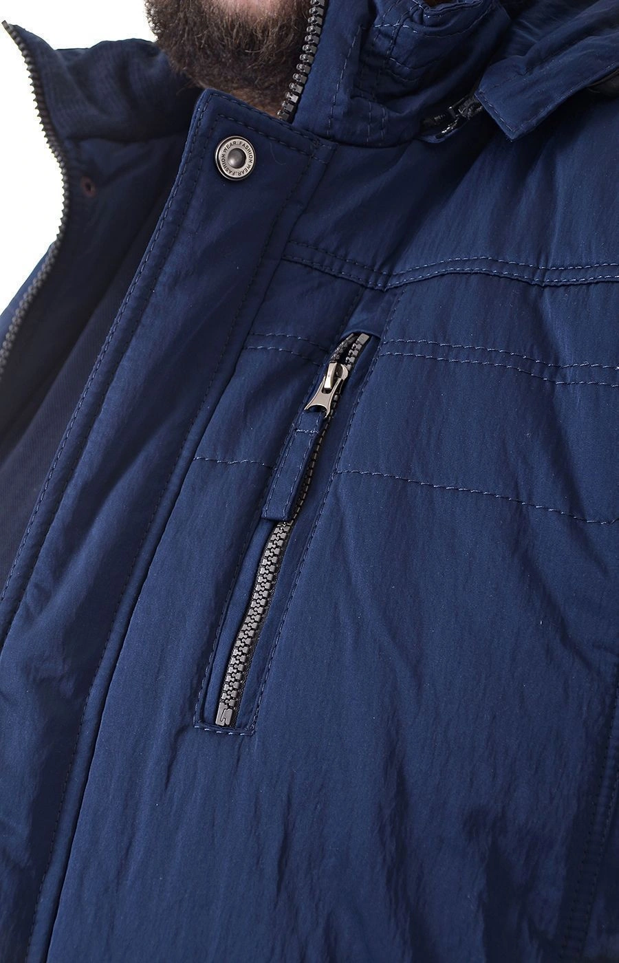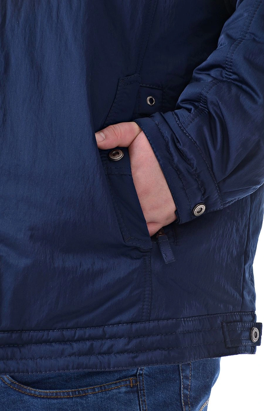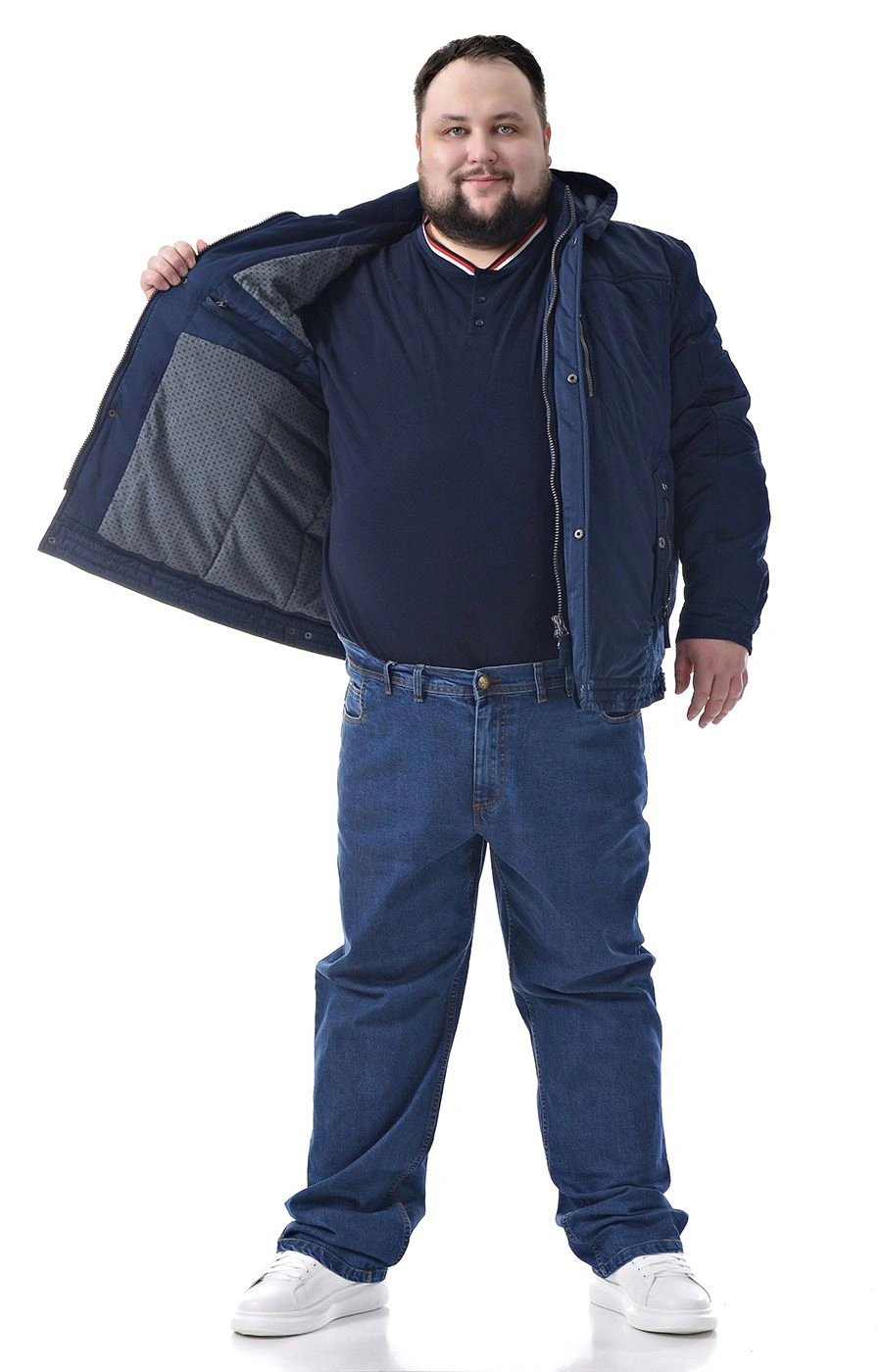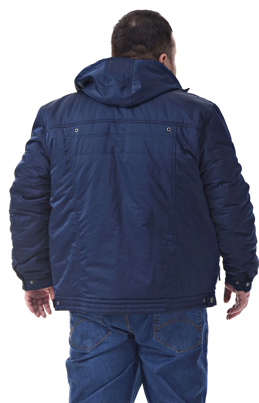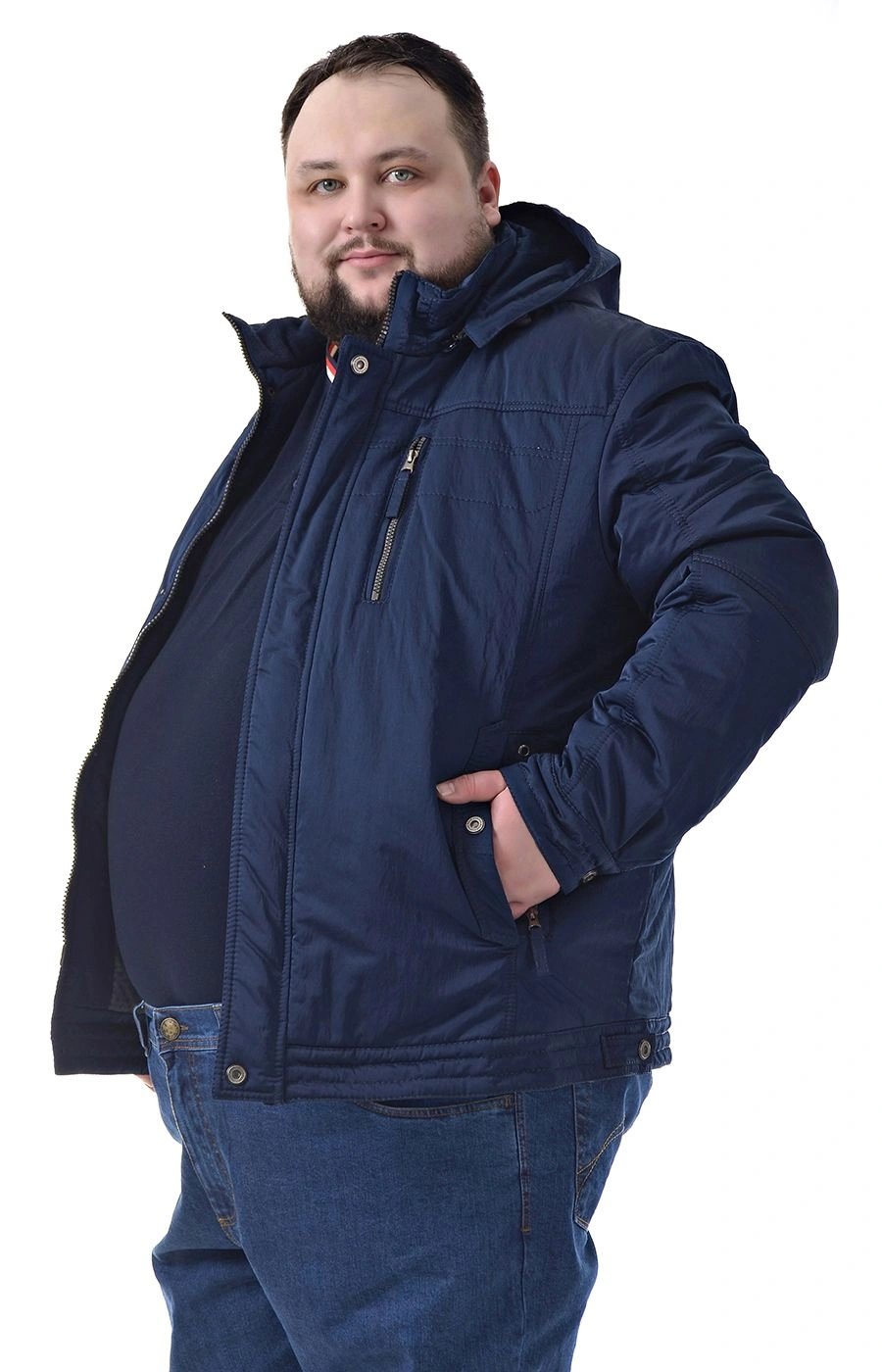 Куртка зимняя синего цвета прямого кроя, средней длины. Центральная застежка на молнию и ветрозащитную планку с кнопками. Куртка с одним нагрудным и двумя нижними двойными прорезными карманами: один на молнии, другой на кнопке. Воротник-стойка, с внутренней отделкой из трикотажа. Рукава на манжетах застегивающихся на кнопку. Капюшон съемный с утяжкой по краю. Подкладка куртки из хлопкосодержащей ткани, с двумя внутренними карманами на молнии.